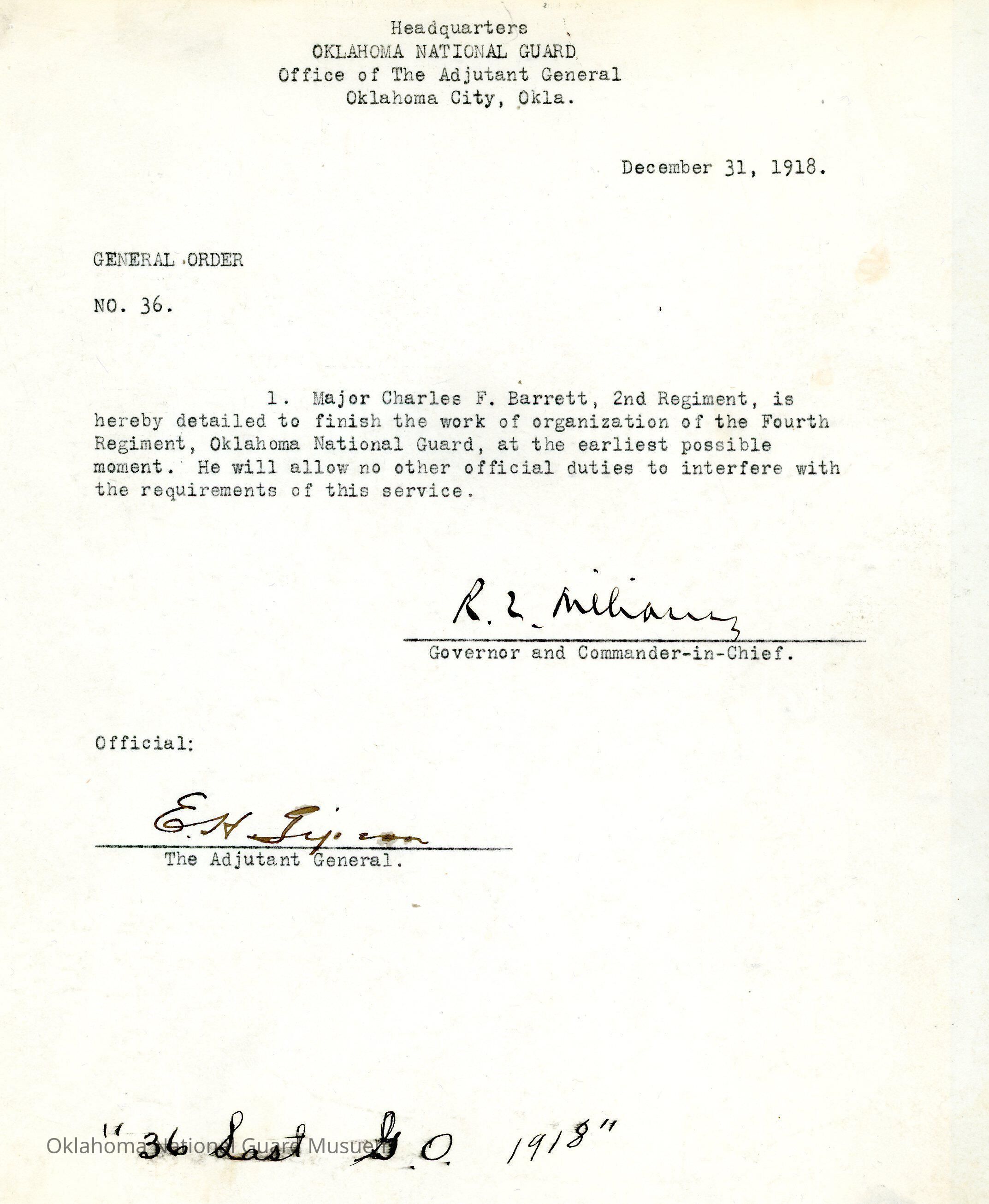 General Order #36 from Headquarters Adjutant General's Office in Oklahoma City. The order instructs Charles F. Barrett to finish organizing the Fourth Regiment as soon as possible.Date(s) of Creation