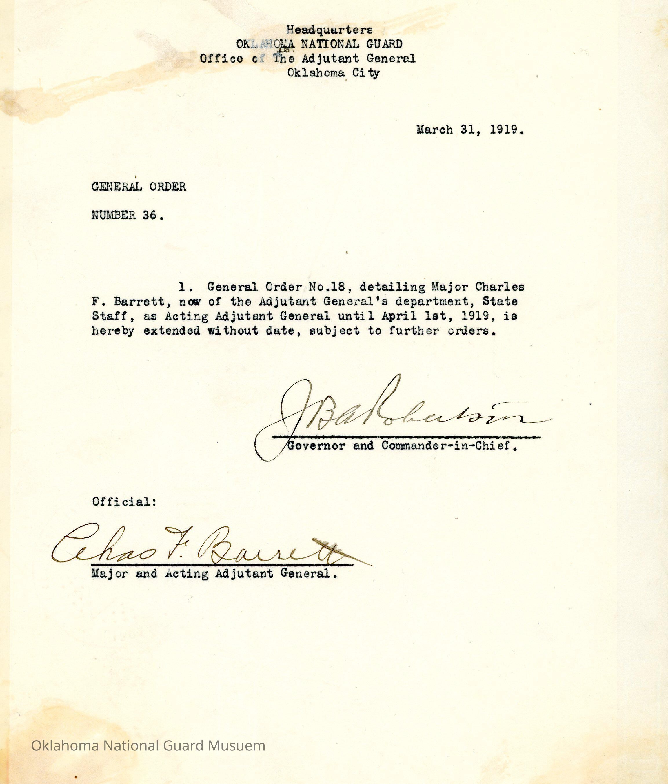 General Order #36 from Headquarters Adjutant General's Office in Oklahoma City. The order lists extends Charles F. Barrett as acting Adjutant General until further orders.Date(s) of Creation