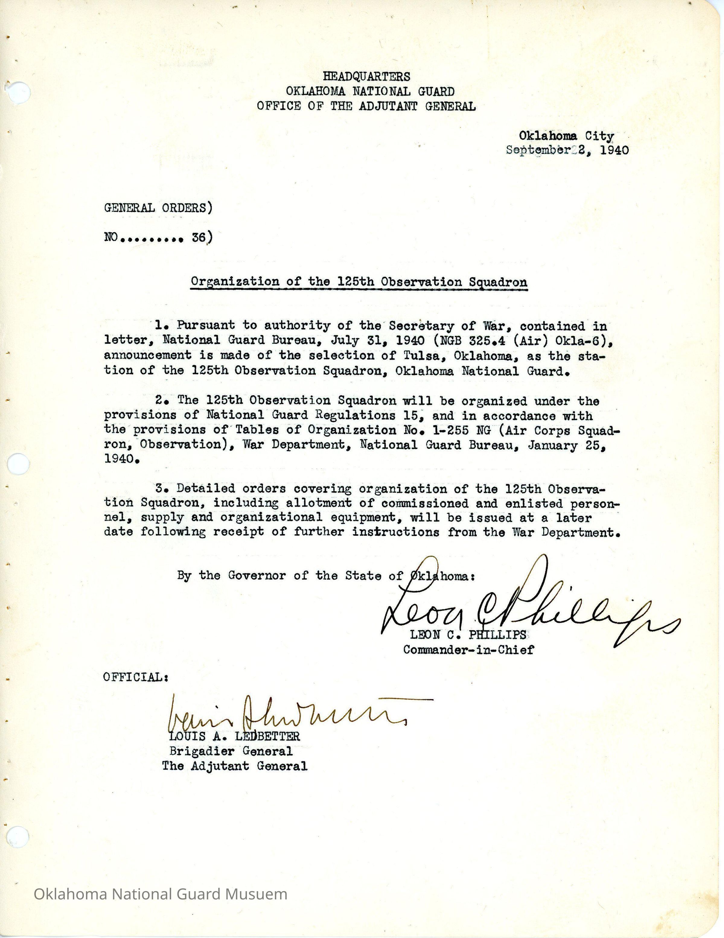 General Order #36 from Headquarters Adjutant General's Office in Oklahoma City. The order organizes the 125th Observation Squadron with station in TulsaDate(s) of Creation