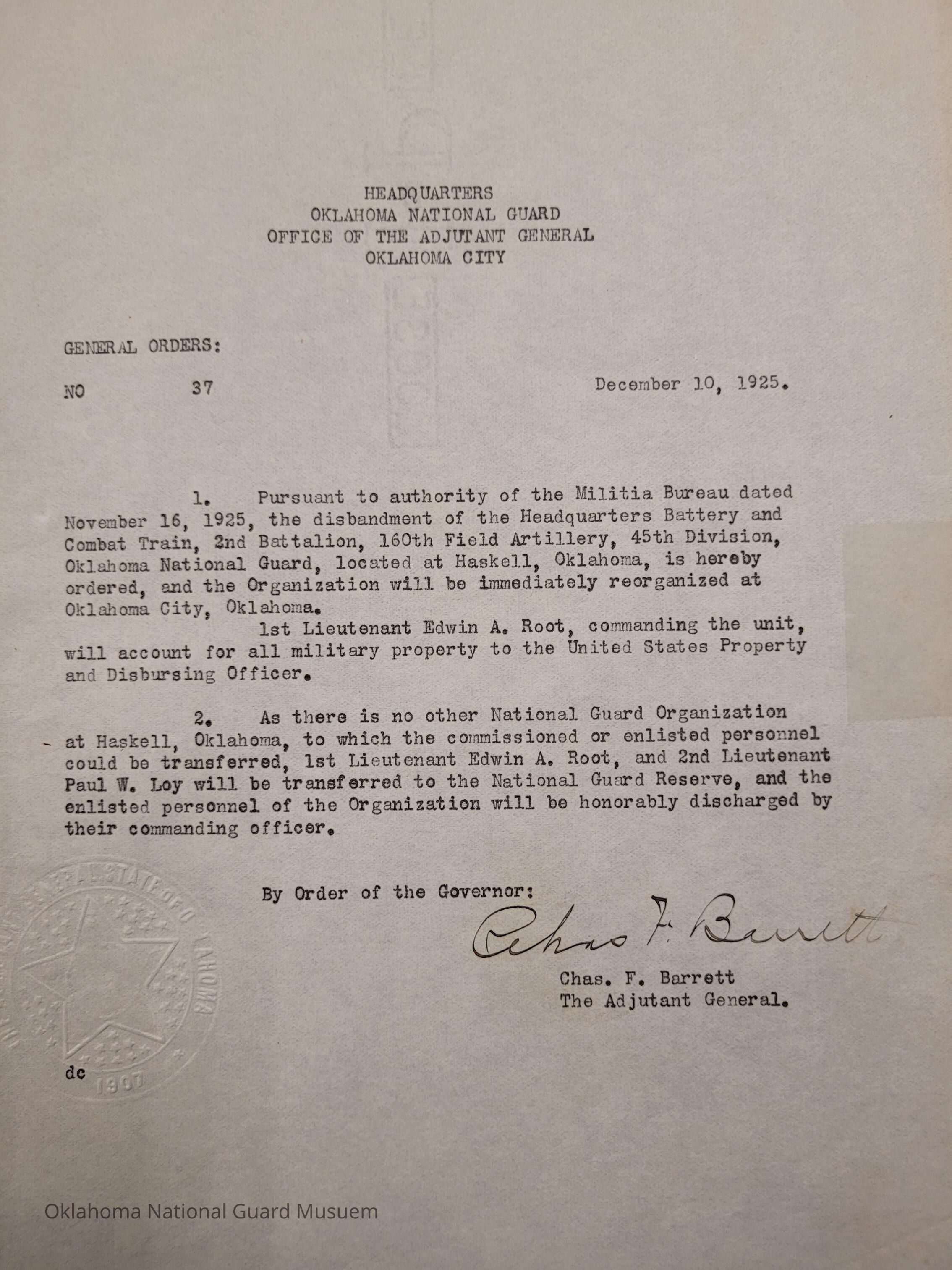 General Order #37 from Headquarters Adjutant General's Office in Oklahoma City. The order disbands Headquarters Battery and Combat Train 160th Field Artillery 45th Division located in Haskell and organized in Oklahoma CityDate(s) of Creation