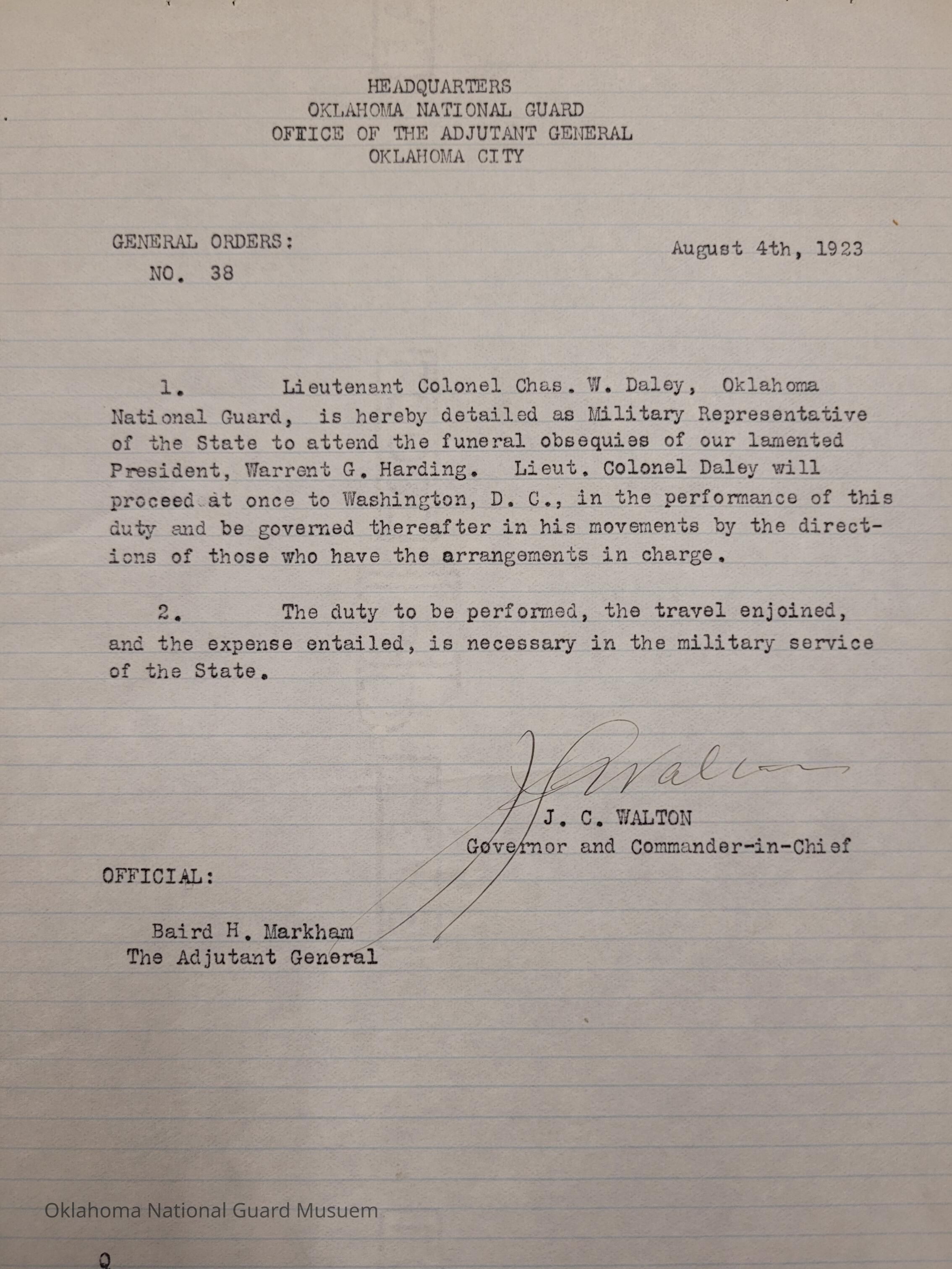 General Order #38 from Headquarters Adjutant General's Office in Oklahoma City. The order sends Charles W. Daley to the funeral of President Warren G. Harding as the Military Representative for OklahomaDate(s) of Creation