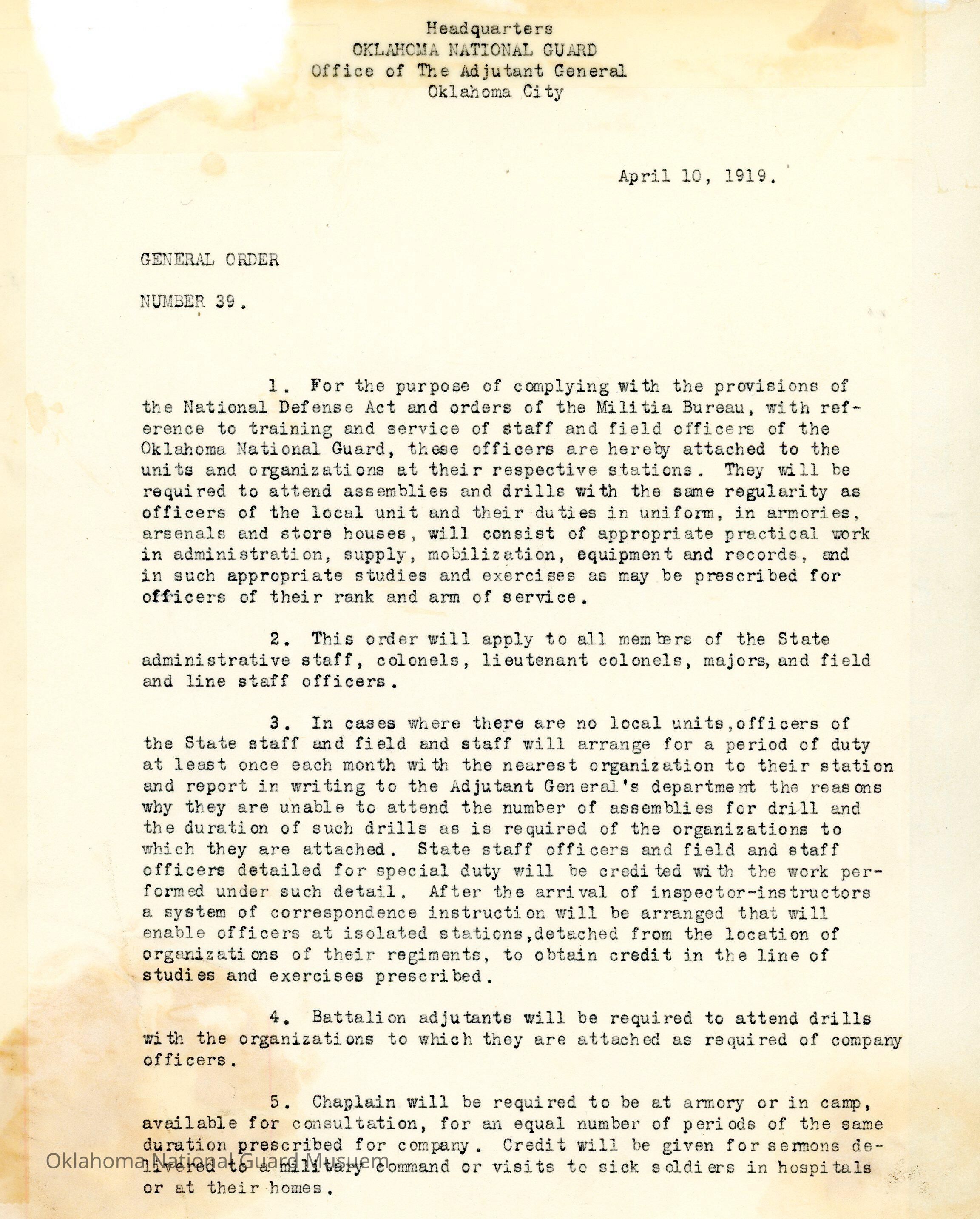 General Order #39 from Headquarters Adjutant General's Office in Oklahoma City. The order requires staff and field officers to attend assemblies and drills with the same regularity as officers of the local unit they are attached to in order to comply with the National Defense Act and the Militia Bureau.Date(s) of Creation