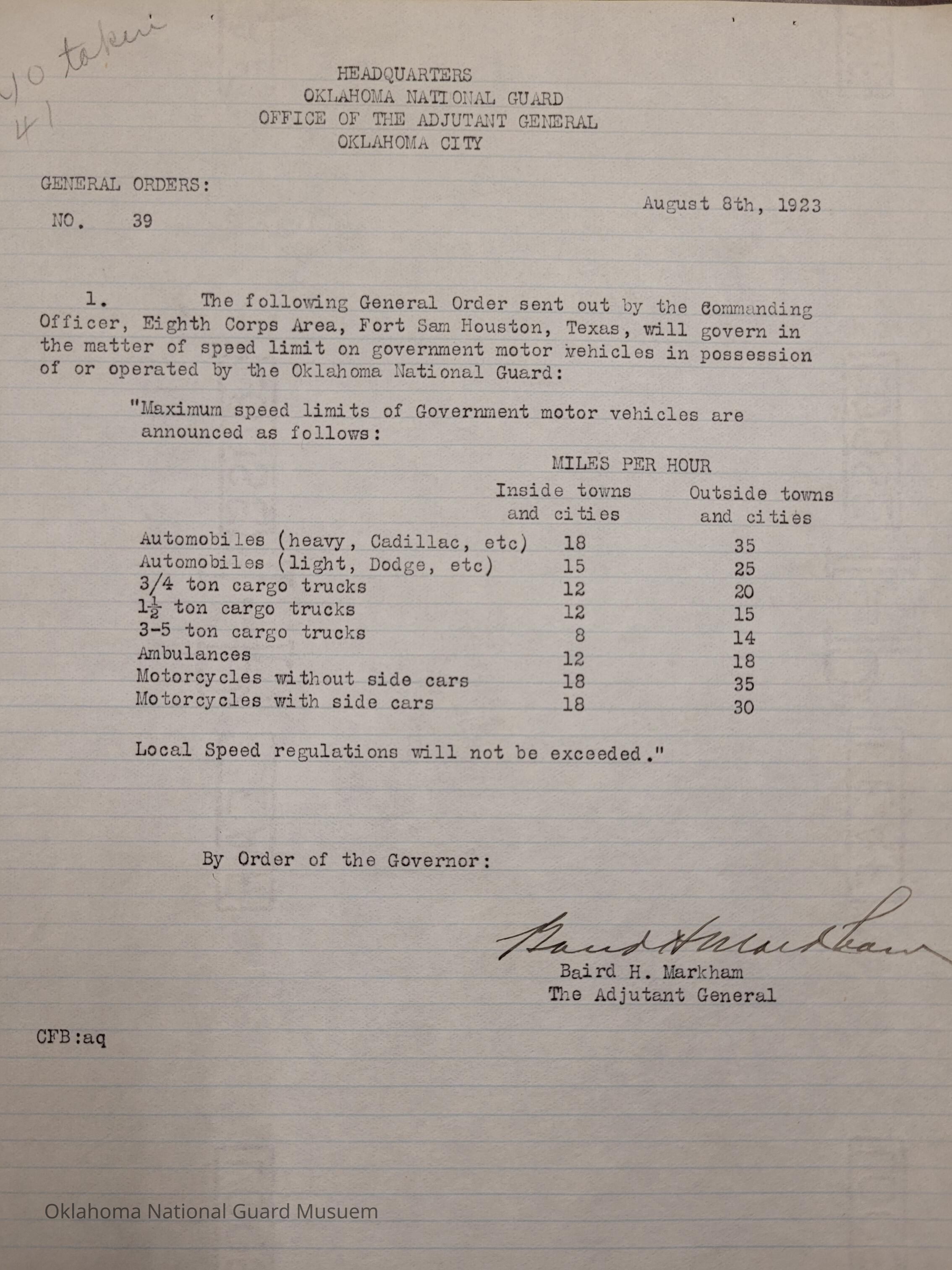 General Order #39 from Headquarters Adjutant General's Office in Oklahoma City. The order sets the speed limit for government vehicles operated by the Oklahoma National GuardDate(s) of Creation