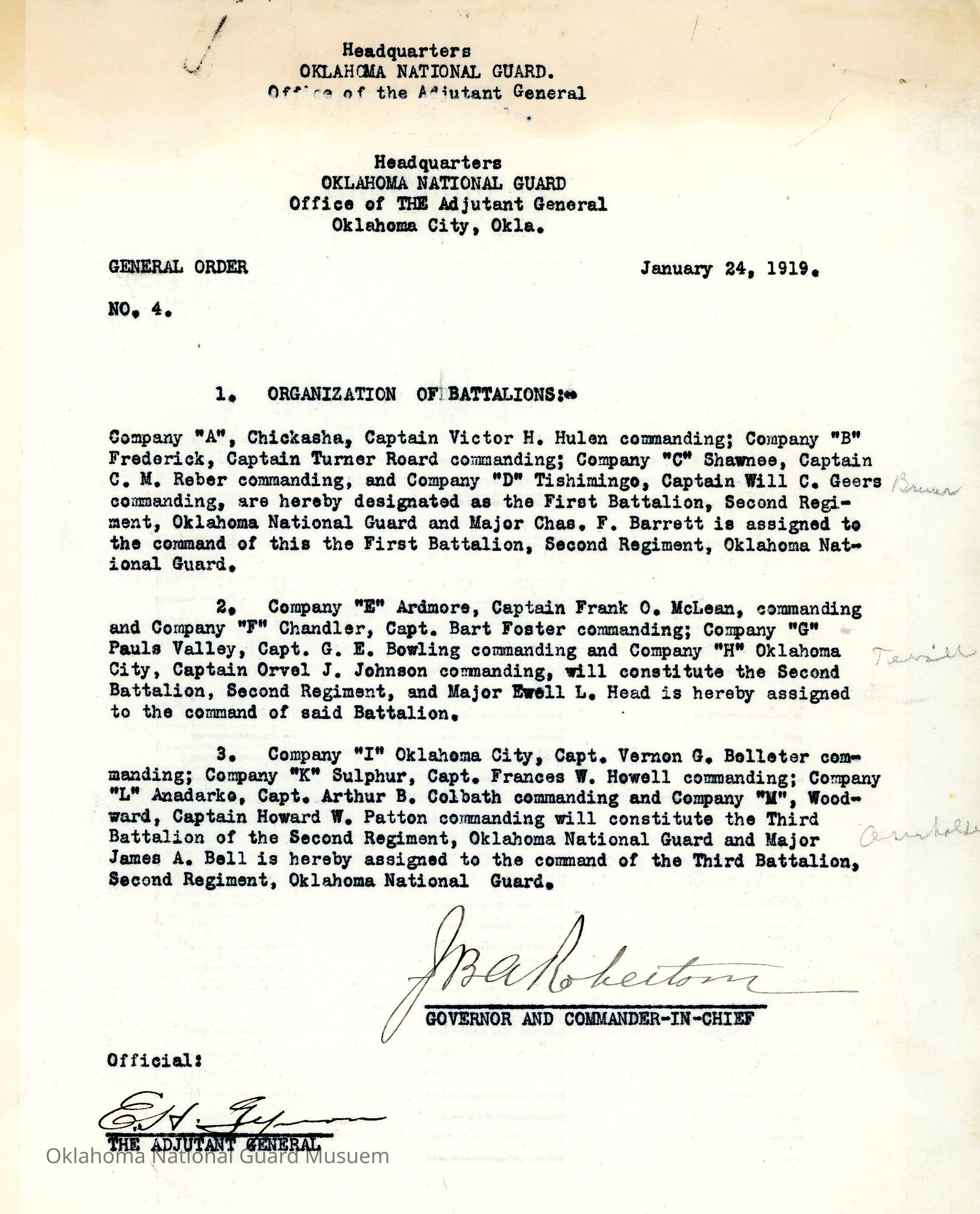 General Order #4 from Headquarters Adjutant General's Office in Oklahoma City. The order reorganizes the battalions and lists which company will be in each battalion and who will be the commanding officerDate(s) of Creation