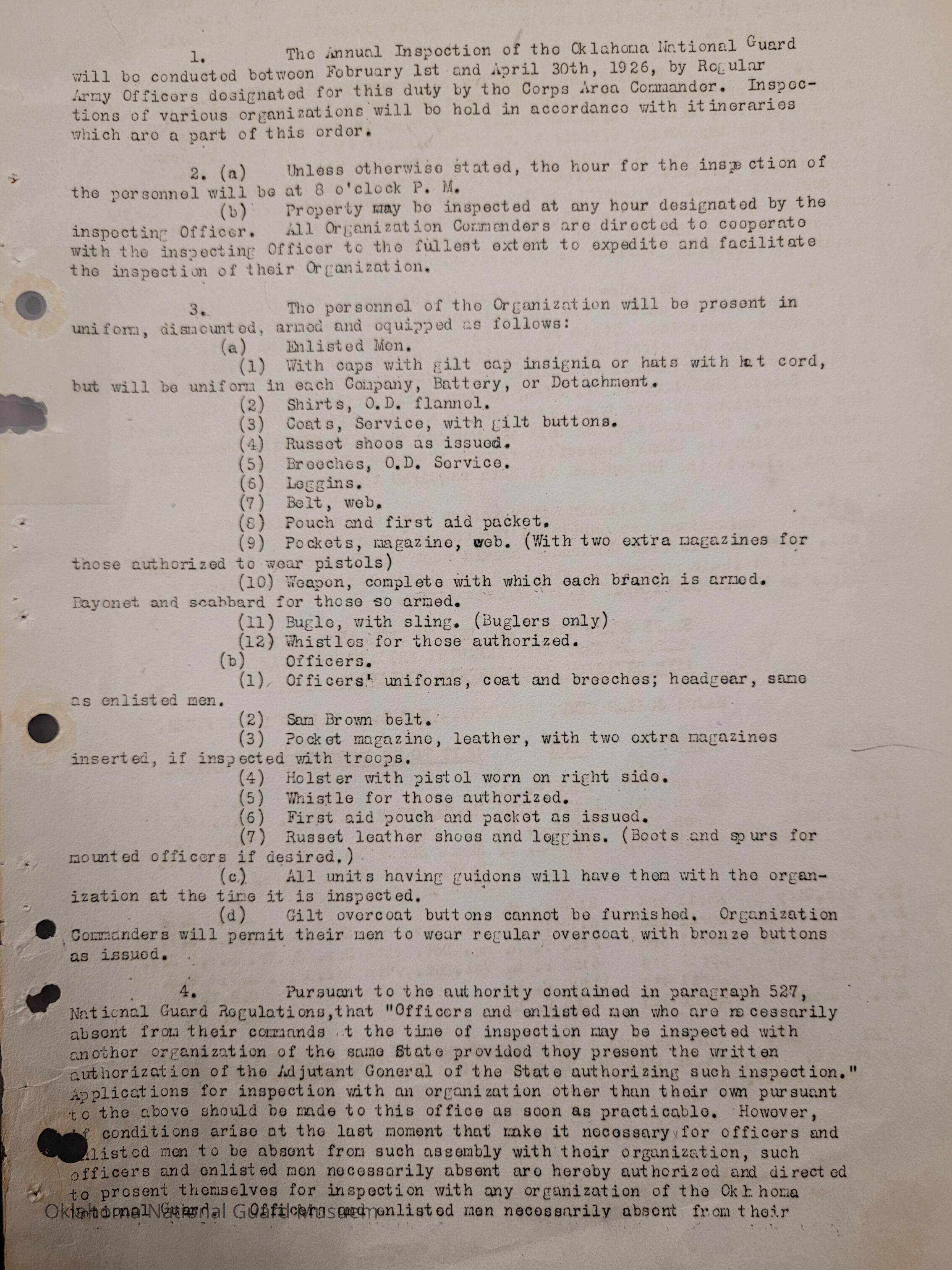 General Order #4 from Headquarters Adjutant General's Office in Oklahoma City. The order details the Annual Inspection of the Oklahoma National Guard. Equipment, uniform requirements, and the schedule for what stations will be inspected when are outlinedDate(s) of Creation