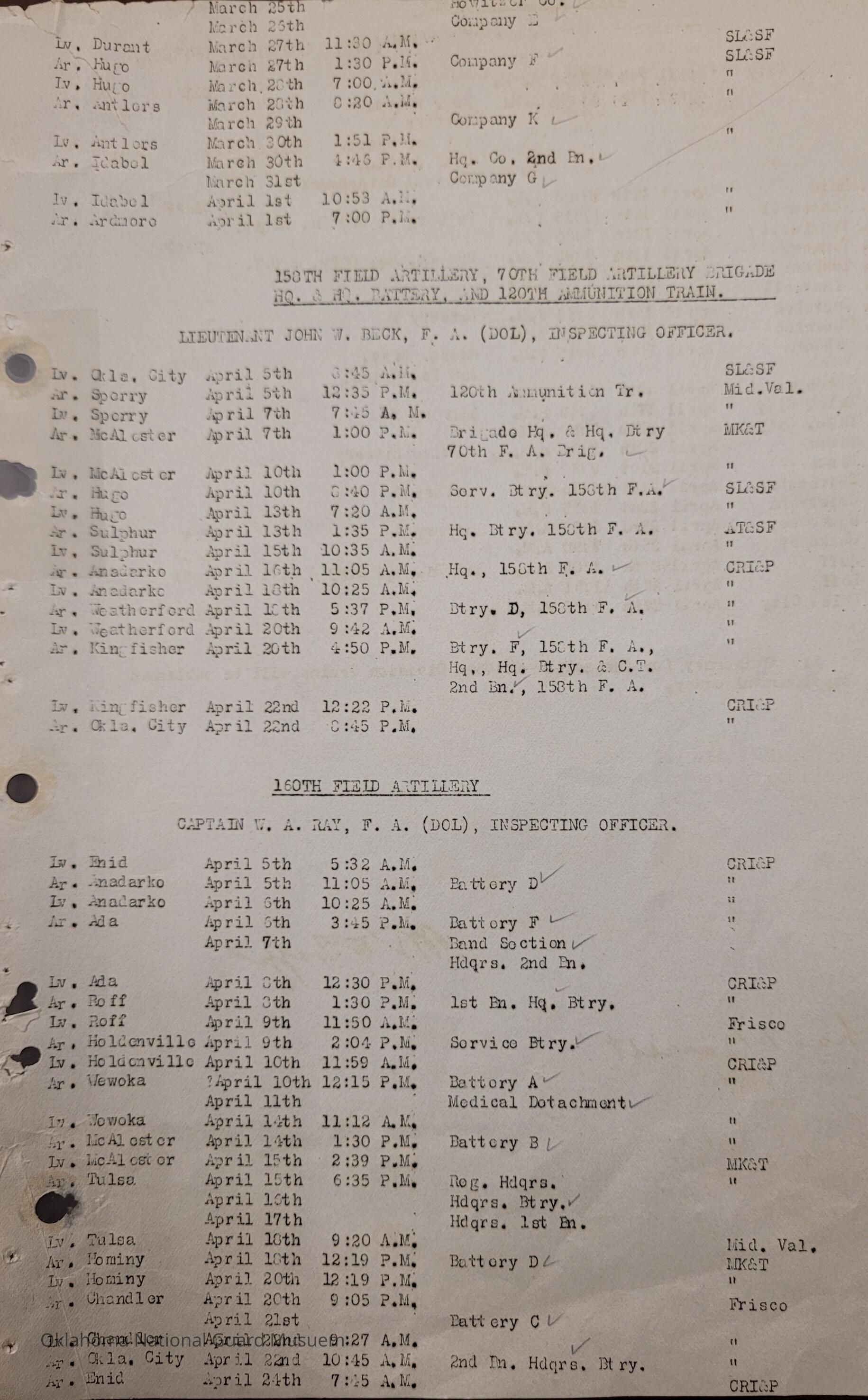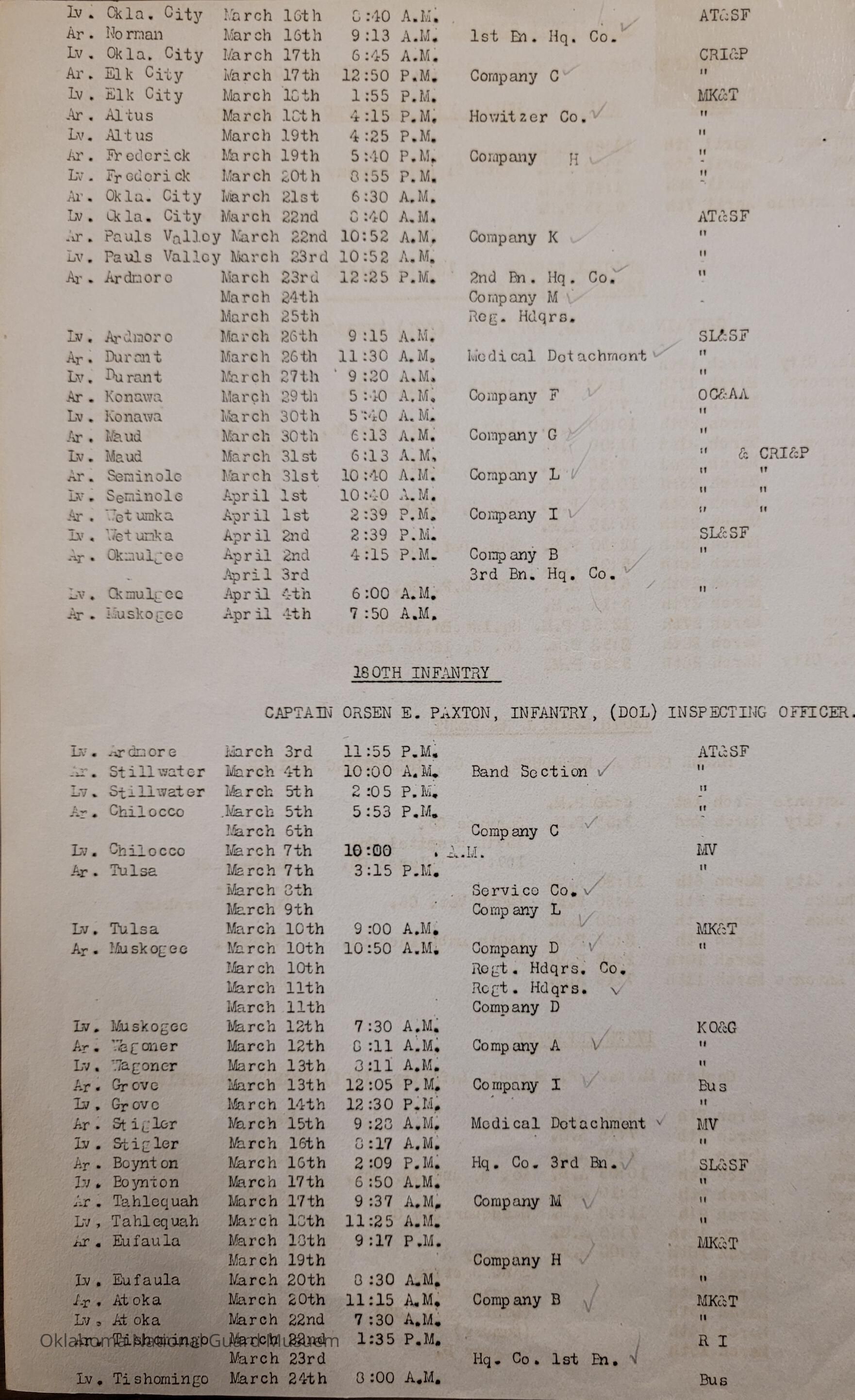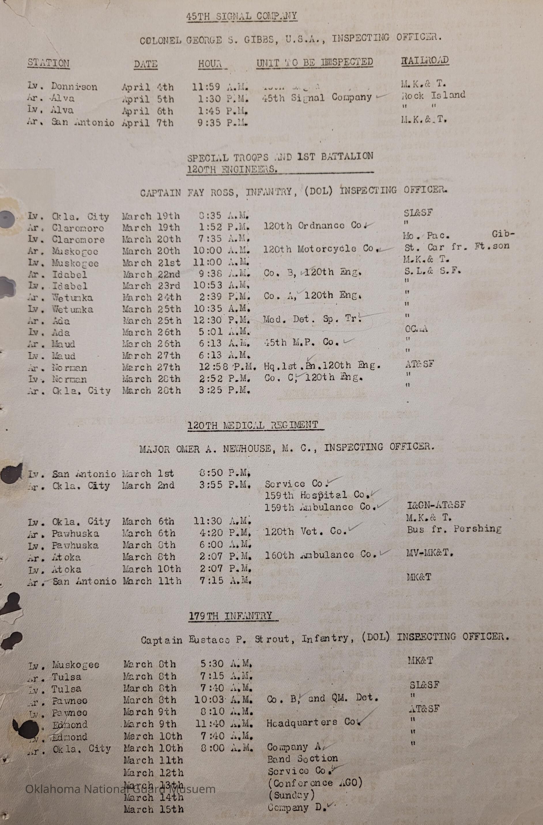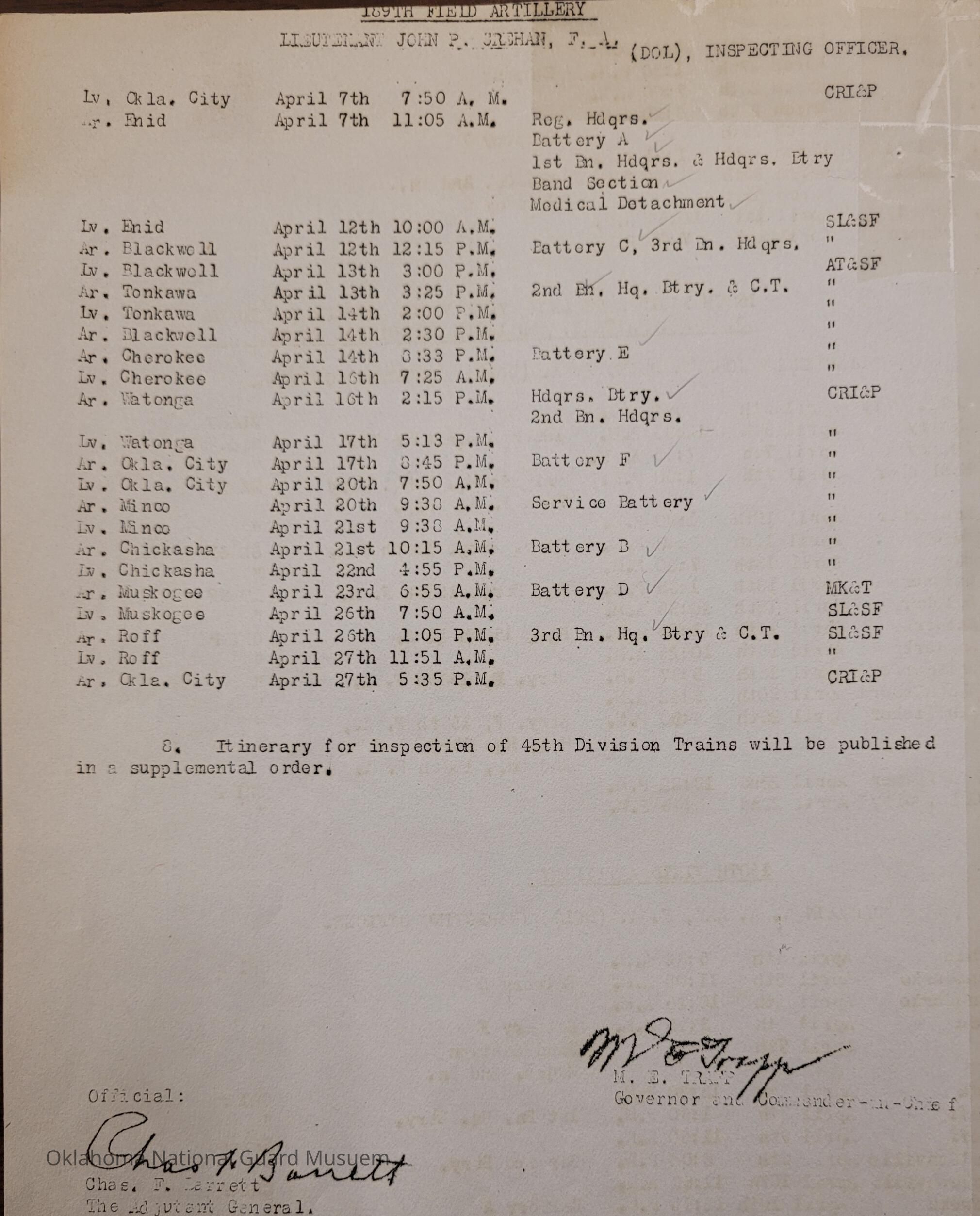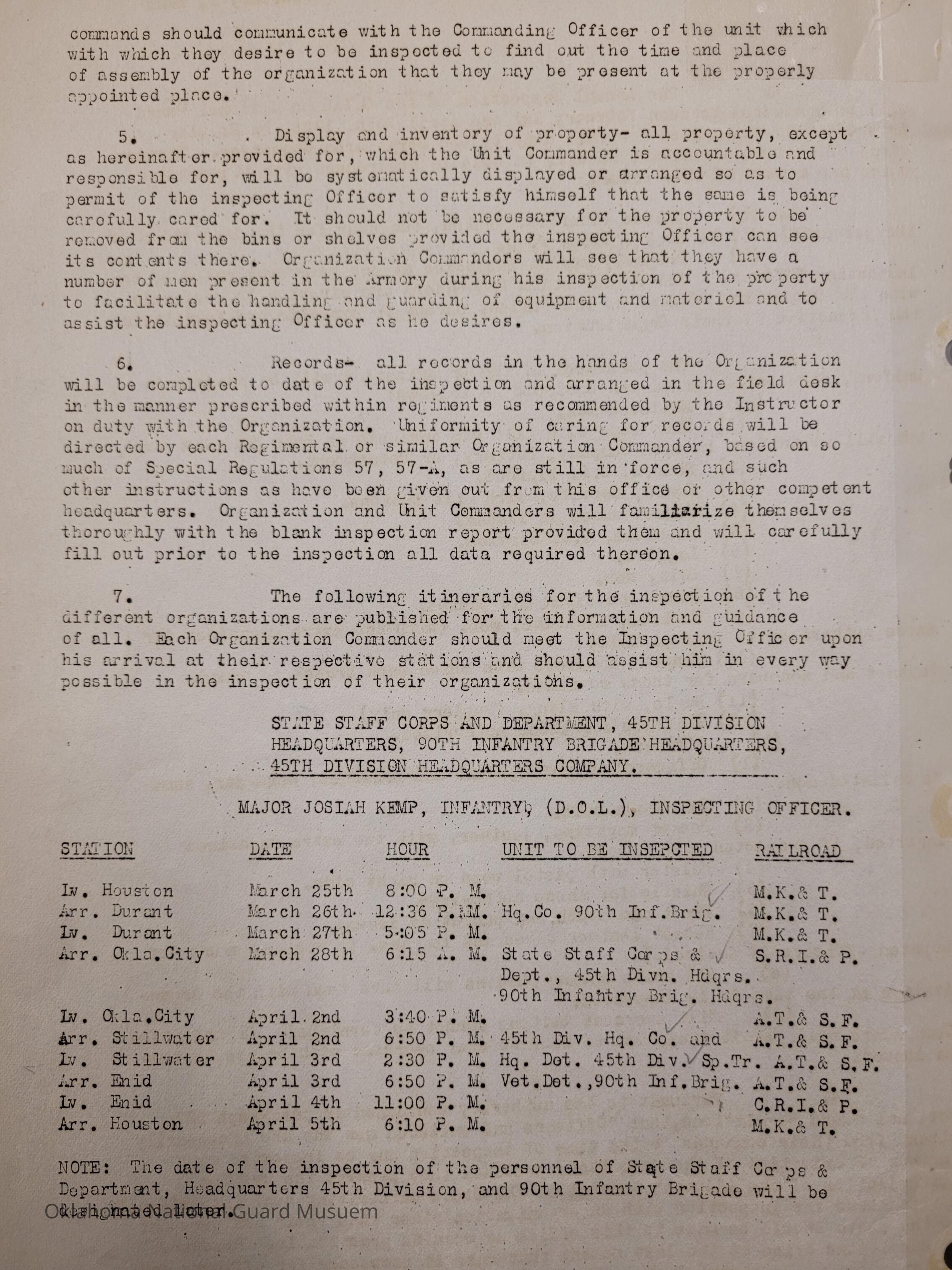 Adjutant General, Oklahoma City, Martin E. Trapp, Charles F. Barrett, Annual Inspection, Corps Area Commander, Uniform, Josiah Kemp, 90th Infantry Brigade, 45th Division, Headquarters, Houston, Durant, Stillwater, Enid, George S. Gibbs, 45th Signal Company, Dennison, Alva, San Antonio, Special Troops, 1st Battalion, 120th Engineers, Claremore, Muskogee, Idabel, Wetumka, Ada, Maud, Norman, 120th Medical Regiment, Omer A. Newhouse, Pawhuska, Atoka, 179th Infantry, Eustace P. Strout, Tulsa, Pawnee, Edmond, Elk City, Altus, Frederick, Pauls Valley, Konawa, Seminole, Okmulgee, 180th Infantry, Orsen E. Paxton, Chilocco, Wagoner, Grove, Stigler, Boynton, Tahlequah, Eufaula, Tishomingo, Hugo, Antlers, 158th Field Artillery, 70th Field Artillery Brigade, 120th Ammunition Train, Sperry, John W. Beck, McAlester, Sulphur, Anadarko, Weatherford, Kingfisher, 160th Field Artillery, W.A. Ray, Ada, Roff, Holdenville, Wewoka, Hominy, Chandler, 189th Field Artillery, John P. Crehan, Blackwell, Tonkawa, Cherokee, Minco, Chickasha, 45th Division Trains, Inspection