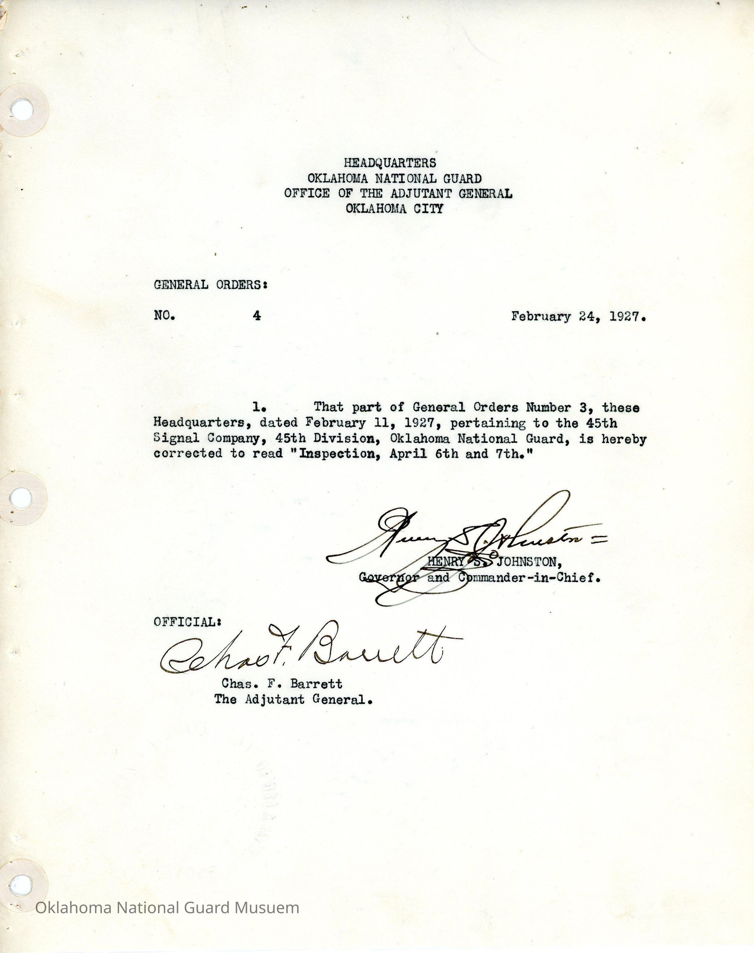 General Order #4 from Headquarters Adjutant General's Office in Oklahoma City. The order corrects the schedule for inspection of the 45th Signal Company from General Order #3 1927Date(s) of Creation