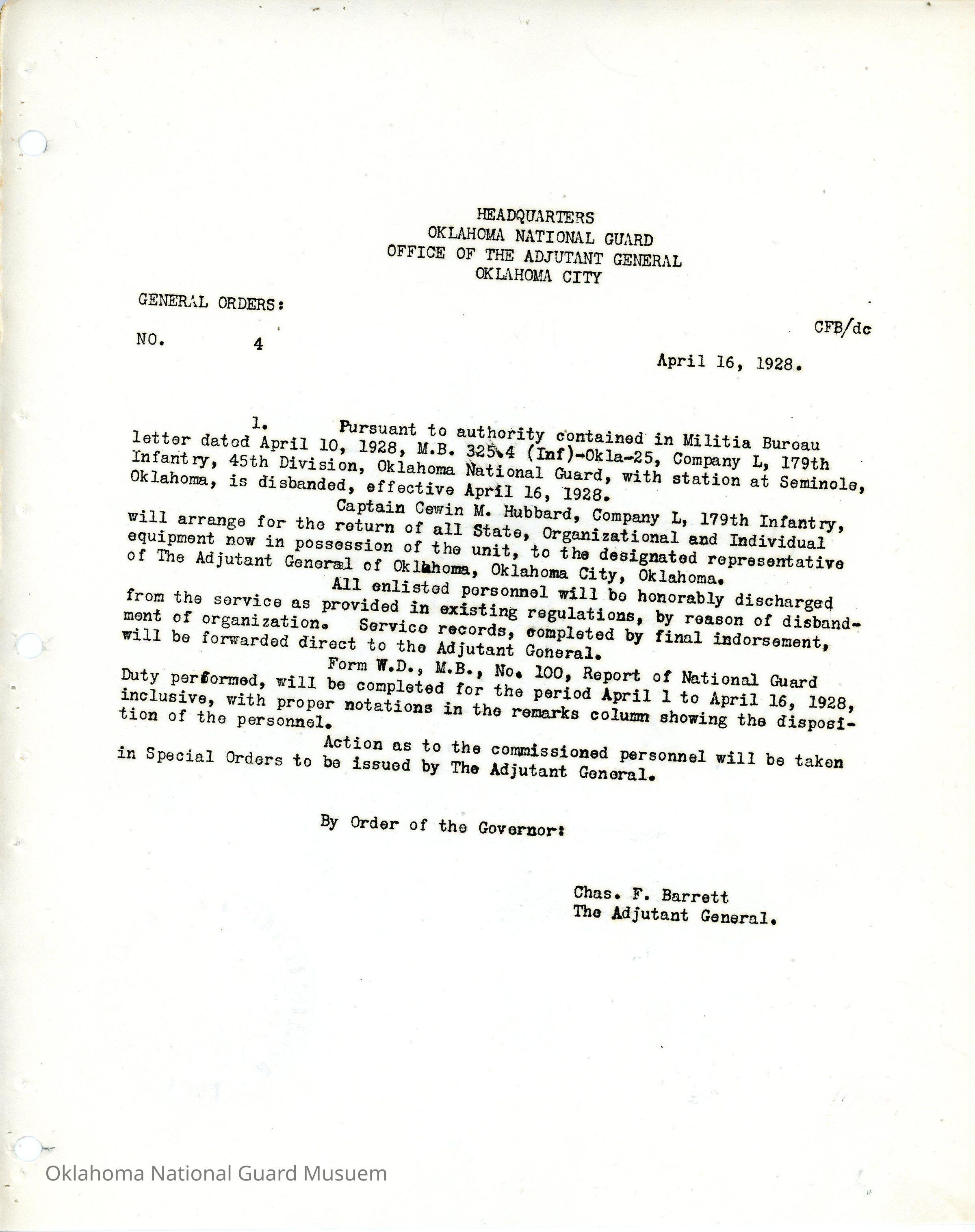 General Order #4 from Headquarters Adjutant General's Office in Oklahoma City. The order disbands Company L 179th Infantry stationed in SeminoleDate(s) of Creation