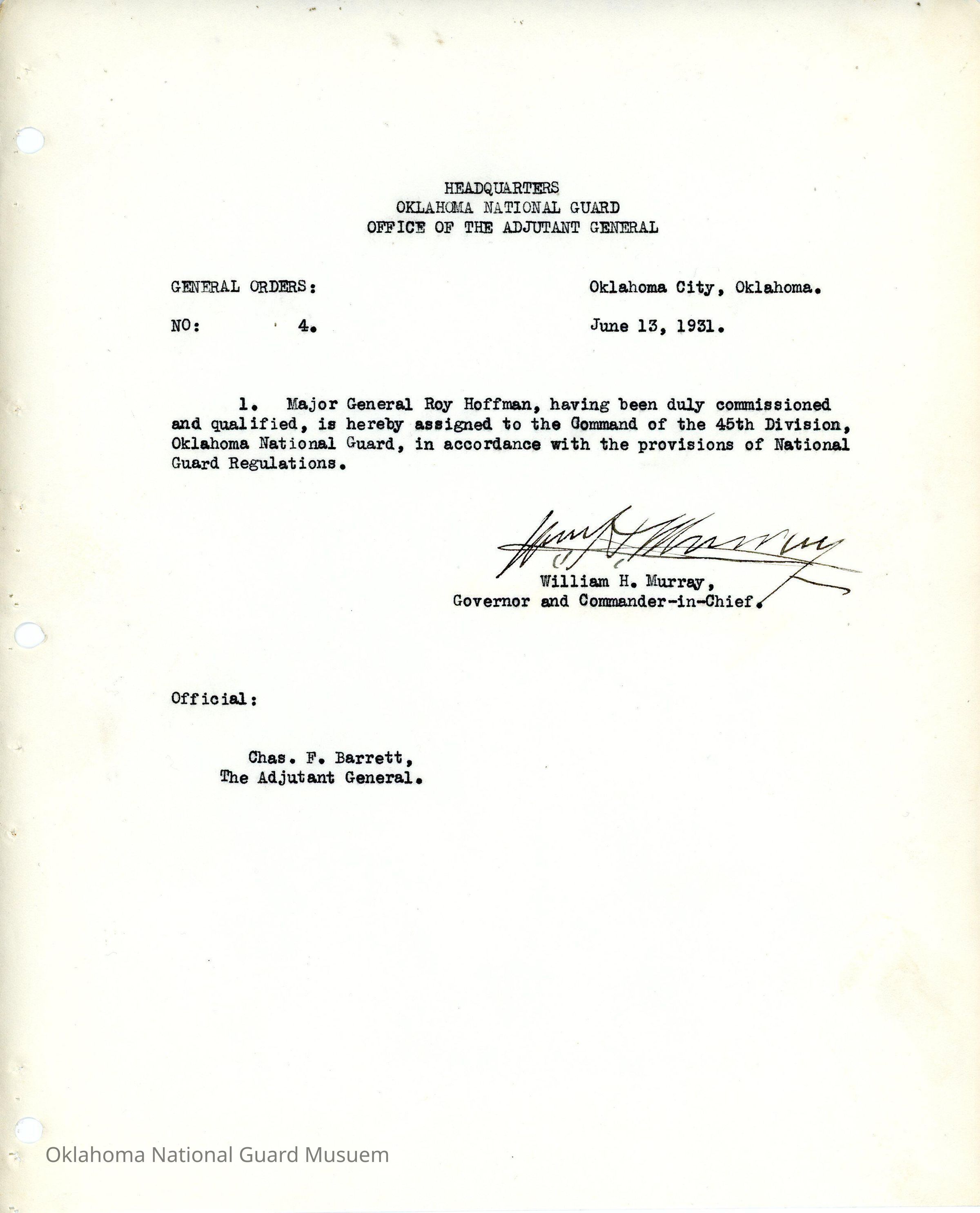 General Order #4 from Headquarters Adjutant General's Office in Oklahoma City. The order assigns Roy Hoffman to command the 45th DivisionDate(s) of Creation