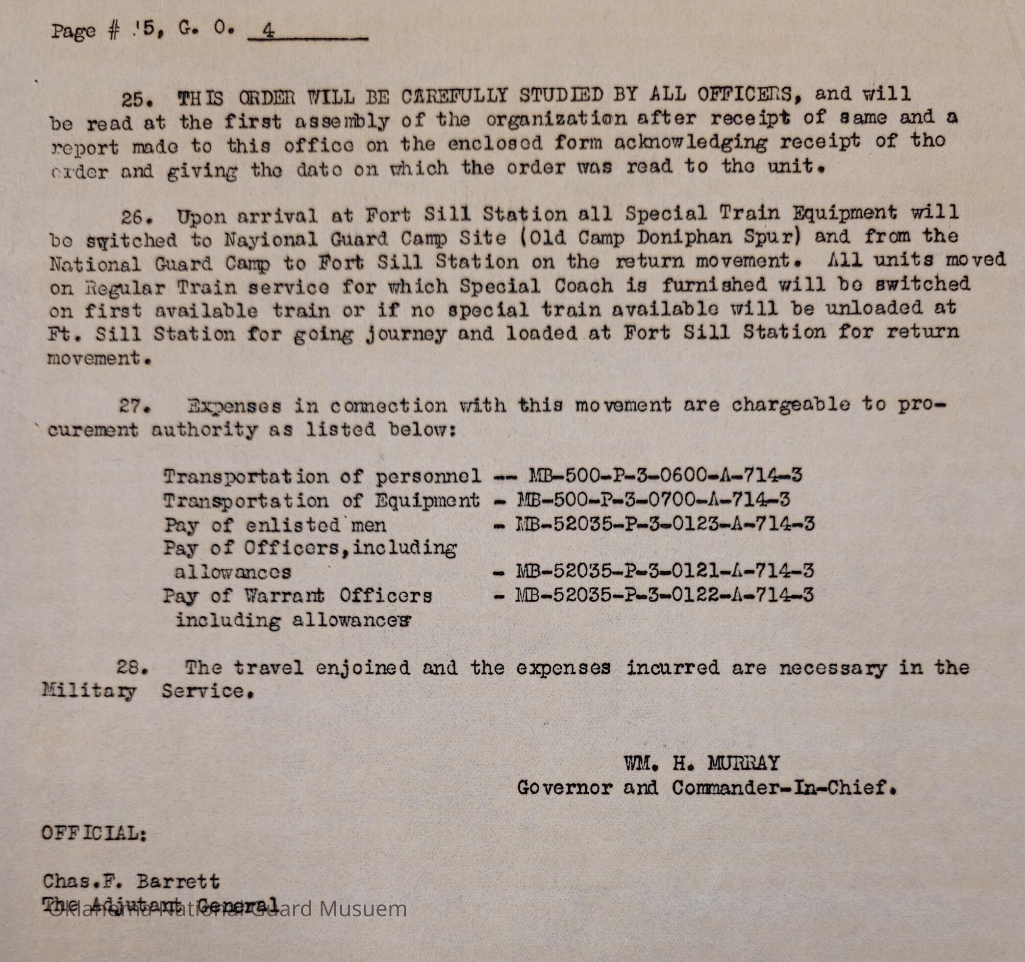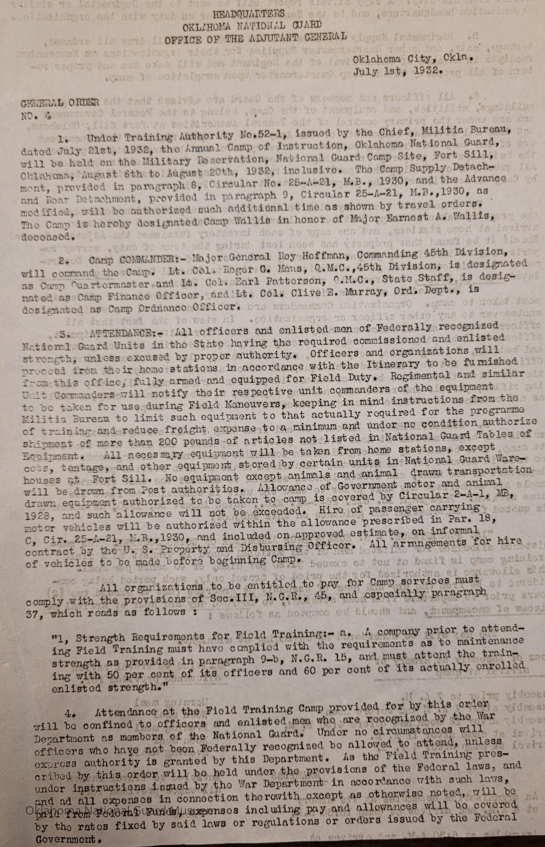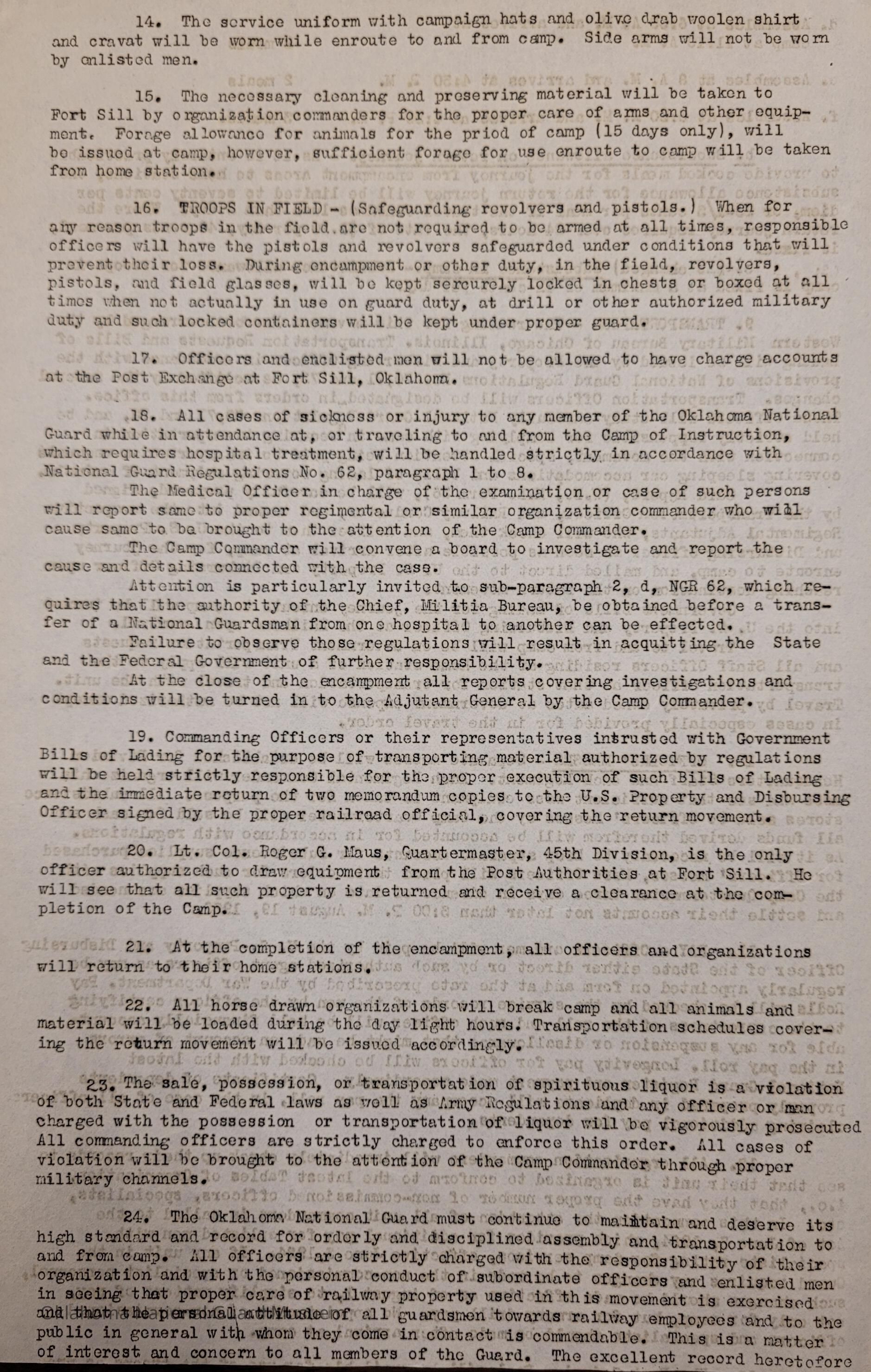 Adjutant General, Oklahoma City, Charles F. Barrett, 45th Division, Camp of Instruction, Fort Sill, Attendance, Pay, Transportation, William H. Murray, Roy Hoffman, Western Military Bureau of Chicago, Illinois, Illinois, Chicago, Roger G. Maus, Camp Wallis, Earnest A. Wallis