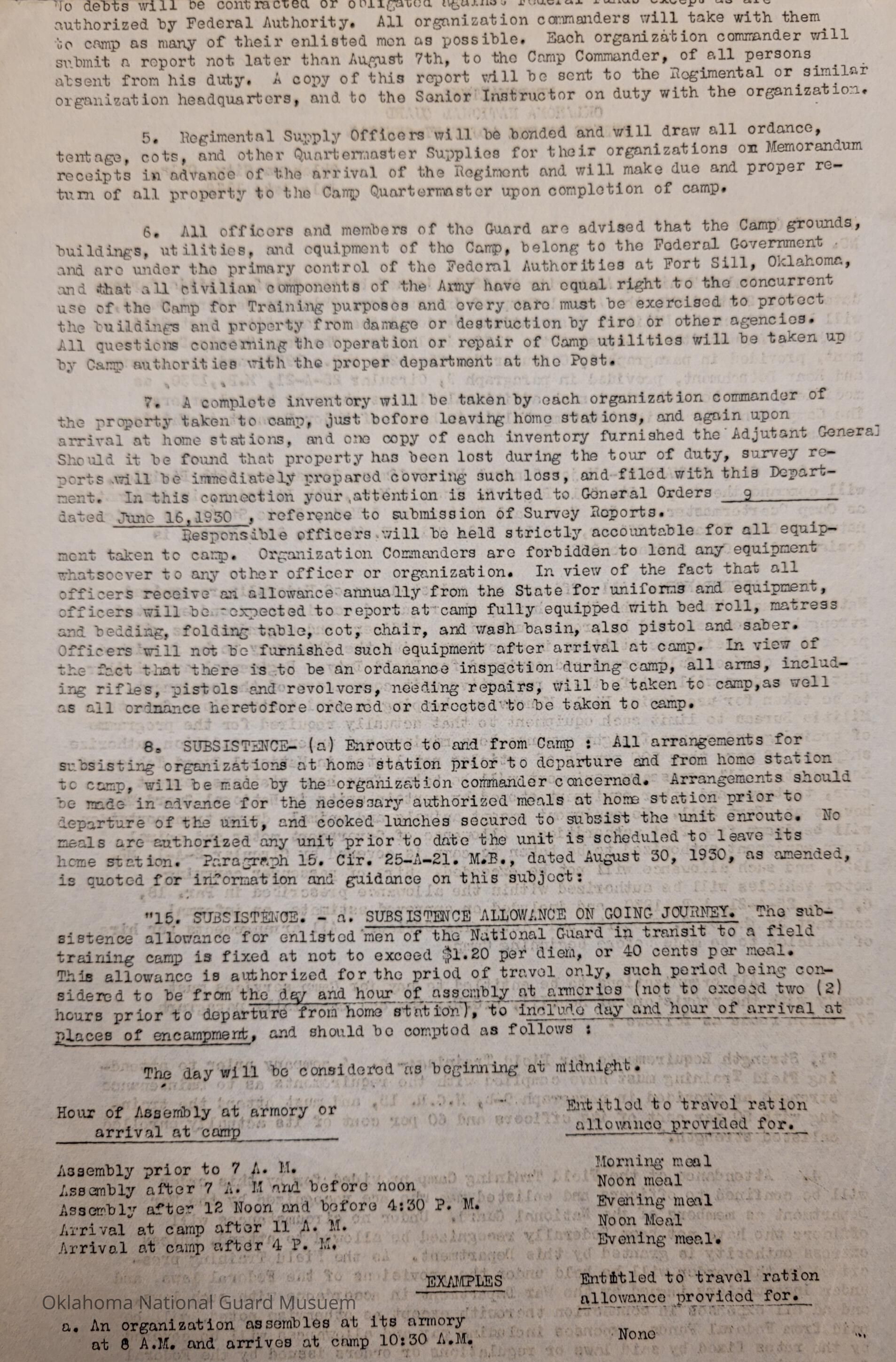 General Order #4 from Headquarters Adjutant General's Office in Oklahoma City. The order details the equipment, attendance, transportation, and pay for the Annual Camp of Instruction at Camp WallisDate(s) of Creation