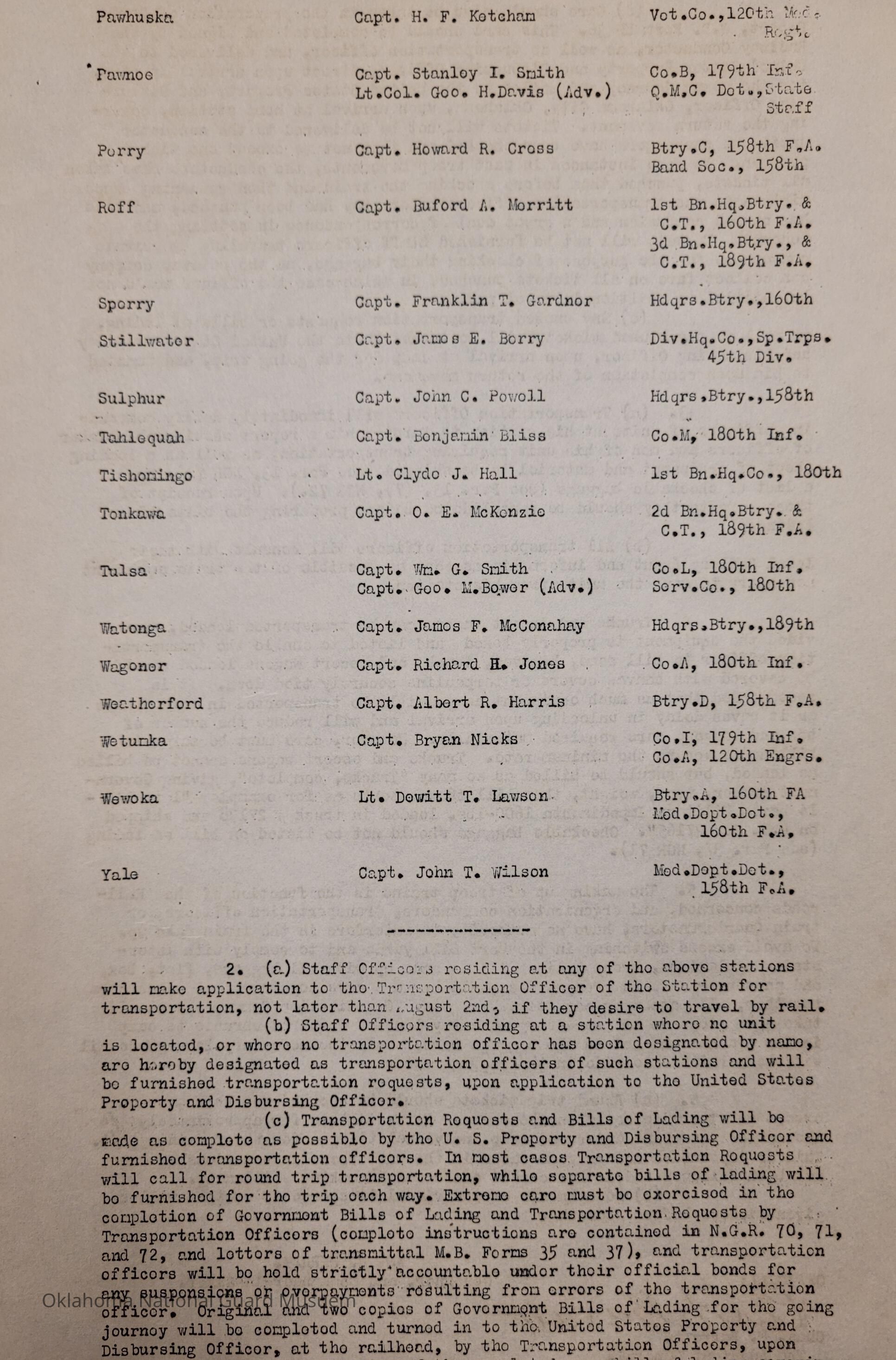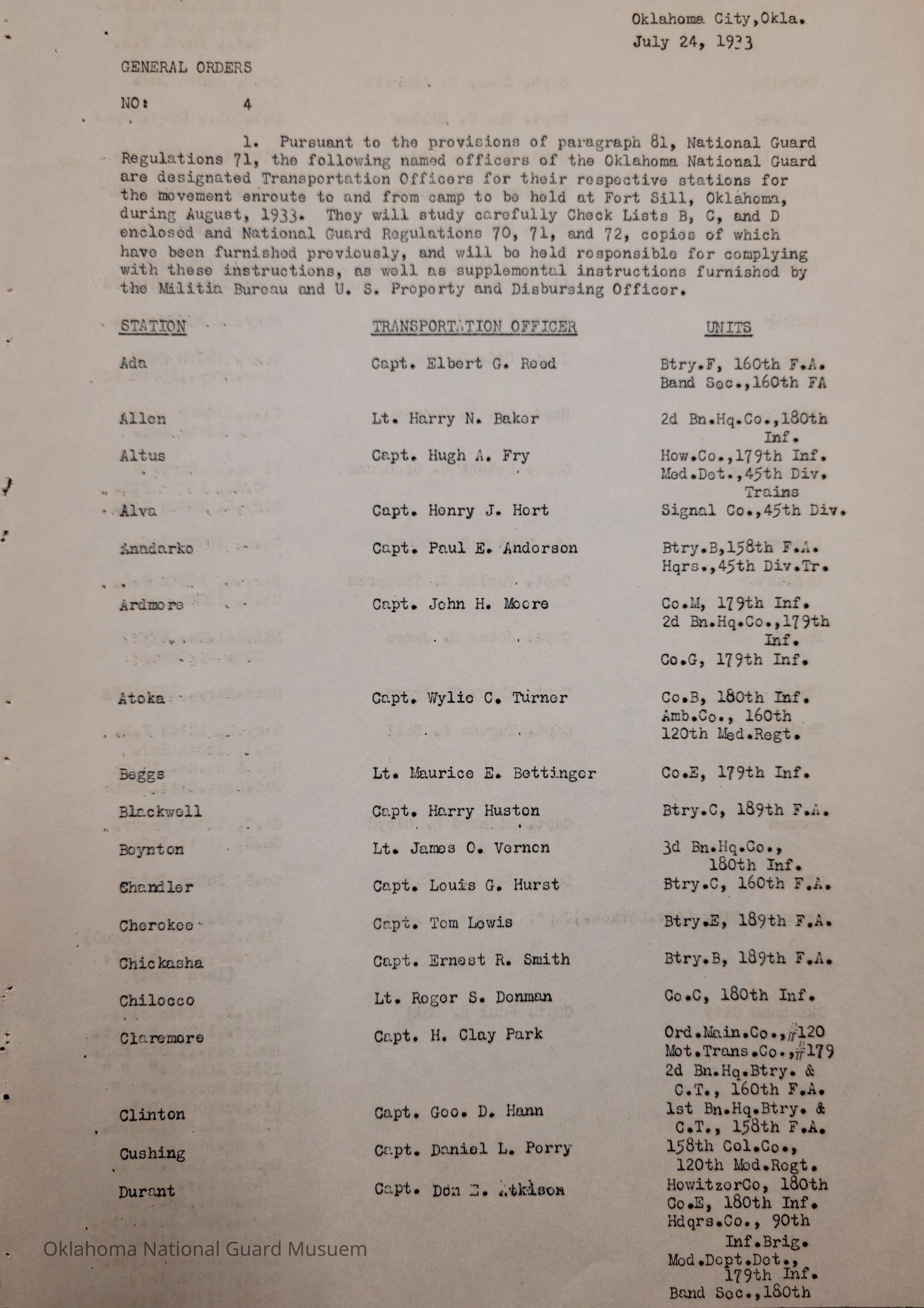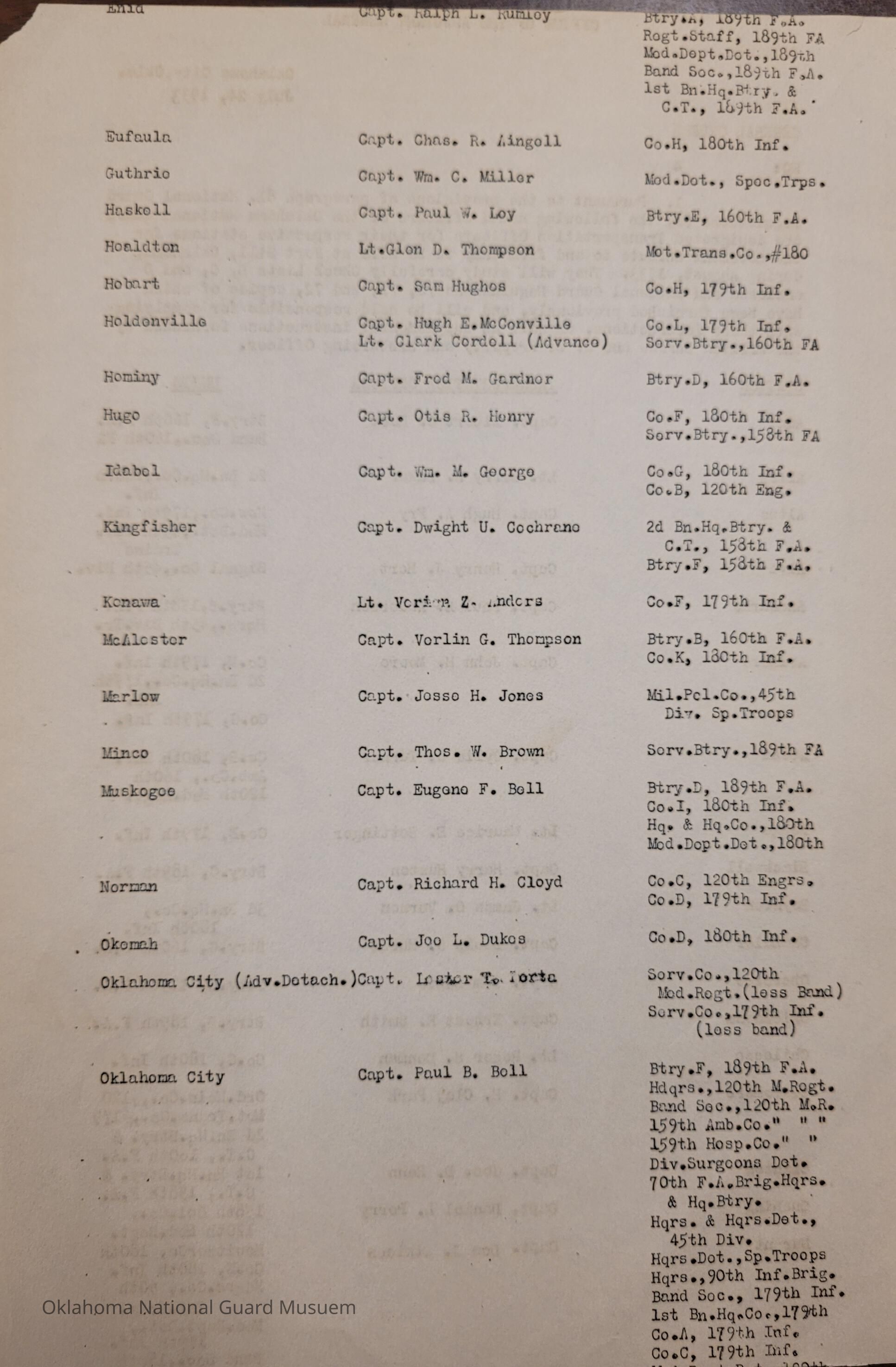 Adjutant General, Oklahoma City, Charles F. Barrett, Transportation officers, William H. Murray, Ada, Elbert G. Reed, 160th Field Artillery, Allen, Harry N. Baker, 180th Infantry, Alva, Henry J. Fort, 45th Signal Company, Anadarko, Paul E. Anderson, 158th Field Artillery, Ardmore, John H. Moore, Atoka, Wylie C. Turner, 120th Medical Regiment, 160th Ambulance Company, Beggs, Maurice E. Bettinger, Blackwell, Harry Huston, 189th Field Artillery, Boynton, James O. Vernon, Chandler, Louis G. Hurst, 160th Field Artillery, Cherokee, Tom Lewis, Chickasha, Earnest R. Smith, Chilocco, Roger S. Denman, Claremore, H. Clay Park, Cushing, Daniel F. Perry, Durant, Don E. Atkinson, 90th Infantry Brigade, Edmond, Byron F. Jolly, Enid, Ralph L. Rumley, Eufaula, Charles A. Aingell, Guthrie, William C. Miller, Special Troops, Haskell, Paul W. Loy, Healdton, Glenn D. Thompson, Hobart, Sam Hughes, Holdenville, Hugh E. McConville, Clark Cordell, Hominy, Fred M. Gardner, Hugo, Otis R. Henry, Idabel, William M. George, 120th Engineers, Kingfisher, Dwight U. Cochrane, Konawa, Z. Anders, McAlester, Verlin G. Thompson, Marlow, Jesse H. Jones, Minco, Thomas W. Brown, Muskogee, Eugene F. Bell, Norman, Richard H. Cloyd, Okemah, Joe L. Dukes, Paul B. Bell, Lester T. Torta, 70th Field Artillery Brigade, Pawhuska, H.F. Ketcham, Pawnee, Stanley I. Smith, George H. Davis, Perry, Howard R. Cress, Roff, Buford A. Merritt, Sperry, Franklin T. Gardner, Stillwater, James E. Berry, Sulphur, John C. Powell, Tahlequah, Benjamin Bliss, Tishomingo, Clyde J. Hall, Tonkawa, O.E. McKenzie, Tulsa, William G. Smith, George M. Bower, Watonga, James F. McConahay, Wagoner, Richard H. Jones, Weatherford, Albert R. Harris, Wetumka, Byron Nicks, Altus, Hugh A. Fry, Clinton, George D. Hann, Weowka, Dewitt T. Lawson, Yale, John T. Wilson
