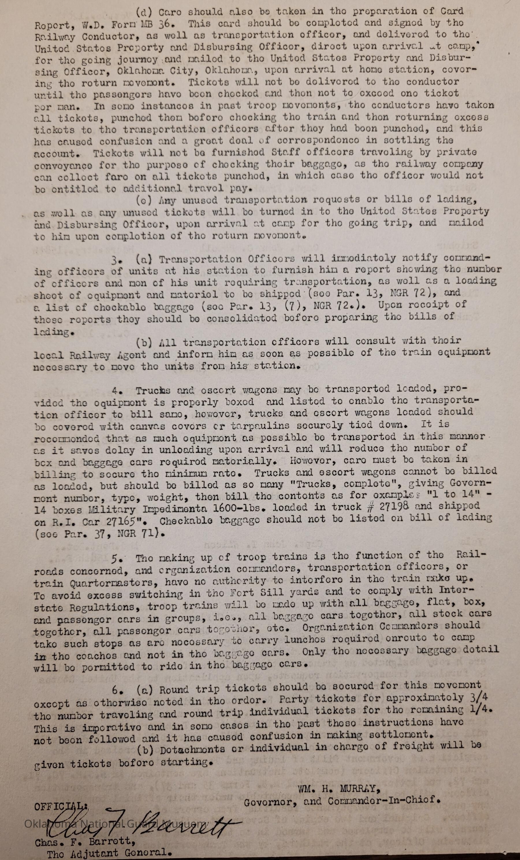 General Order #4 from Headquarters Adjutant General's Office in Oklahoma City. The order designates transportation officers and their respective units and stationsDate(s) of Creation