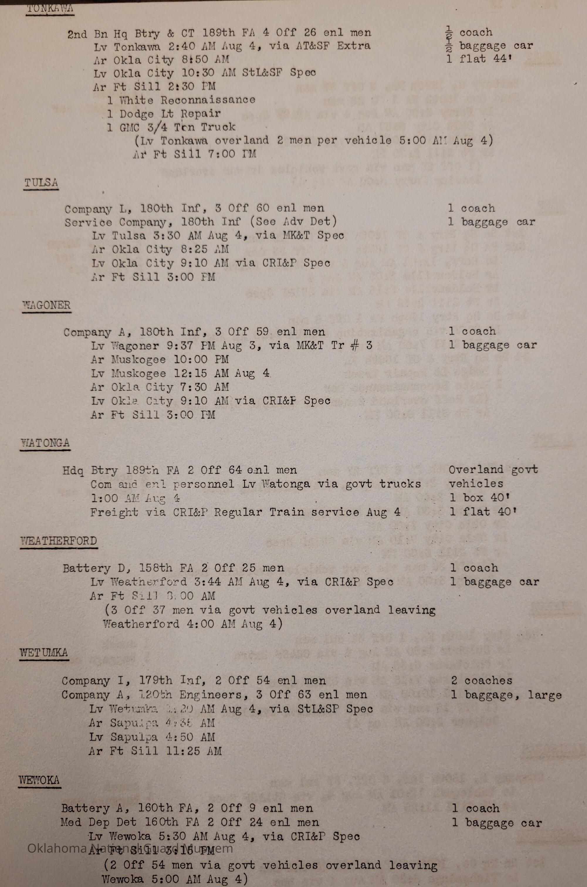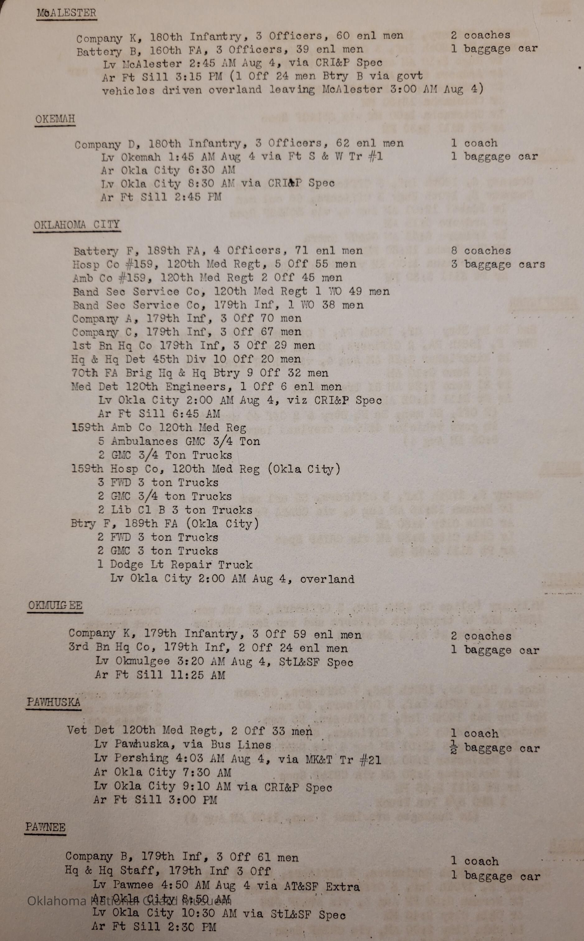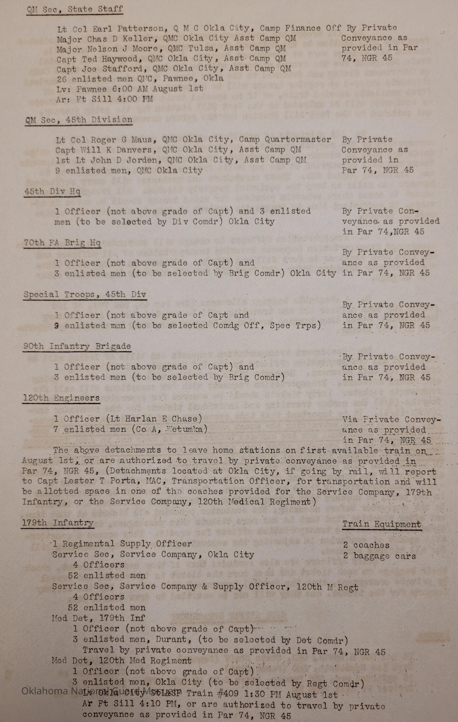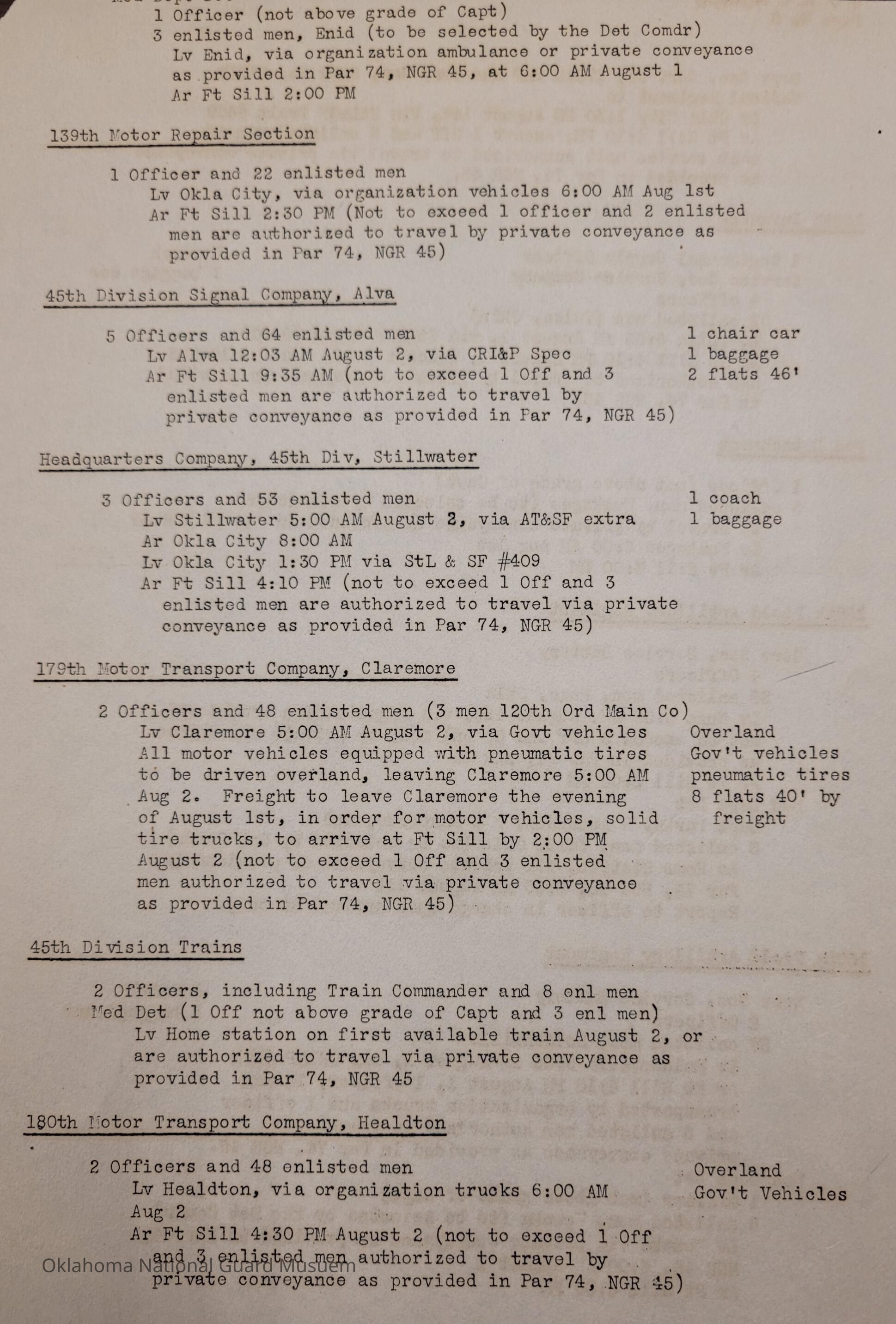 Adjutant General, Oklahoma City, Charles F. Barrett, Fort Sill, Camp of Instruction, Transportation, Train, Equipment, 45th Division Signal Company, 160th Ambulance Company, 120th Veterinary Company, 120th Medical Regiment, 189th Field Artillery, Camp Supply Detachment, Pawnee, George H. Davis, Leo Rundstein, Trucks, Advance Detachment, Earl Patterson, Charles D. Keller, Nelson J. Moore, Joe Stafford, Ted Haywood, Roger G. Maus, Will K. Danvers, Ponca City, John D. Jorden, 70th Field Artillery Brigade, 90th Infantry Brigade, 120th Engineers, 179th Infantry, Durant, 180th Infantry, 158th Field Artillery, Hugo, Lawton, Anadarko, Yale, 160th Field Artillery, Holdenville, Wewoka, 189th Field Artillery, Minco, Enid, Alva, Stillwater, Claremore, 45th Division Trains, Healdton, Rear Detachment, Ada, Band Section, Allen, Calvin, Altus, Ardmore, Chickasha, Atoka, McAlester, Blackwell, Boynton, Chandler, Cherokee, Ingersoll, Chilocco, Clinton, Cushing, Beggs, Durant, Edmond, Eufaula, Guthrie, Haskell, Hobart, Hominy, Hugo, Idabel, Kingfisher, Konawa, Marlow, Muskogee, Norman, Okemah, Okmulgee, Pawhuska, Pawnee, Perry, Roff, Sperry, Sulphur, Tahlequah, Tishomingo, Tonkawa, Tulsa, Wagoner, Watonga, Weatherford, Wetumka, Wewoka, Abe Herskowitz, Ralph L. Rumely, John C. Powell, Tom Lewis, Dwight U Cochrane, Benjamin Bliss, Harry Huston, Roy H. Cox, James A. Bell, Wylie C. Turner, William M. George