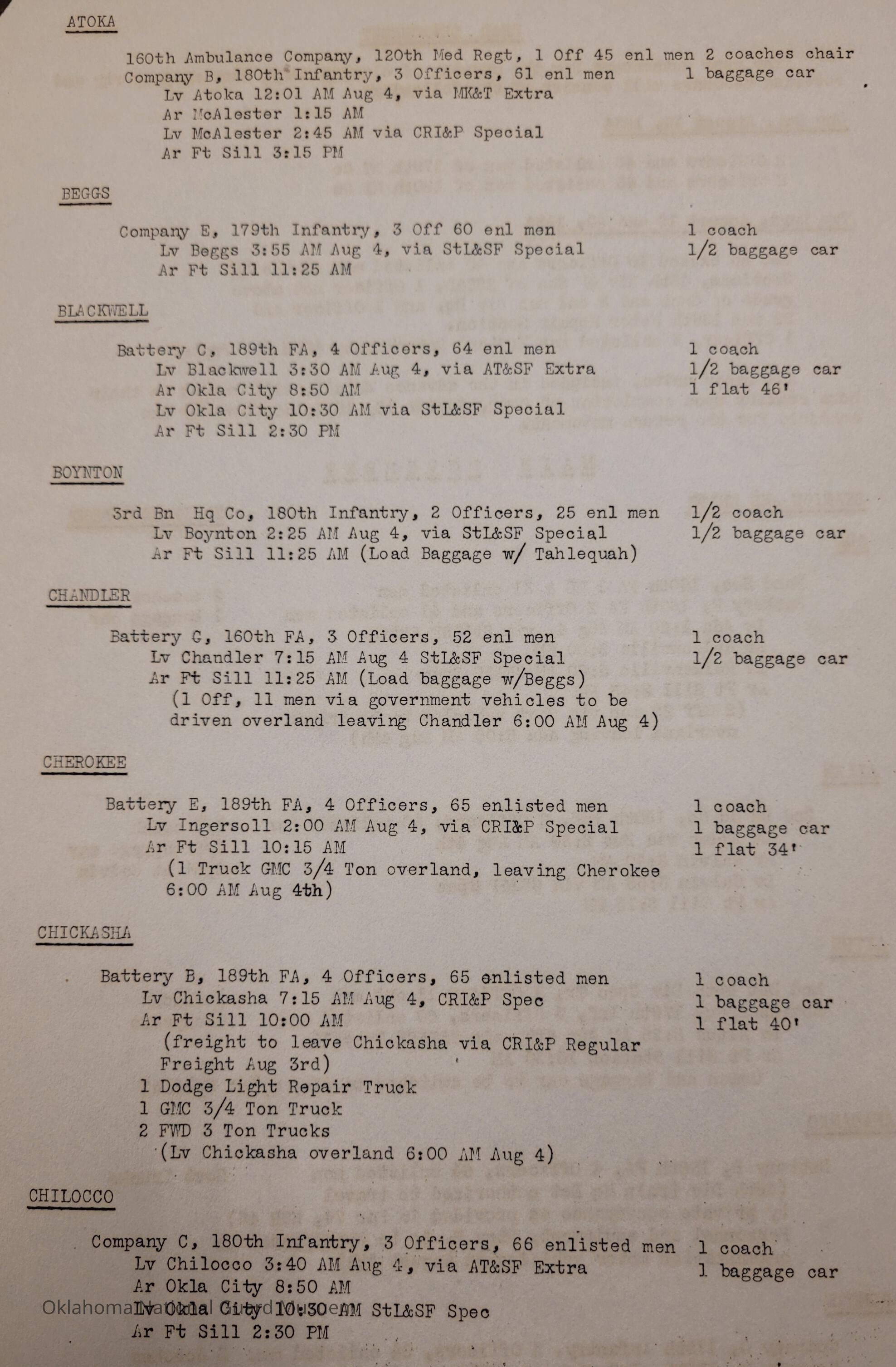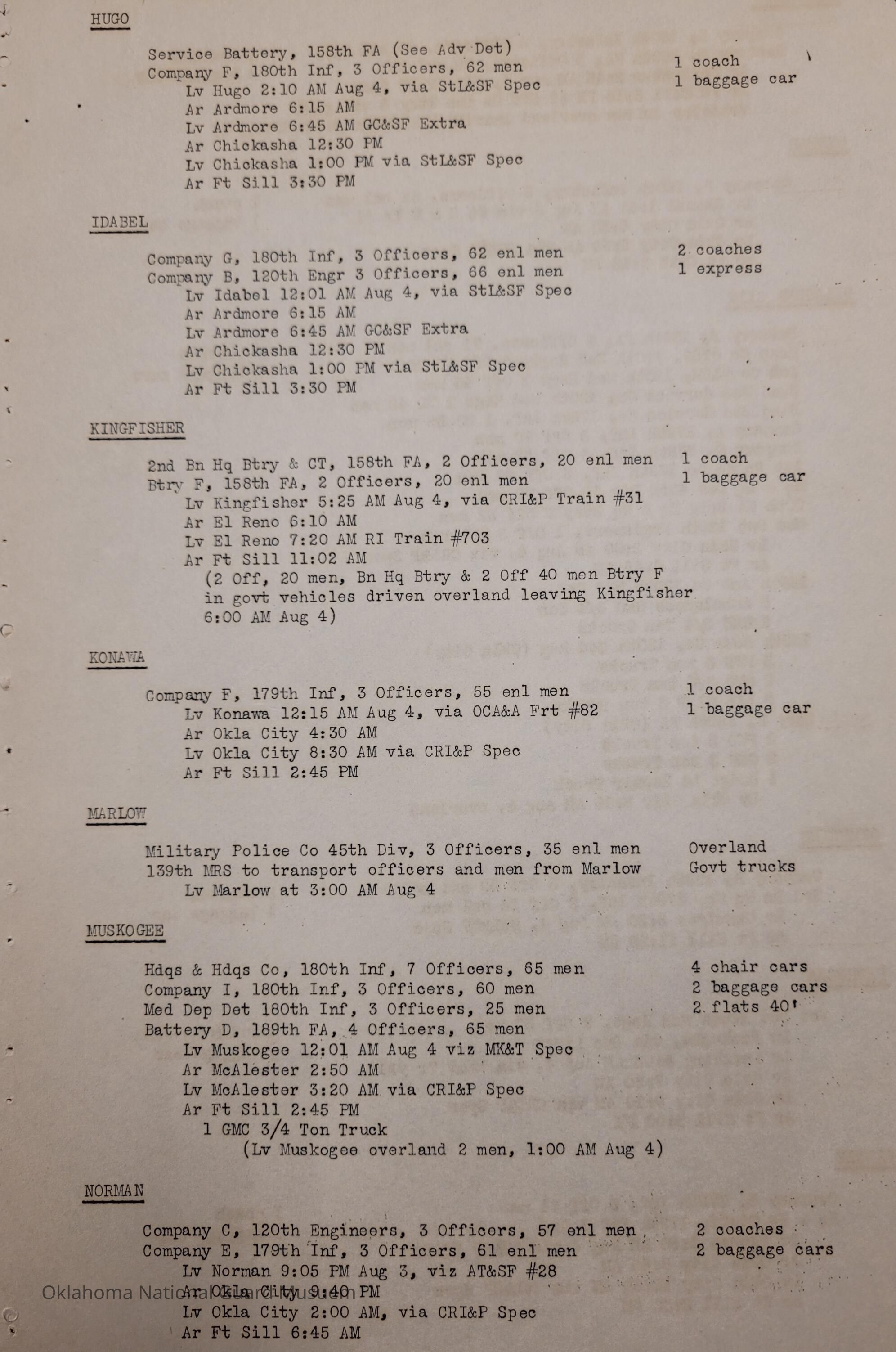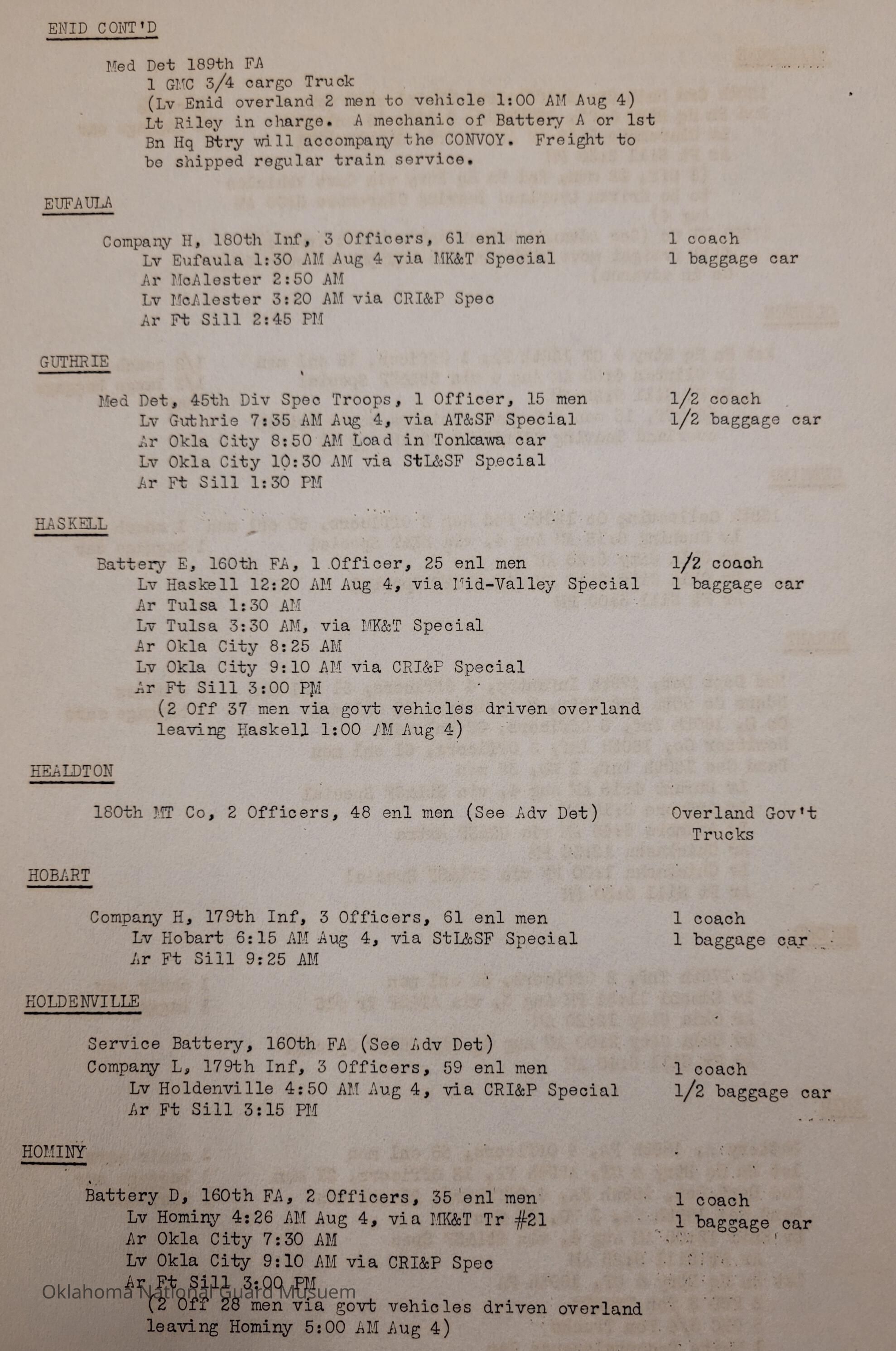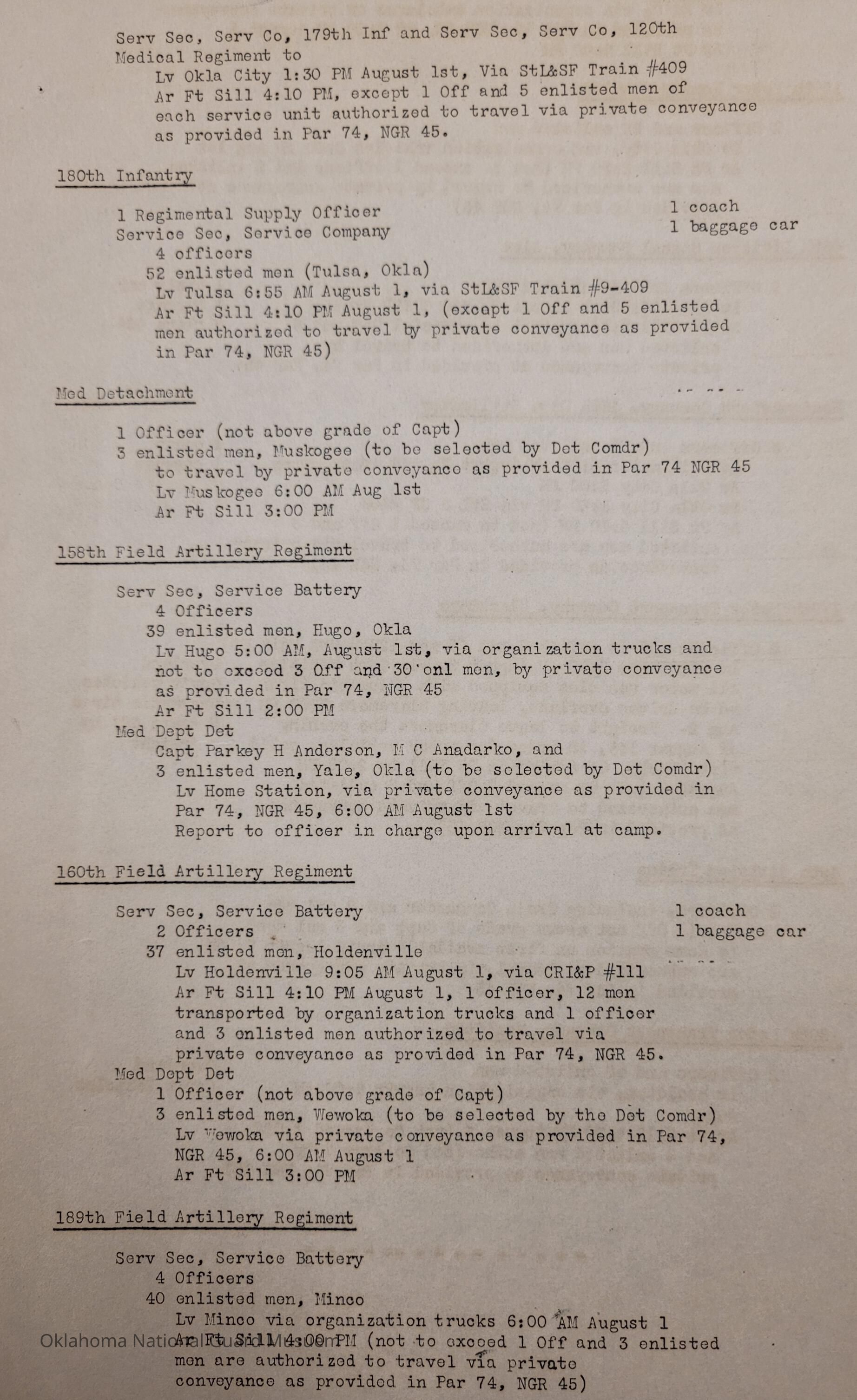 Adjutant General, Oklahoma City, Charles F. Barrett, Fort Sill, Camp of Instruction, Transportation, Train, Equipment, 45th Division Signal Company, 160th Ambulance Company, 120th Veterinary Company, 120th Medical Regiment, 189th Field Artillery, Camp Supply Detachment, Pawnee, George H. Davis, Leo Rundstein, Trucks, Advance Detachment, Earl Patterson, Charles D. Keller, Nelson J. Moore, Joe Stafford, Ted Haywood, Roger G. Maus, Will K. Danvers, Ponca City, John D. Jorden, 70th Field Artillery Brigade, 90th Infantry Brigade, 120th Engineers, 179th Infantry, Durant, 180th Infantry, 158th Field Artillery, Hugo, Lawton, Anadarko, Yale, 160th Field Artillery, Holdenville, Wewoka, 189th Field Artillery, Minco, Enid, Alva, Stillwater, Claremore, 45th Division Trains, Healdton, Rear Detachment, Ada, Band Section, Allen, Calvin, Altus, Ardmore, Chickasha, Atoka, McAlester, Blackwell, Boynton, Chandler, Cherokee, Ingersoll, Chilocco, Clinton, Cushing, Beggs, Durant, Edmond, Eufaula, Guthrie, Haskell, Hobart, Hominy, Hugo, Idabel, Kingfisher, Konawa, Marlow, Muskogee, Norman, Okemah, Okmulgee, Pawhuska, Pawnee, Perry, Roff, Sperry, Sulphur, Tahlequah, Tishomingo, Tonkawa, Tulsa, Wagoner, Watonga, Weatherford, Wetumka, Wewoka, Abe Herskowitz, Ralph L. Rumely, John C. Powell, Tom Lewis, Dwight U Cochrane, Benjamin Bliss, Harry Huston, Roy H. Cox, James A. Bell, Wylie C. Turner, William M. George