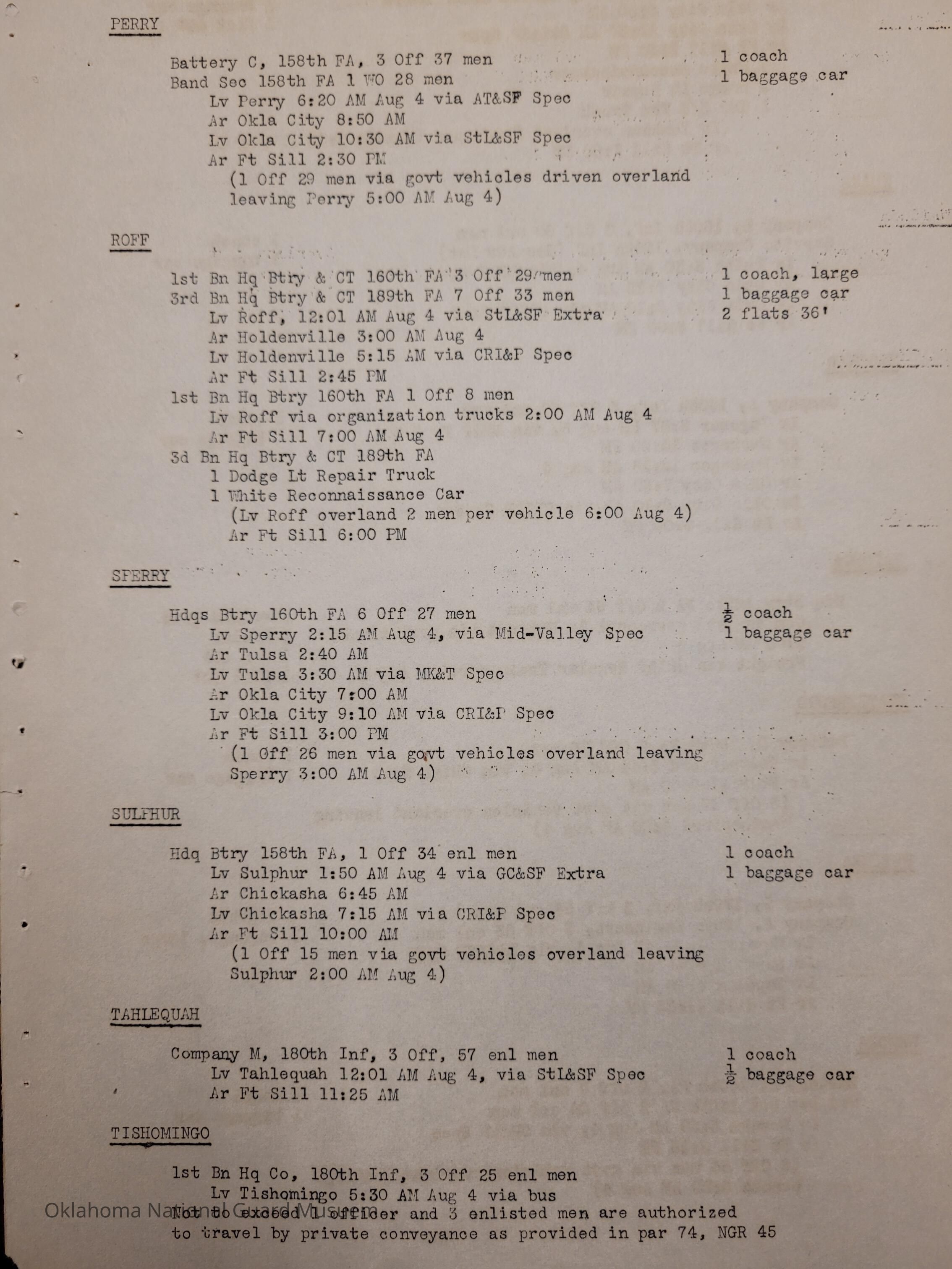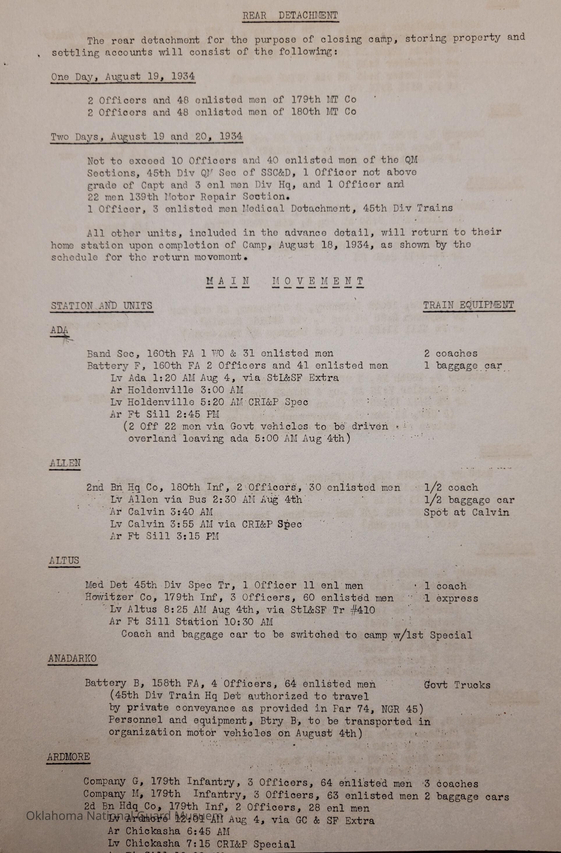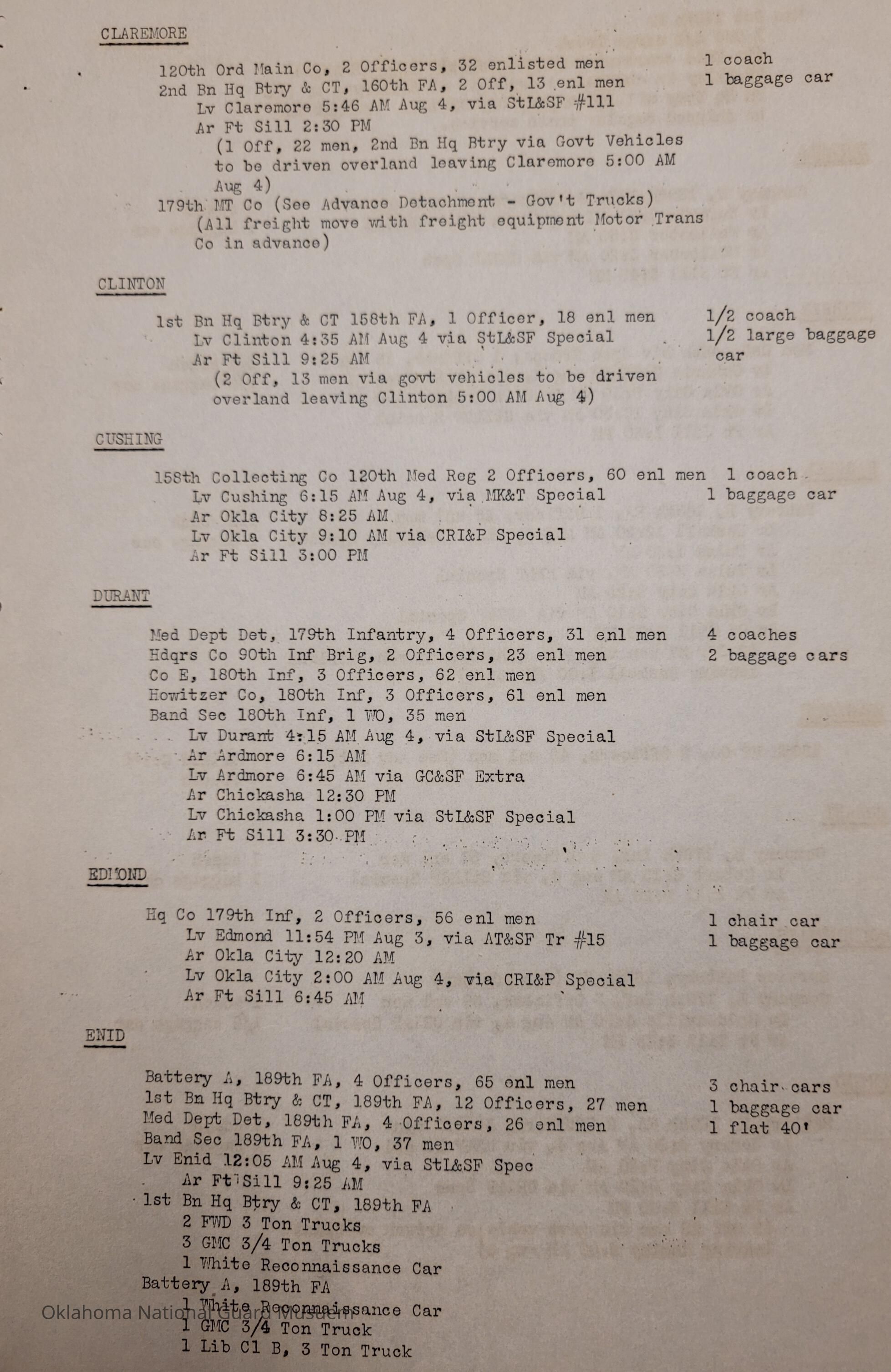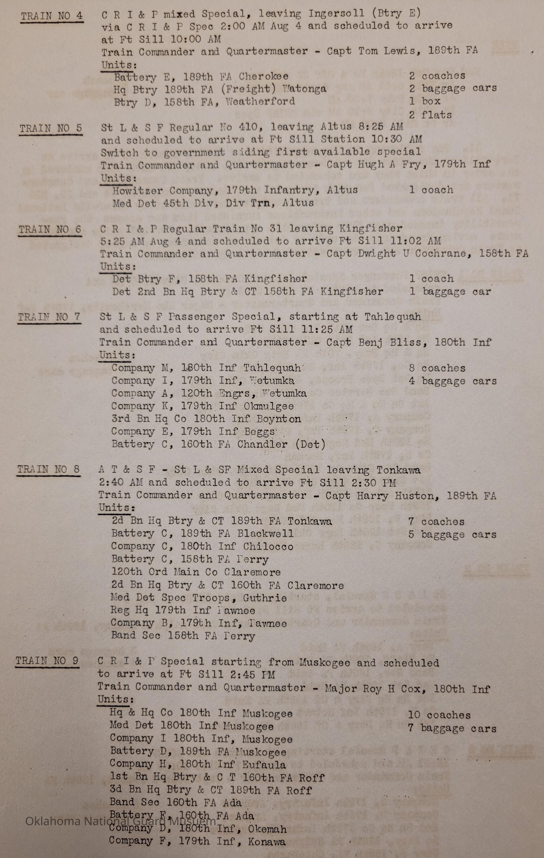 Adjutant General, Oklahoma City, Charles F. Barrett, Fort Sill, Camp of Instruction, Transportation, Train, Equipment, 45th Division Signal Company, 160th Ambulance Company, 120th Veterinary Company, 120th Medical Regiment, 189th Field Artillery, Camp Supply Detachment, Pawnee, George H. Davis, Leo Rundstein, Trucks, Advance Detachment, Earl Patterson, Charles D. Keller, Nelson J. Moore, Joe Stafford, Ted Haywood, Roger G. Maus, Will K. Danvers, Ponca City, John D. Jorden, 70th Field Artillery Brigade, 90th Infantry Brigade, 120th Engineers, 179th Infantry, Durant, 180th Infantry, 158th Field Artillery, Hugo, Lawton, Anadarko, Yale, 160th Field Artillery, Holdenville, Wewoka, 189th Field Artillery, Minco, Enid, Alva, Stillwater, Claremore, 45th Division Trains, Healdton, Rear Detachment, Ada, Band Section, Allen, Calvin, Altus, Ardmore, Chickasha, Atoka, McAlester, Blackwell, Boynton, Chandler, Cherokee, Ingersoll, Chilocco, Clinton, Cushing, Beggs, Durant, Edmond, Eufaula, Guthrie, Haskell, Hobart, Hominy, Hugo, Idabel, Kingfisher, Konawa, Marlow, Muskogee, Norman, Okemah, Okmulgee, Pawhuska, Pawnee, Perry, Roff, Sperry, Sulphur, Tahlequah, Tishomingo, Tonkawa, Tulsa, Wagoner, Watonga, Weatherford, Wetumka, Wewoka, Abe Herskowitz, Ralph L. Rumely, John C. Powell, Tom Lewis, Dwight U Cochrane, Benjamin Bliss, Harry Huston, Roy H. Cox, James A. Bell, Wylie C. Turner, William M. George