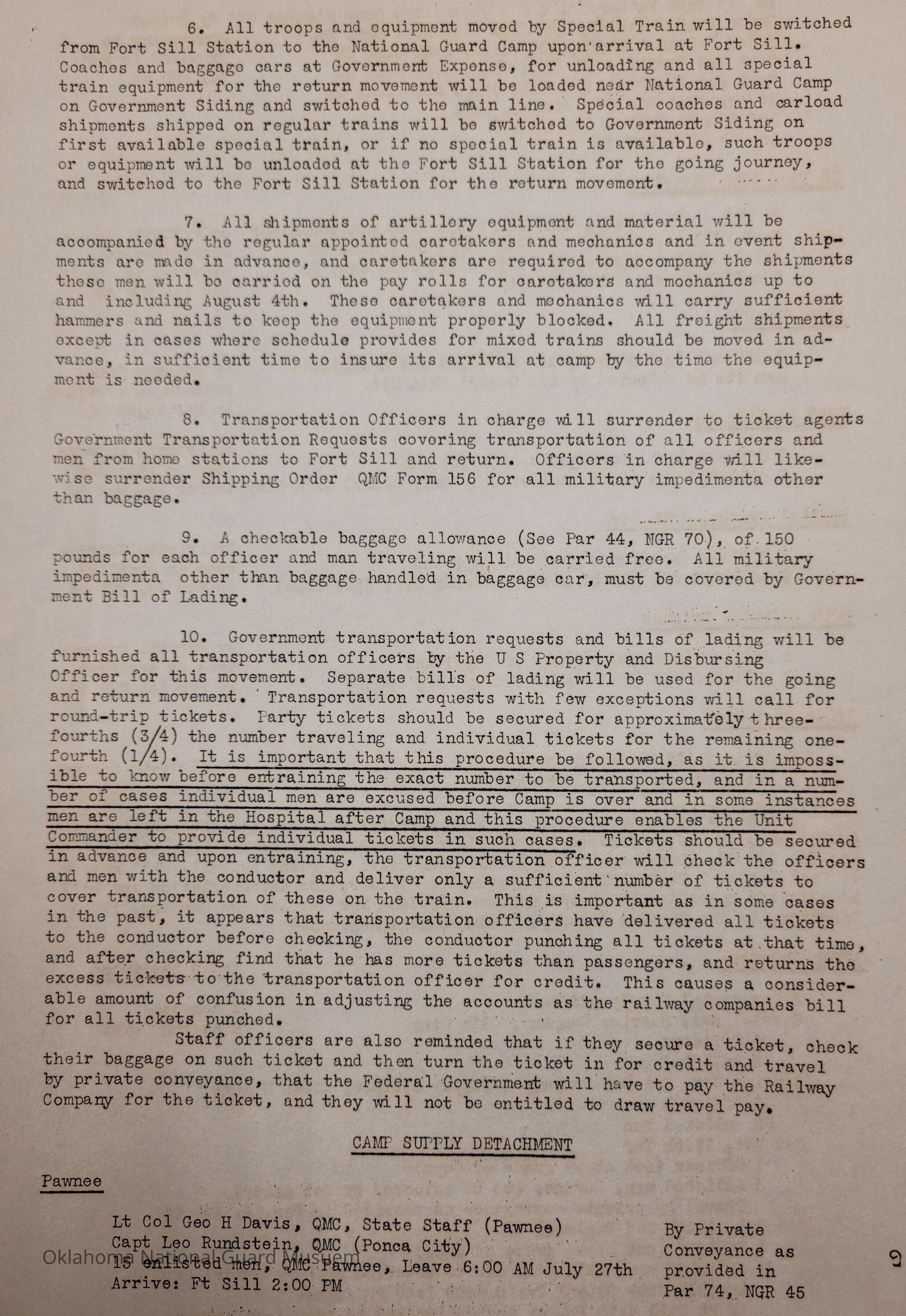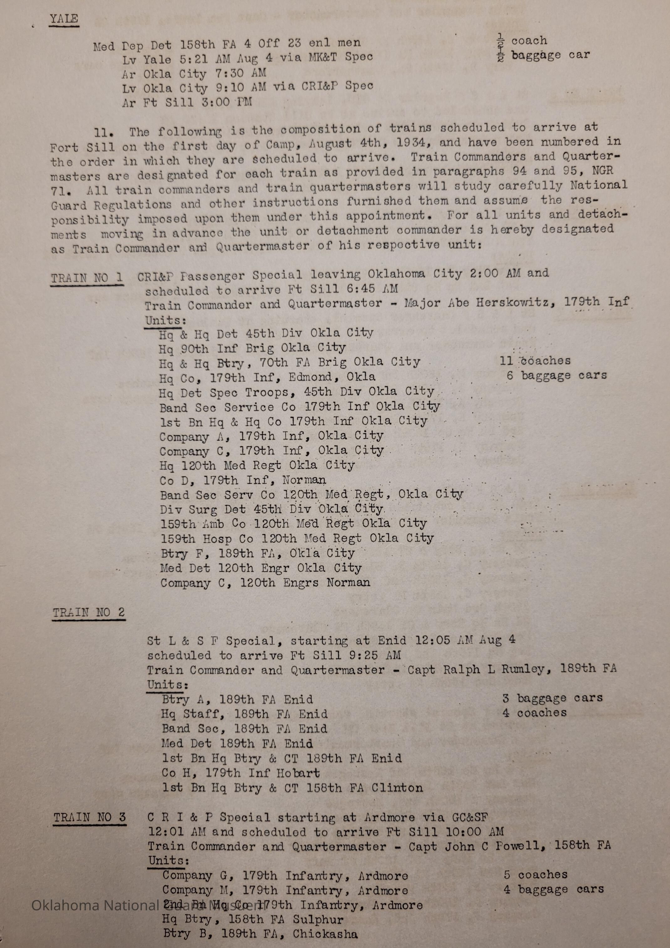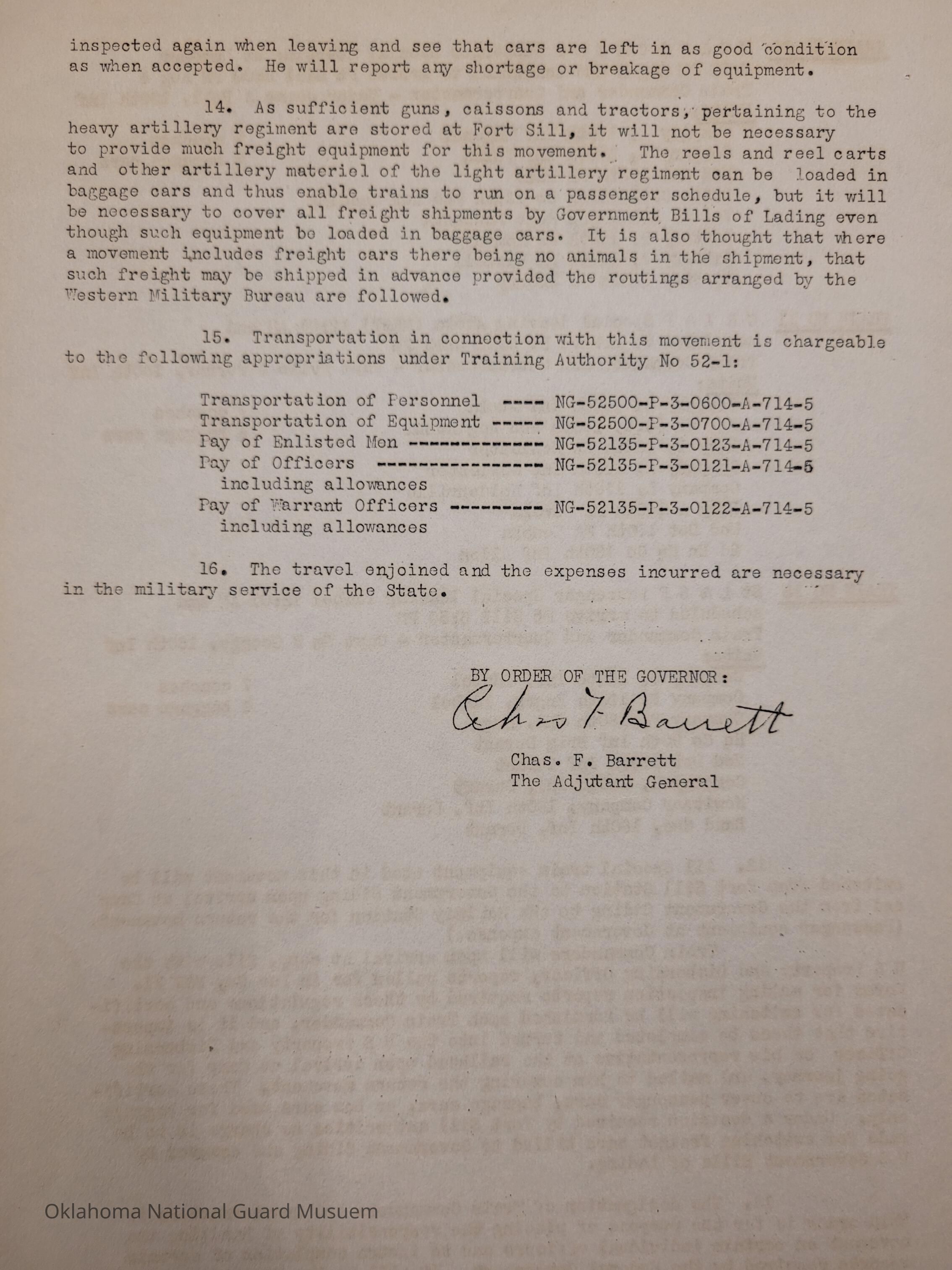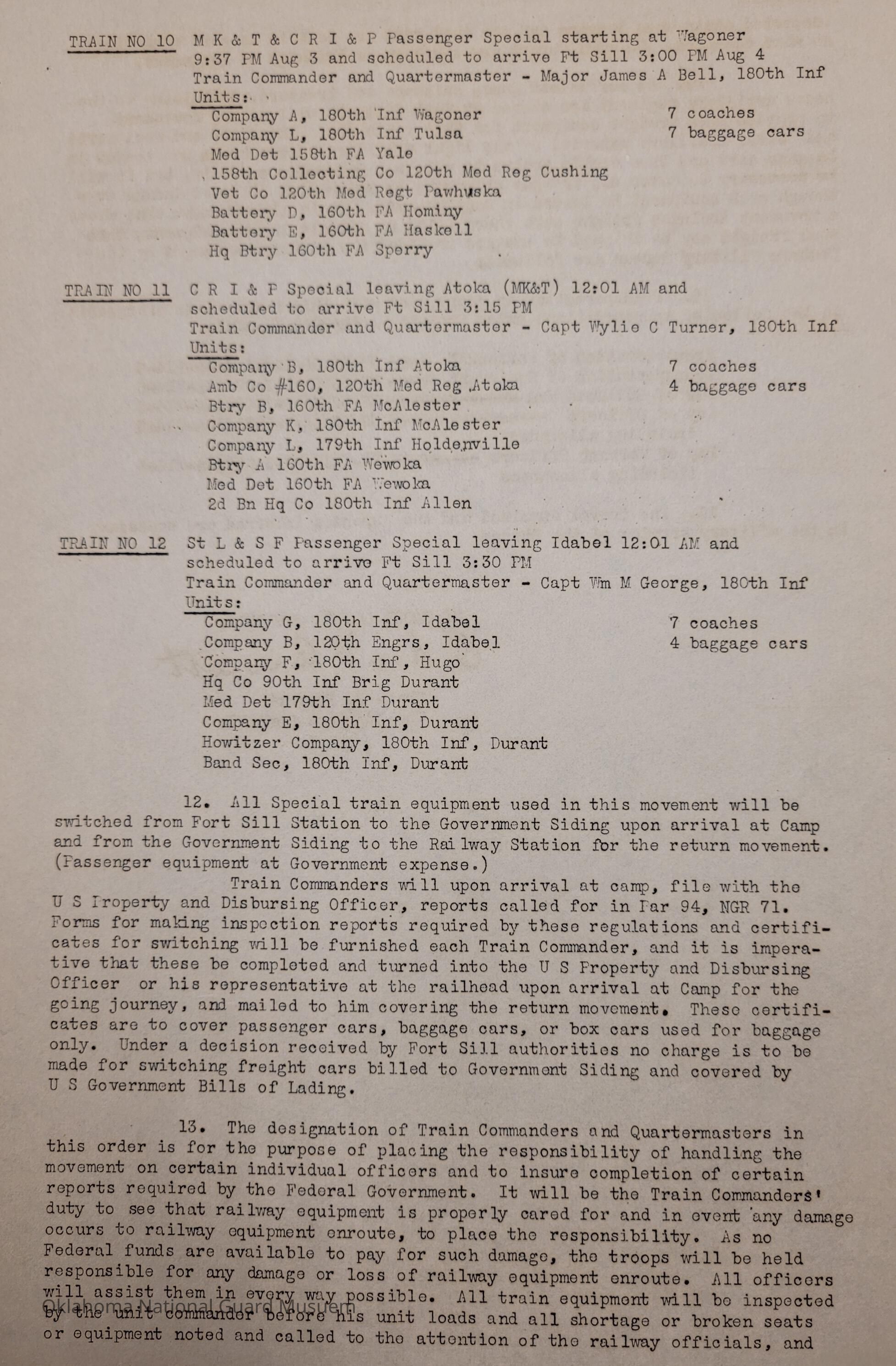 Adjutant General, Oklahoma City, Charles F. Barrett, Fort Sill, Camp of Instruction, Transportation, Train, Equipment, 45th Division Signal Company, 160th Ambulance Company, 120th Veterinary Company, 120th Medical Regiment, 189th Field Artillery, Camp Supply Detachment, Pawnee, George H. Davis, Leo Rundstein, Trucks, Advance Detachment, Earl Patterson, Charles D. Keller, Nelson J. Moore, Joe Stafford, Ted Haywood, Roger G. Maus, Will K. Danvers, Ponca City, John D. Jorden, 70th Field Artillery Brigade, 90th Infantry Brigade, 120th Engineers, 179th Infantry, Durant, 180th Infantry, 158th Field Artillery, Hugo, Lawton, Anadarko, Yale, 160th Field Artillery, Holdenville, Wewoka, 189th Field Artillery, Minco, Enid, Alva, Stillwater, Claremore, 45th Division Trains, Healdton, Rear Detachment, Ada, Band Section, Allen, Calvin, Altus, Ardmore, Chickasha, Atoka, McAlester, Blackwell, Boynton, Chandler, Cherokee, Ingersoll, Chilocco, Clinton, Cushing, Beggs, Durant, Edmond, Eufaula, Guthrie, Haskell, Hobart, Hominy, Hugo, Idabel, Kingfisher, Konawa, Marlow, Muskogee, Norman, Okemah, Okmulgee, Pawhuska, Pawnee, Perry, Roff, Sperry, Sulphur, Tahlequah, Tishomingo, Tonkawa, Tulsa, Wagoner, Watonga, Weatherford, Wetumka, Wewoka, Abe Herskowitz, Ralph L. Rumely, John C. Powell, Tom Lewis, Dwight U Cochrane, Benjamin Bliss, Harry Huston, Roy H. Cox, James A. Bell, Wylie C. Turner, William M. George