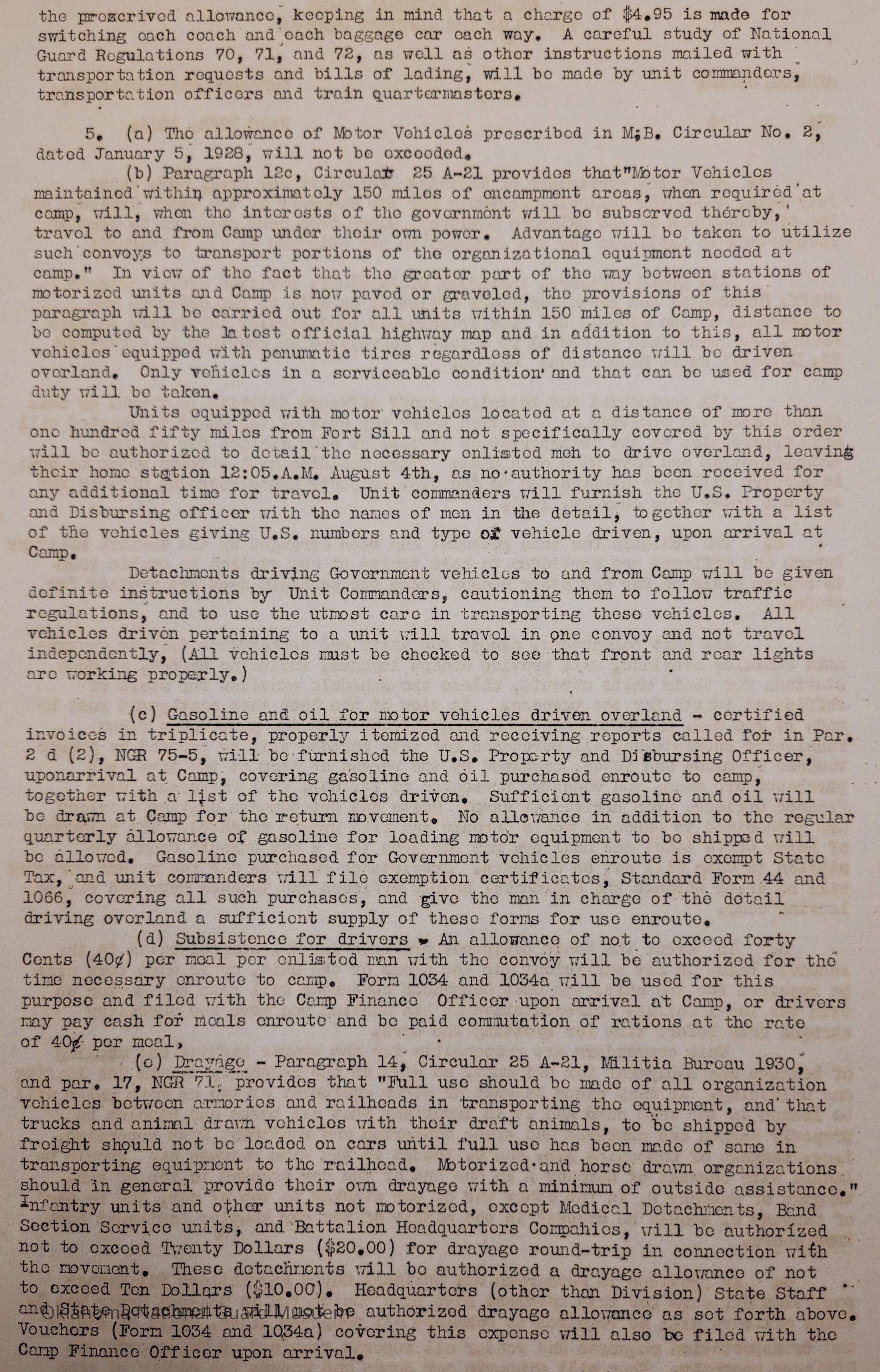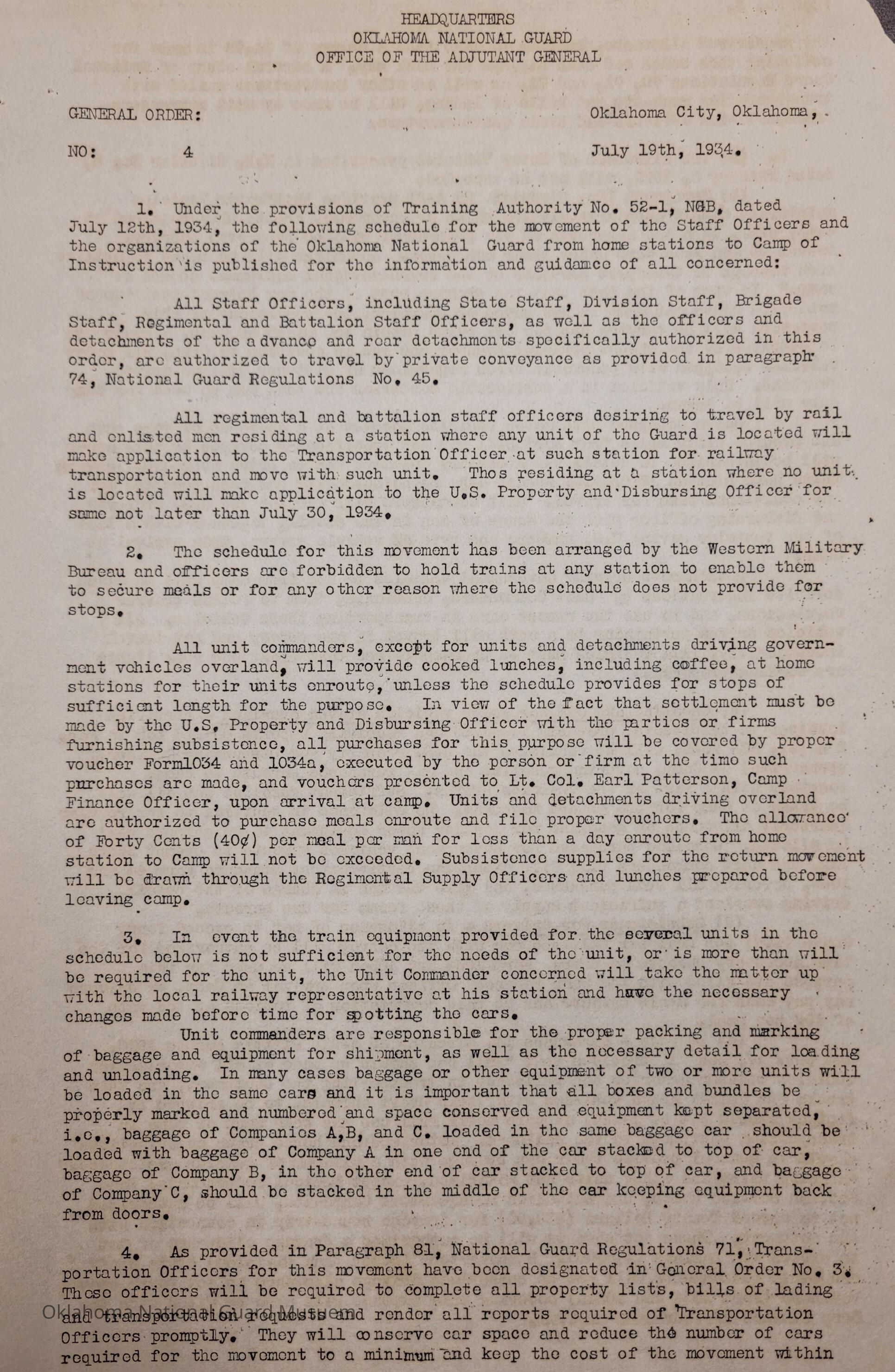 General Order #4 from Headquarters Adjutant General's Office in Oklahoma City. The order details the schedule of transportation from home stations to Fort Sill for the Camp of Instruction.Date(s) of Creation