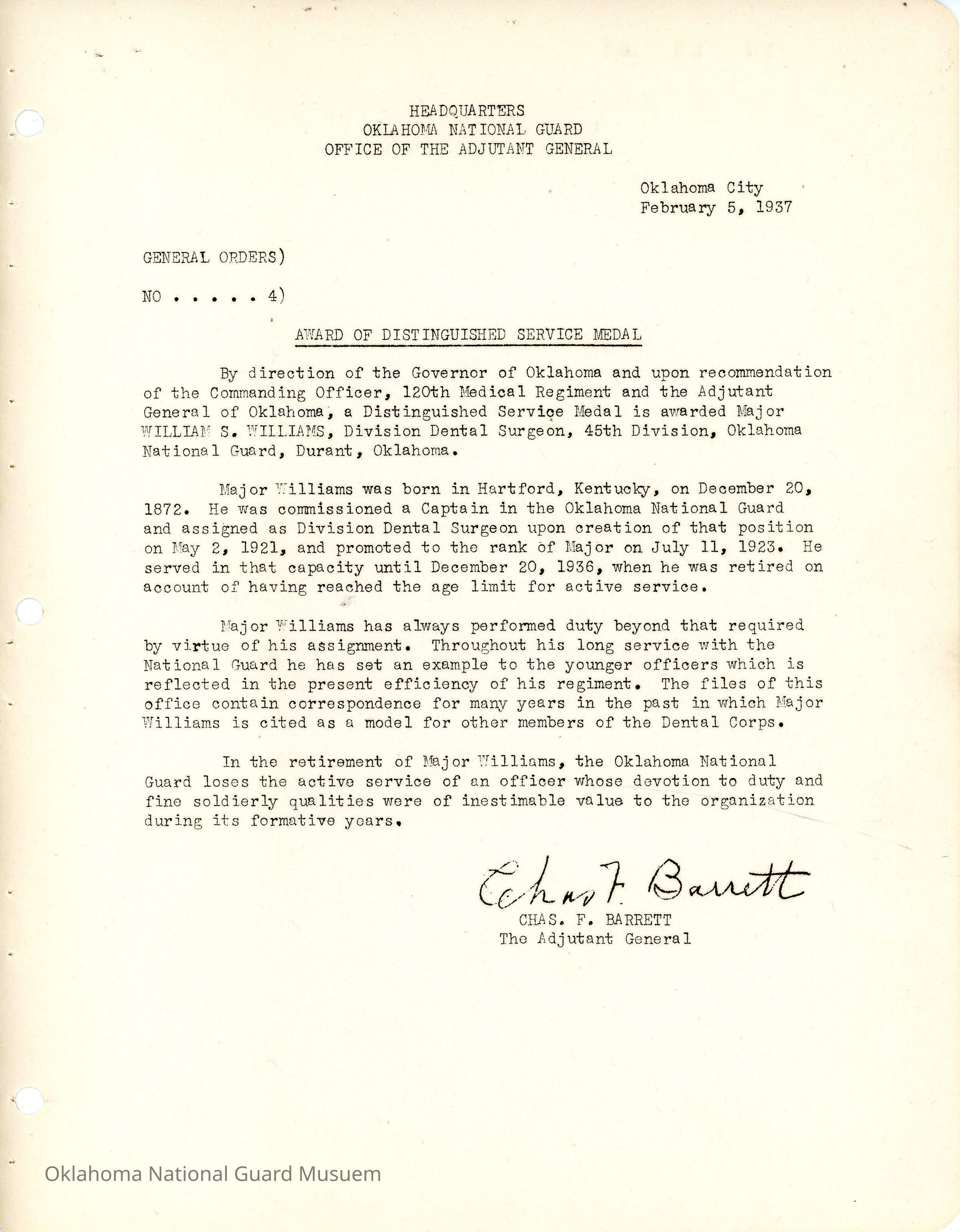 General Order #4 from Headquarters Adjutant General's Office in Oklahoma City. The order awards the Distinguished Service Medal to William S. Williams- the Division Dental SurgeonDate(s) of Creation