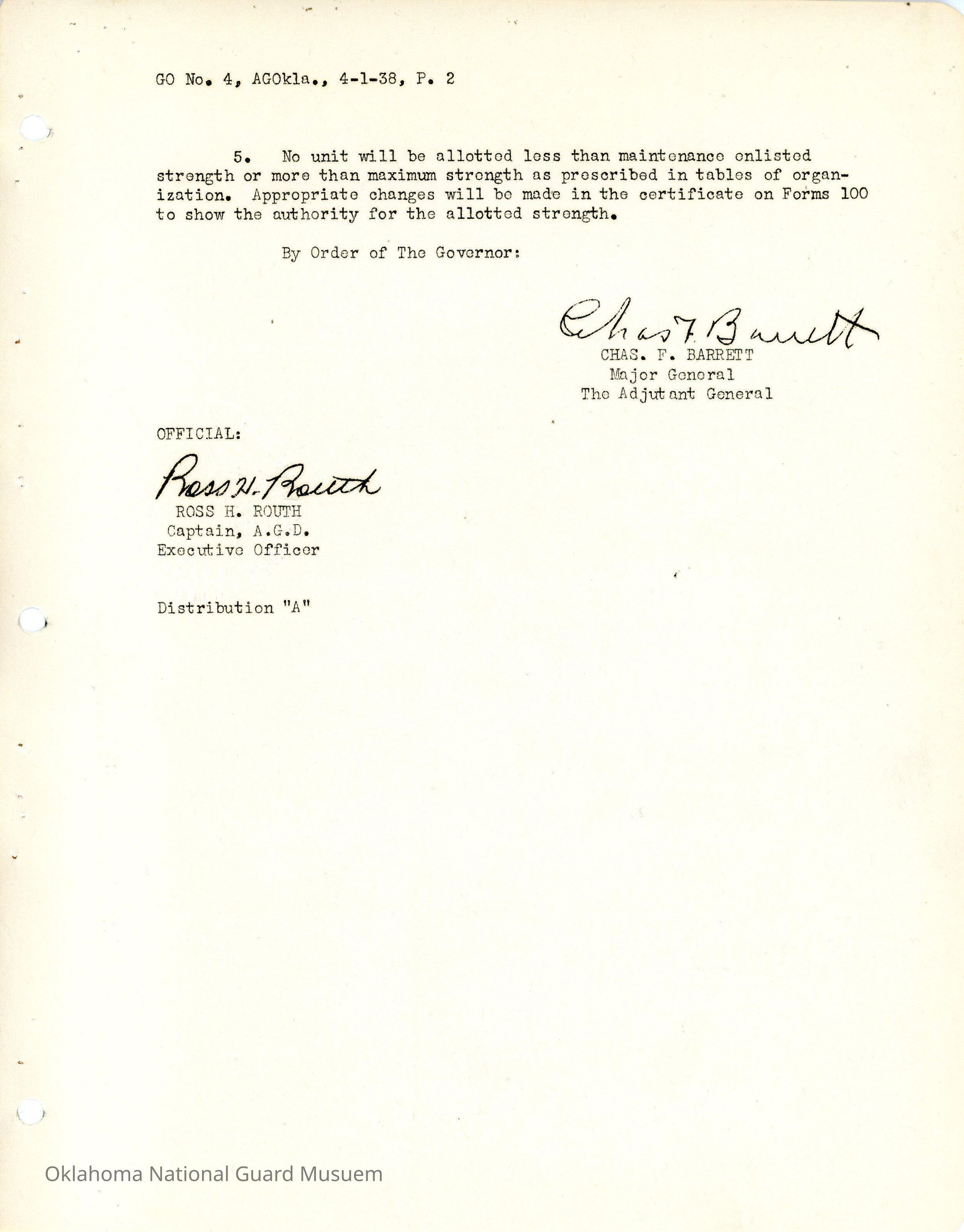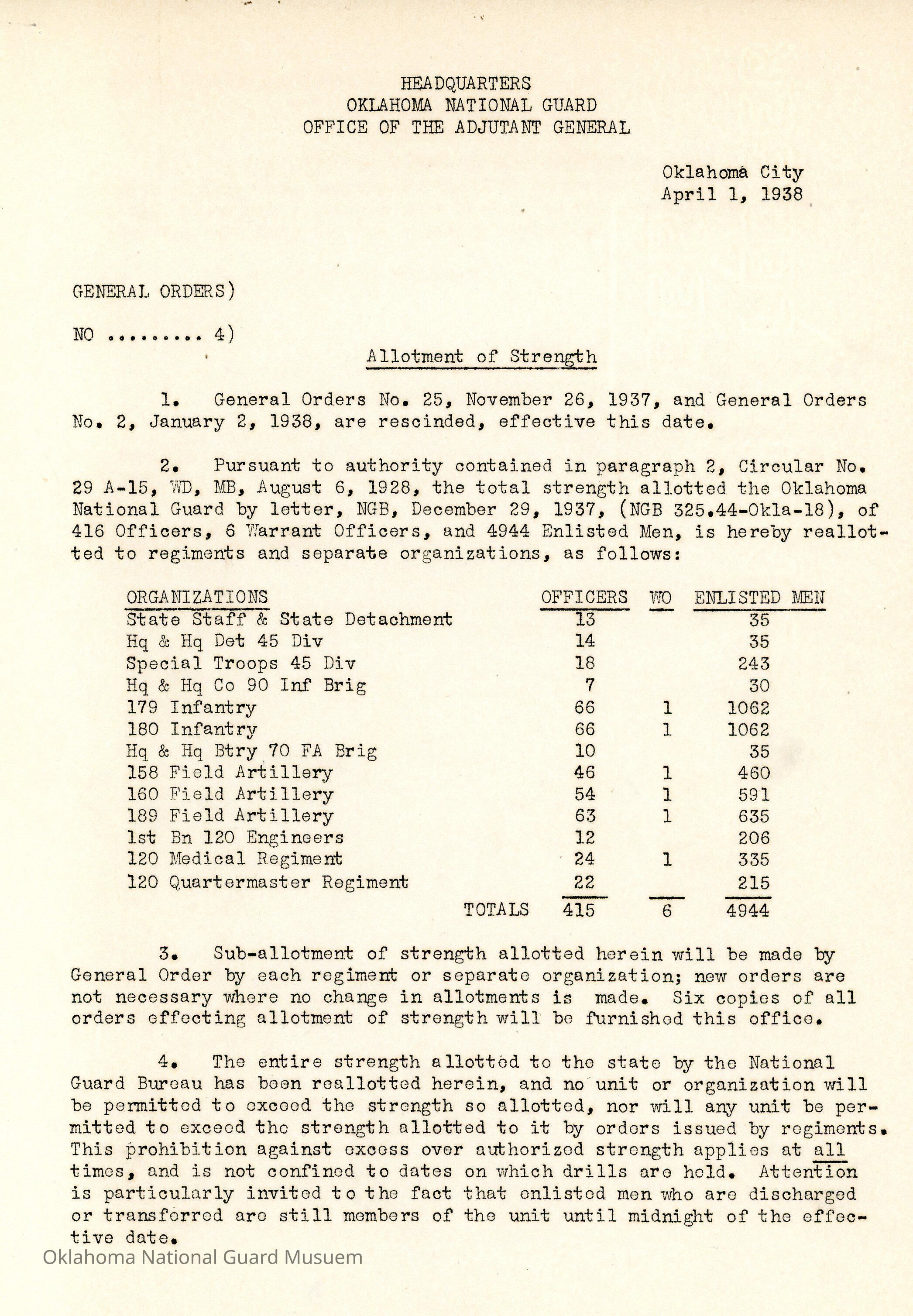 General Order #4 from Headquarters Adjutant General's Office in Oklahoma City. The order rescinds General Order # 25 1937 and General Order #2 1938 and issues new authorized strength numbers for the Oklahoma National GuardDate(s) of Creation