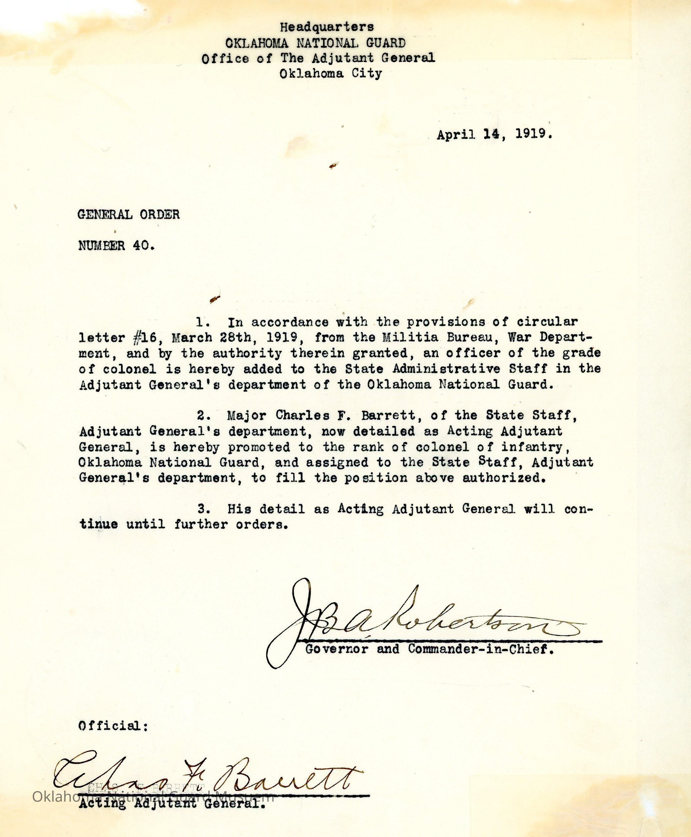 General Order #40 from Headquarters Adjutant General's Office in Oklahoma City. The order promotes Charles Barrett to Colonel and assigned to the State Staff Adjutant General's department.Date(s) of Creation