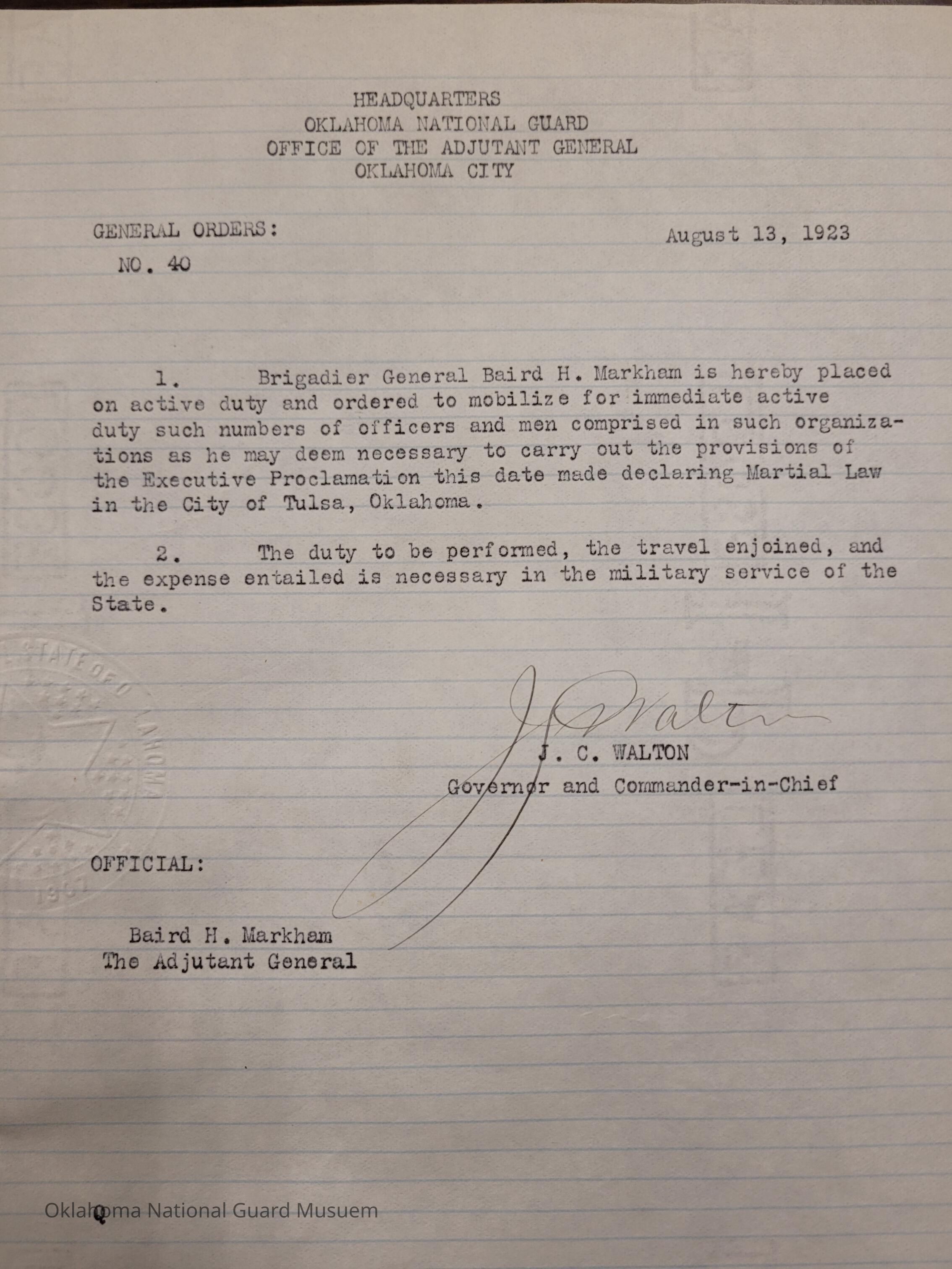 General Order #40 from Headquarters Adjutant General's Office in Oklahoma City. The order places Baird H. Markham on active duty to mobilize men to carry out the martial law order in TulsaDate(s) of Creation