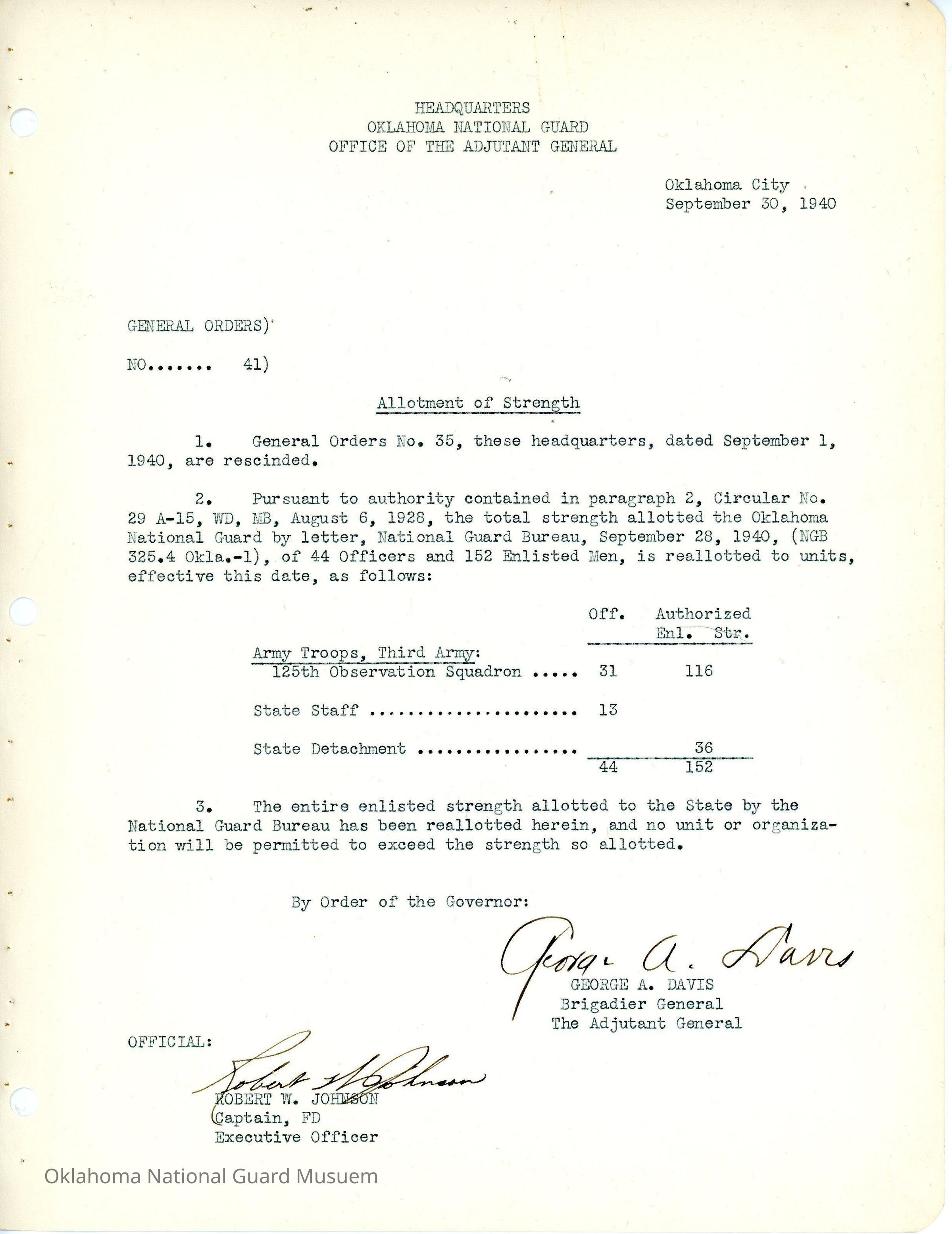 Adjutant General, Oklahoma City, George A. Davis, Robert W. Johnson, 125th Observation Squadron, Allotment of Strength, Rescind