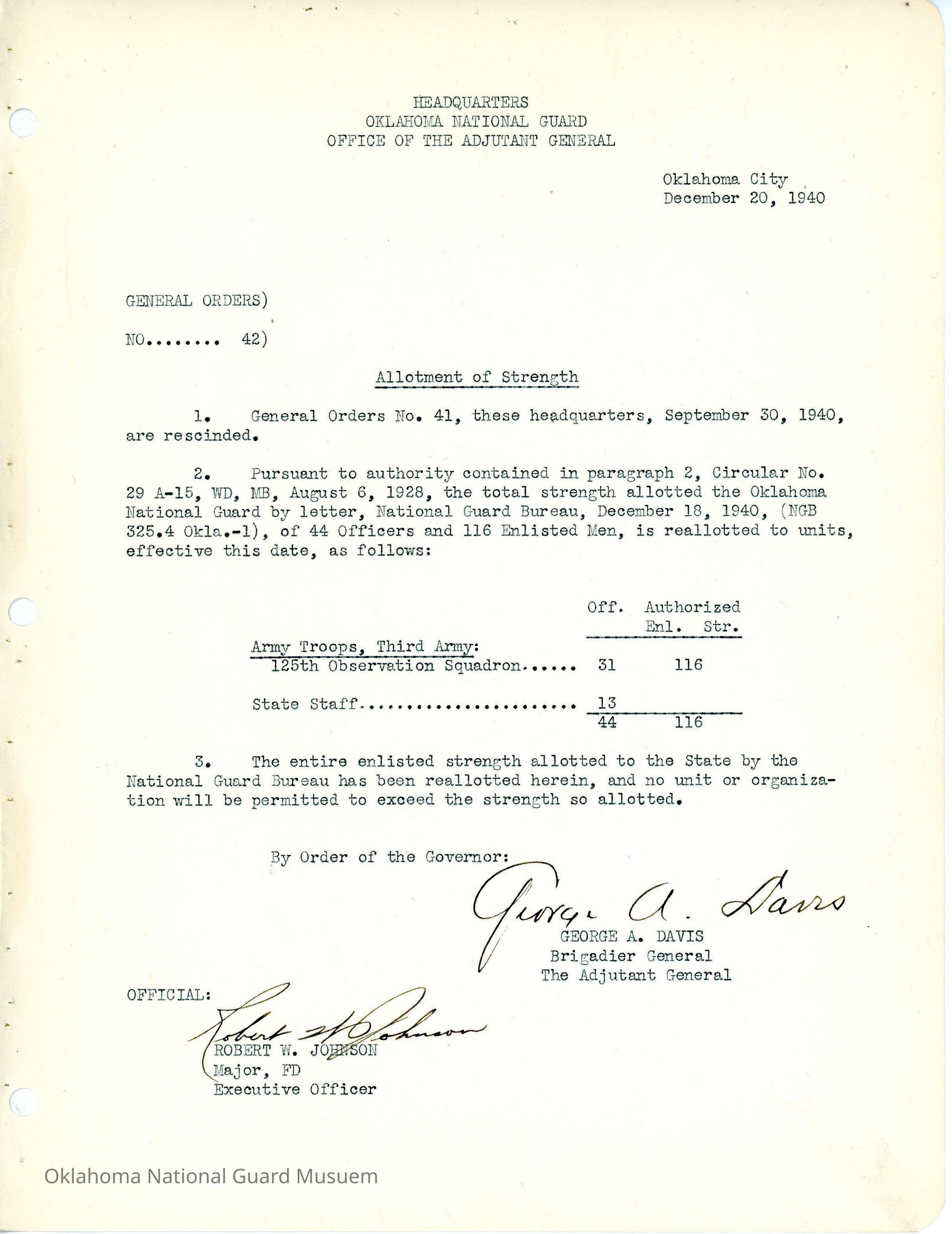 Adjutant General, Oklahoma City, George A. Davis, Robert W. Johnson, 125th Observation Squadron, Allotment of Strength, Rescind