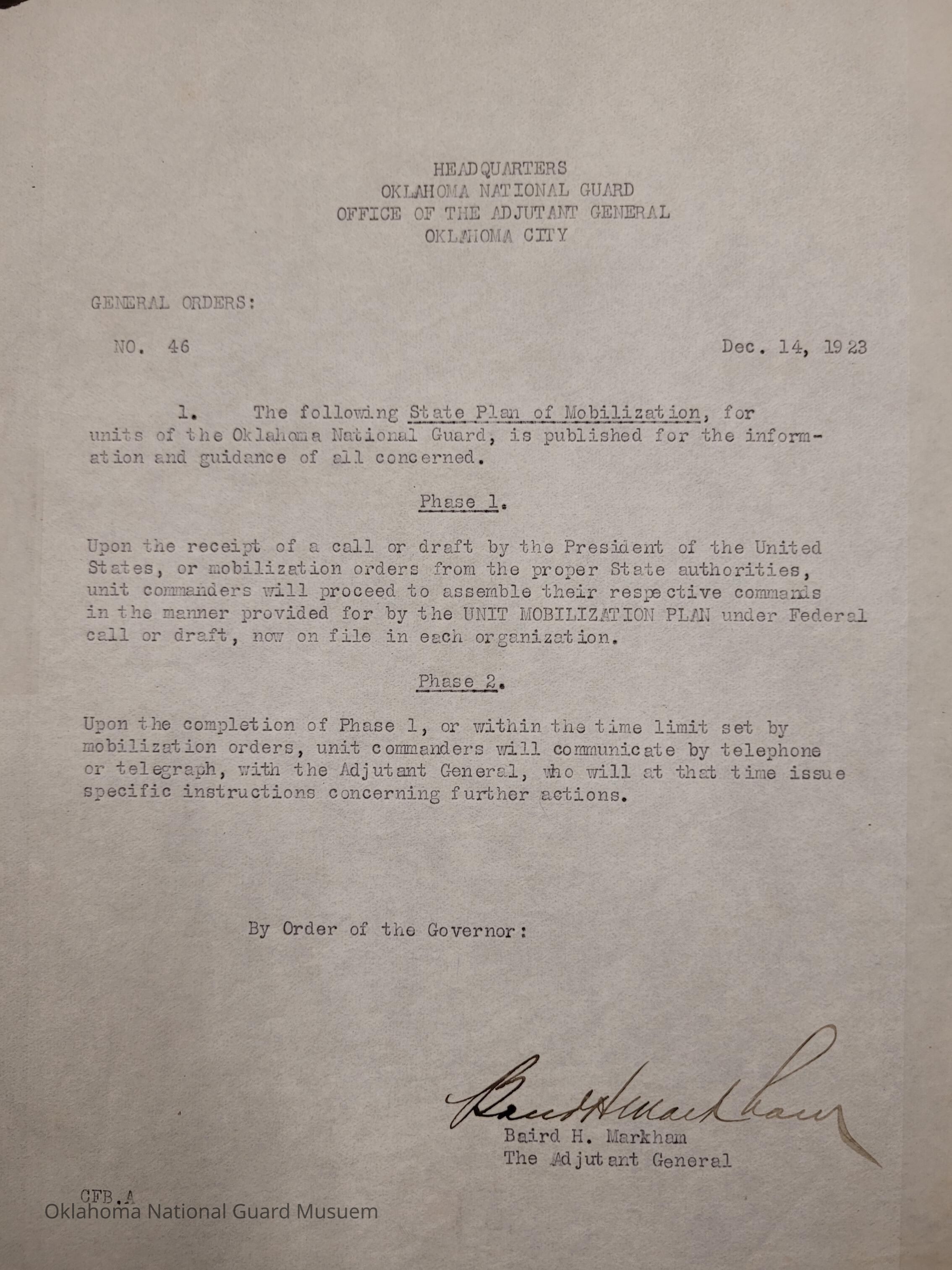 General Order #46 from Headquarters Adjutant General's Office in Oklahoma City. The order publishes the State Plan of Mobilization for the Oklahoma National GuardDate(s) of Creation