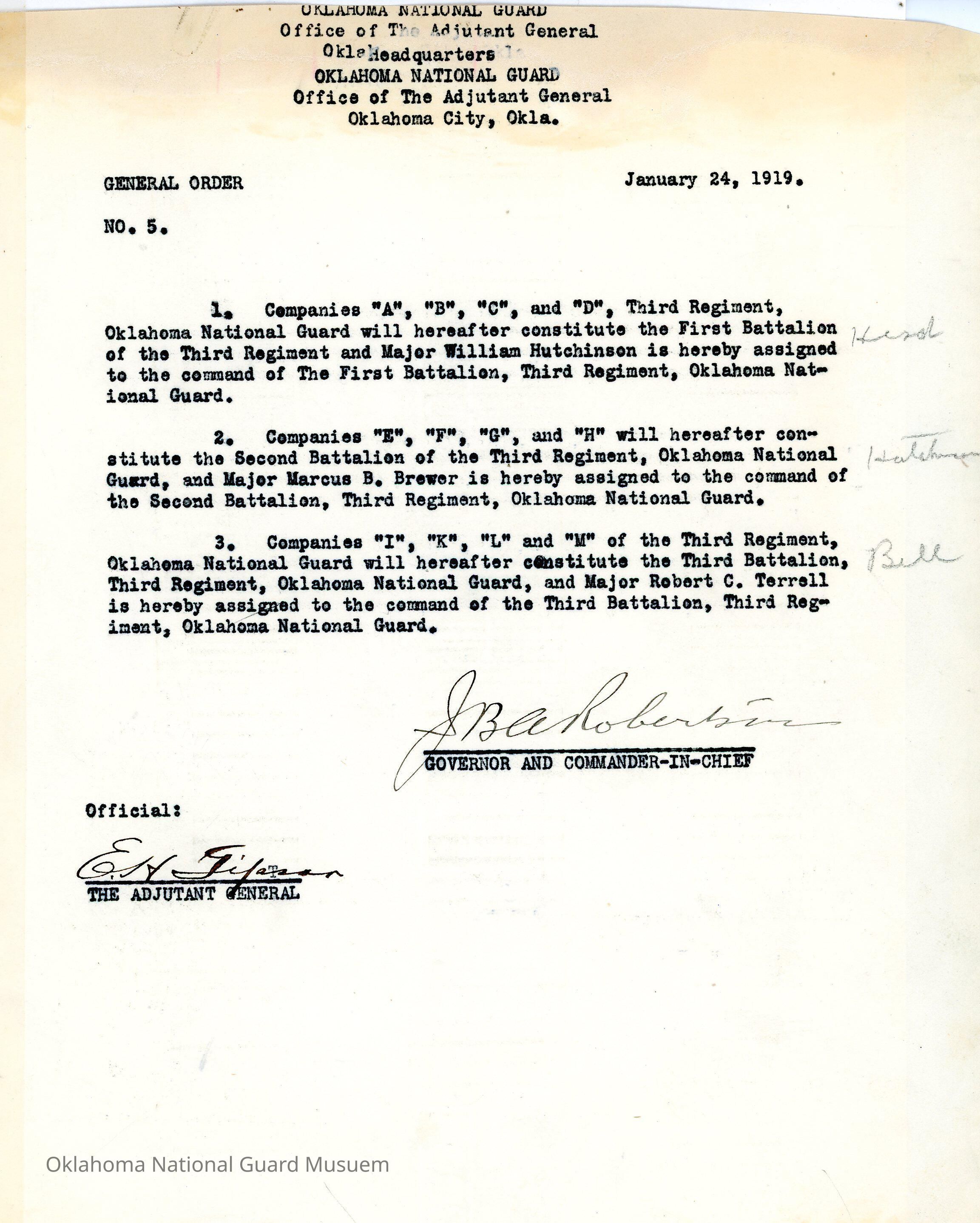 Adjutant General, Oklahoma City, Ennis H. Gipson, James B.A. Robertson, First Battalion, Third Regiment, William Hutchinson, Second Battalion, Marcus B. Brewer, Third Battalion, Robert C. Terrell