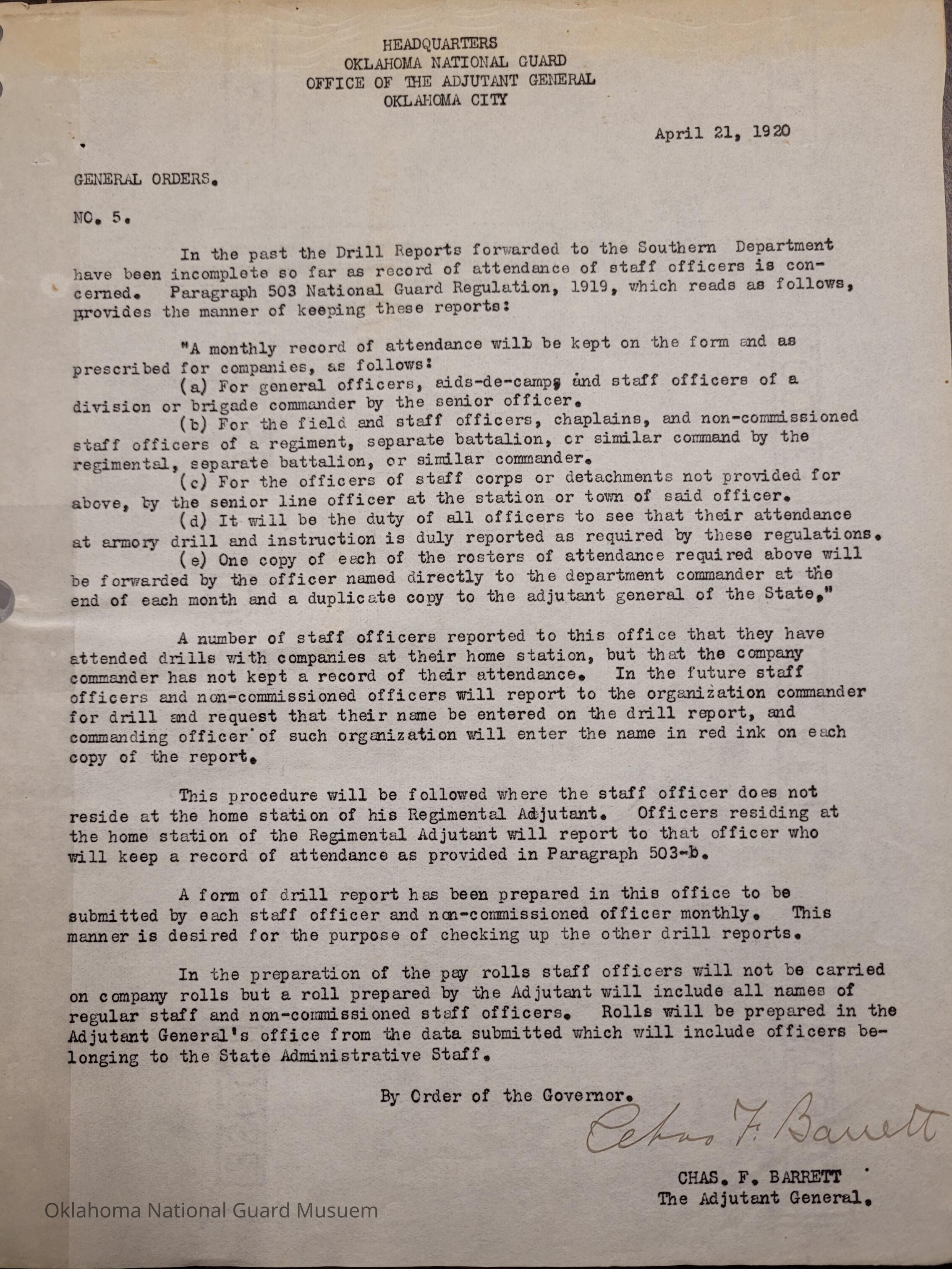 General Order #5 from Headquarters Adjutant General's Office in Oklahoma City. The order addresses the inconstancies in filling out attendance records for drills and sets a standard for how they should be filled out in the futureDate(s) of Creation