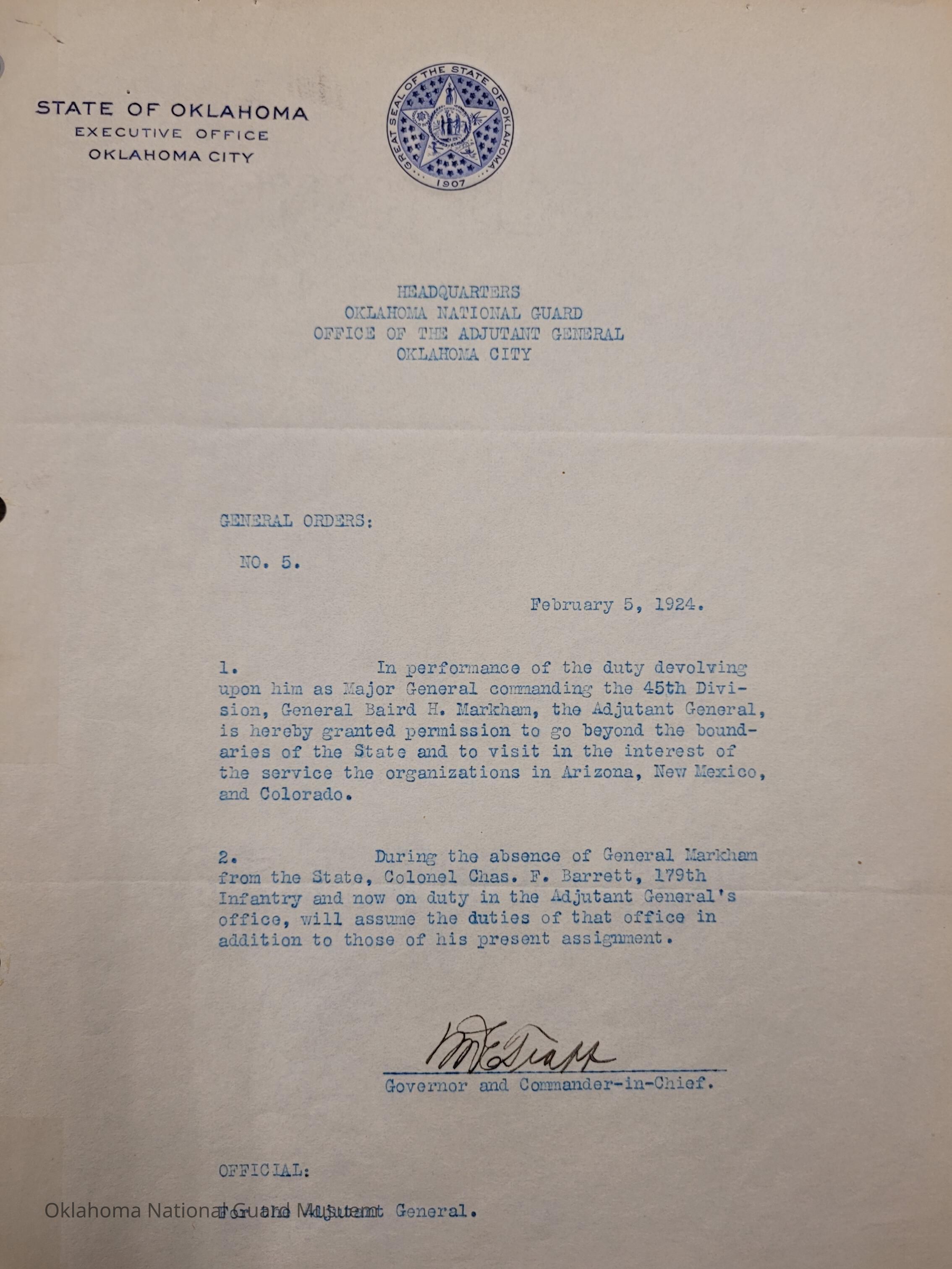 General Order #5 from Headquarters Adjutant General's Office in Oklahoma City. The order grants permission to Baird H. Markham to visit Arizona, New Mexico, and Colorado in the interest of the 45th Division. Charles F. Barrett will fill in as acting Adjutant General while Markham is awayDate(s) of Creation
