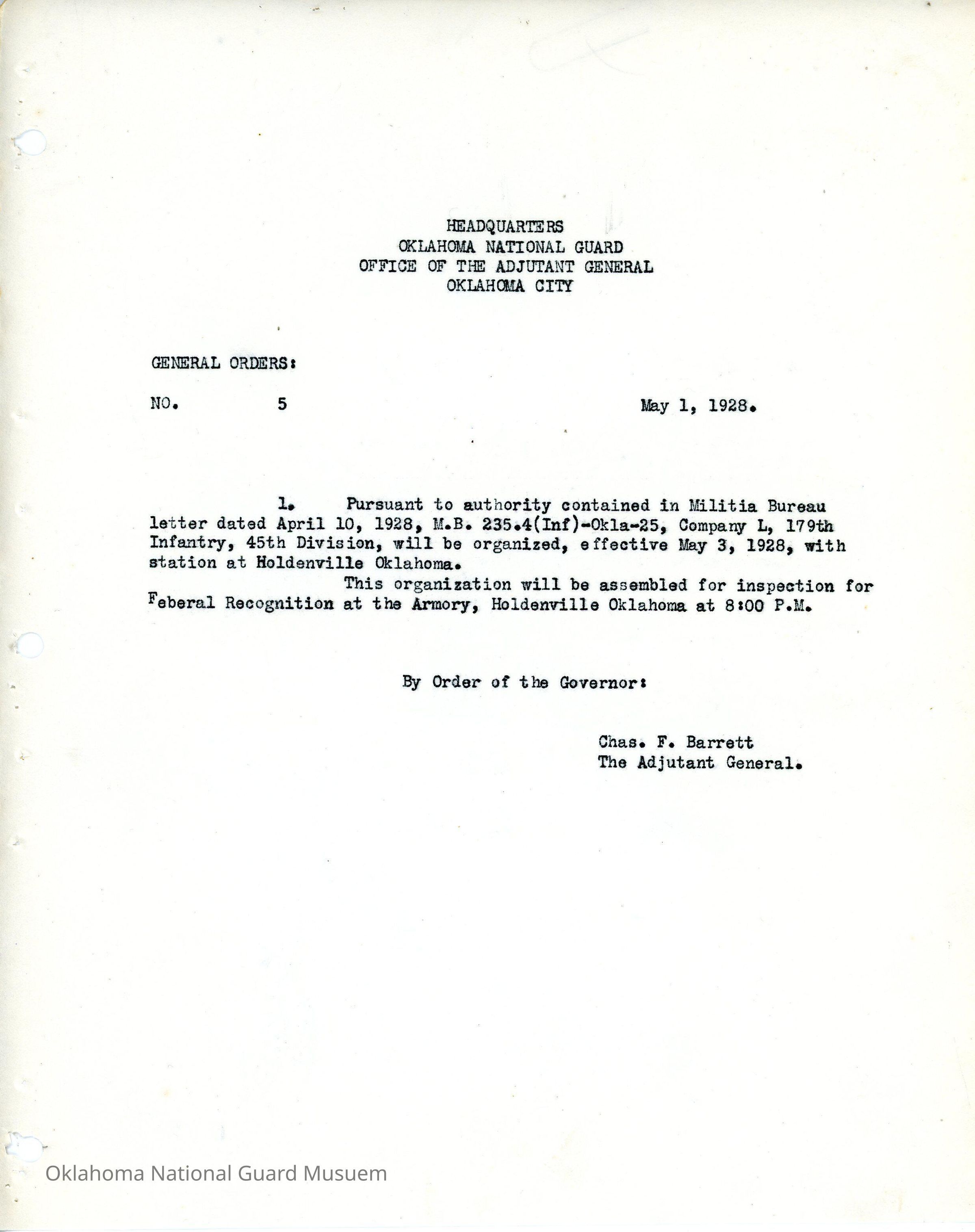 General Order #5 from Headquarters Adjutant General's Office in Oklahoma City. The order organizes Company L 179th Infantry with station in HoldenvilleDate(s) of Creation