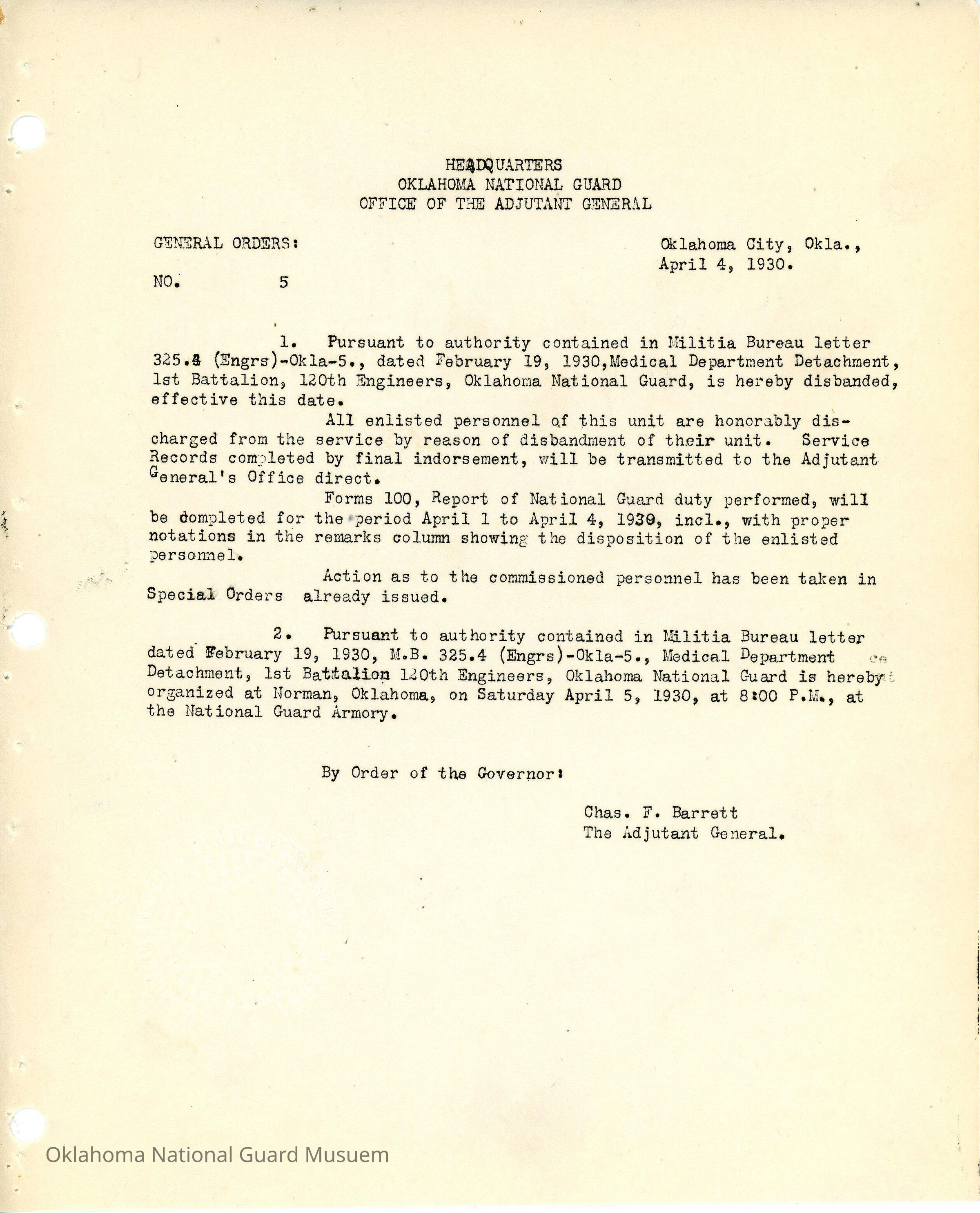 General Order #5 from Headquarters Adjutant General's Office in Oklahoma City. The order disbands the Medical Department Detachment 1st Battalion 120th Engineers and reorganizes them at Norman.Date(s) of Creation