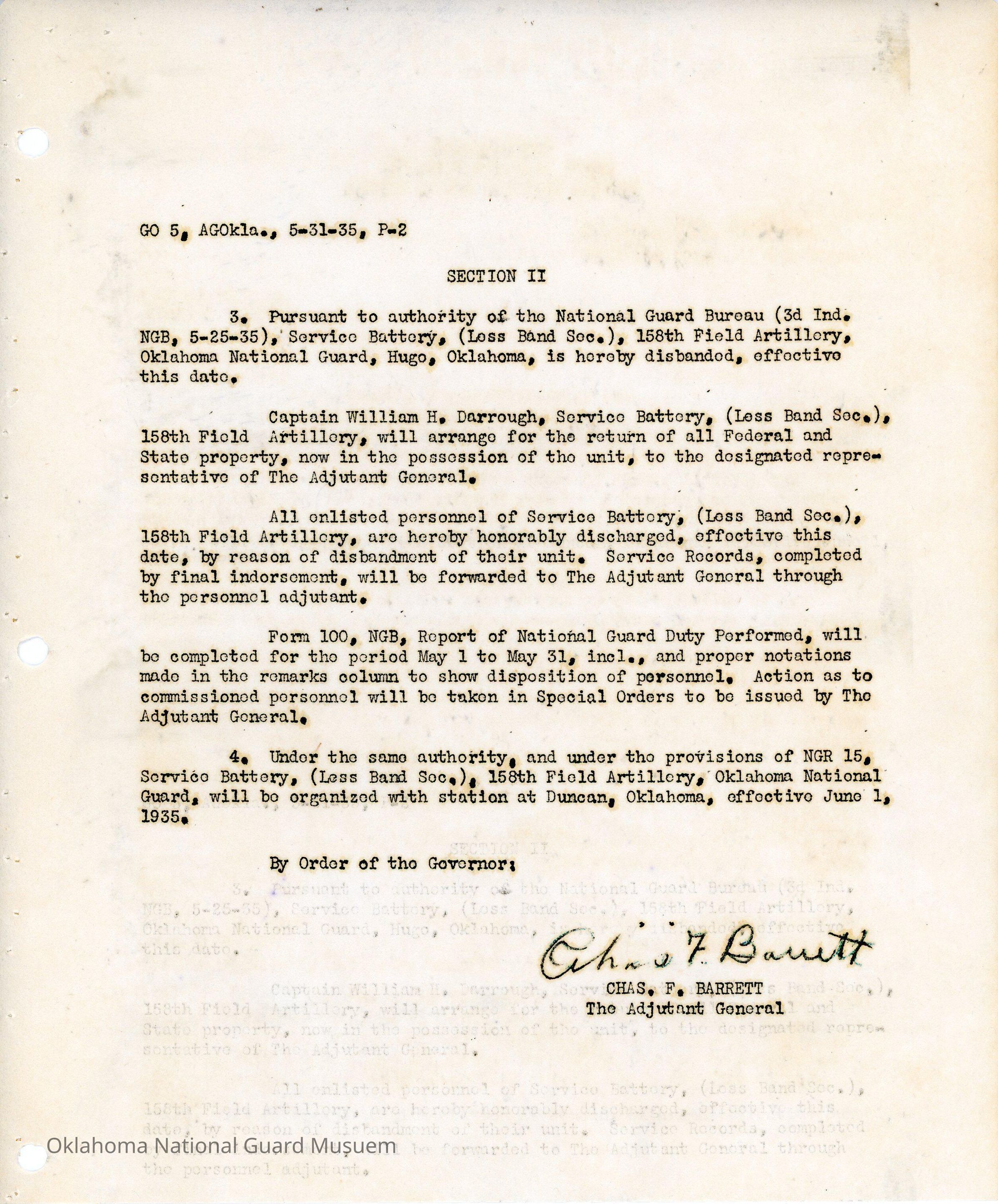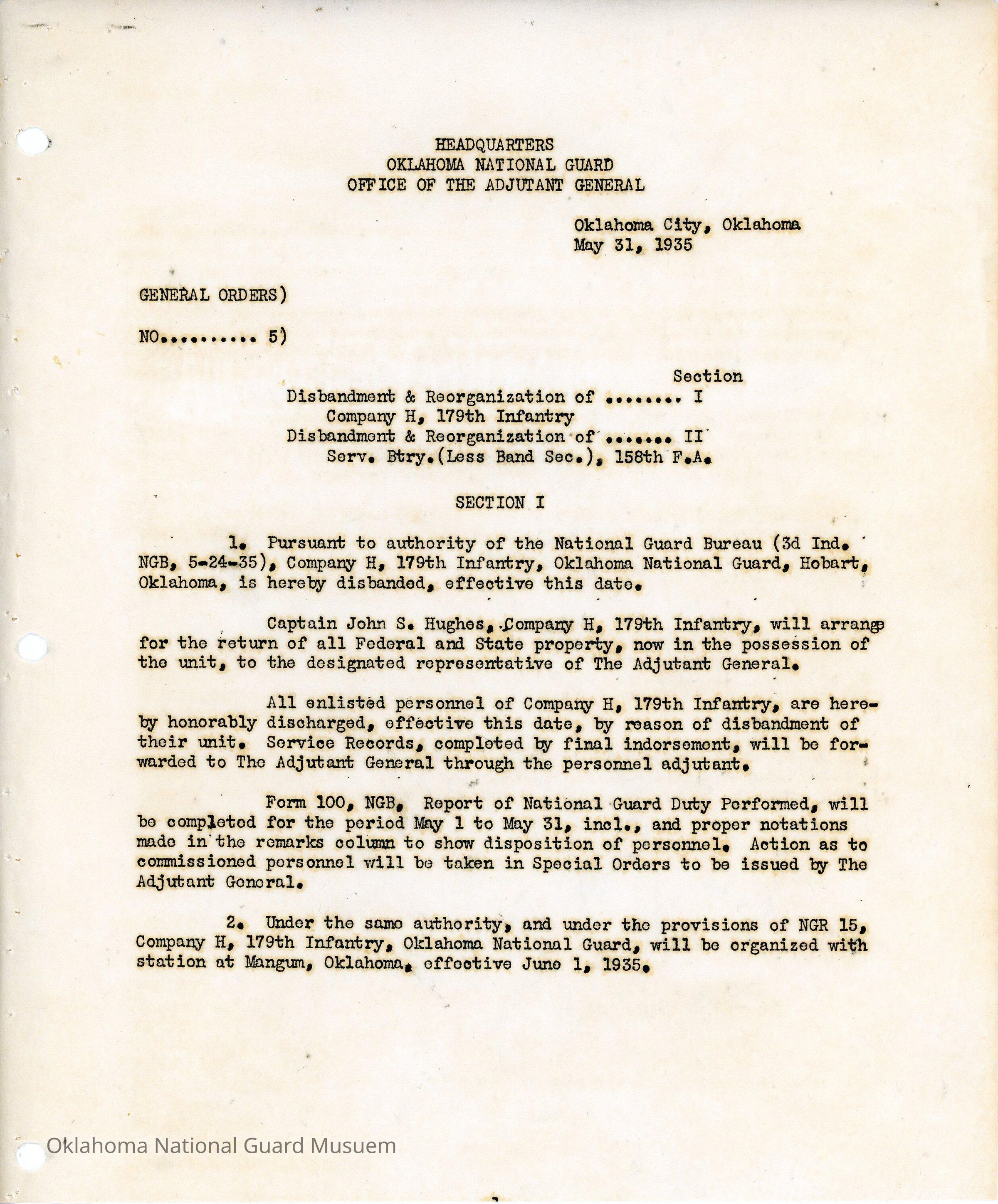 General Order #5 from Headquarters Adjutant General's Office in Oklahoma City. The order disbands Company H 179th Infantry stationed in Hobart and re-organizes them in Mangum. The order also disbands Service Battery (less Band Section) 158th Field Artillery stationed in Hugo and re-organizes them in DuncanDate(s) of Creation