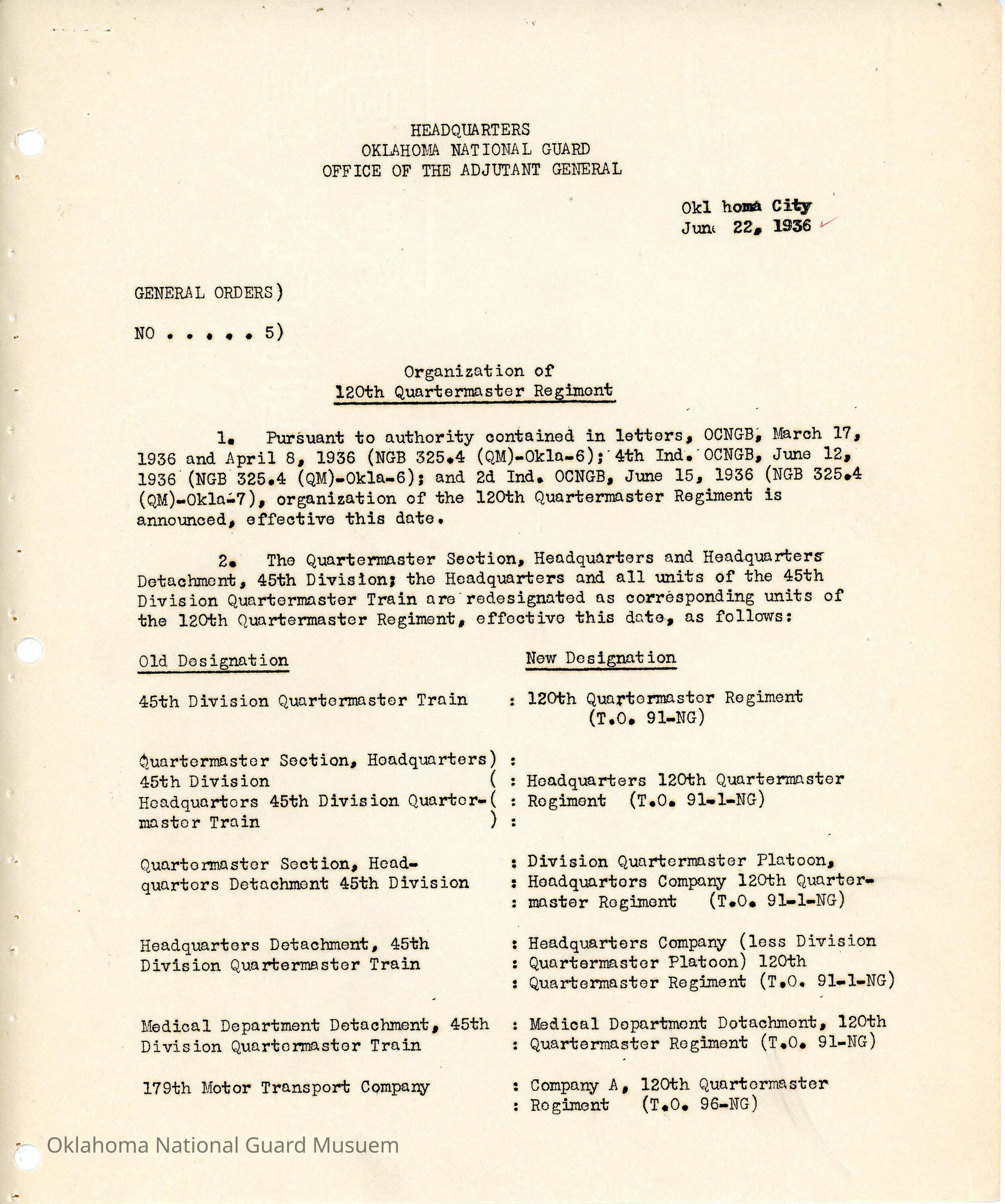 General Order #5 from Headquarters Adjutant General's Office in Oklahoma City. The order organizes the 120th Quartermaster Regiment and lists the units that comprise the regimentDate(s) of Creation