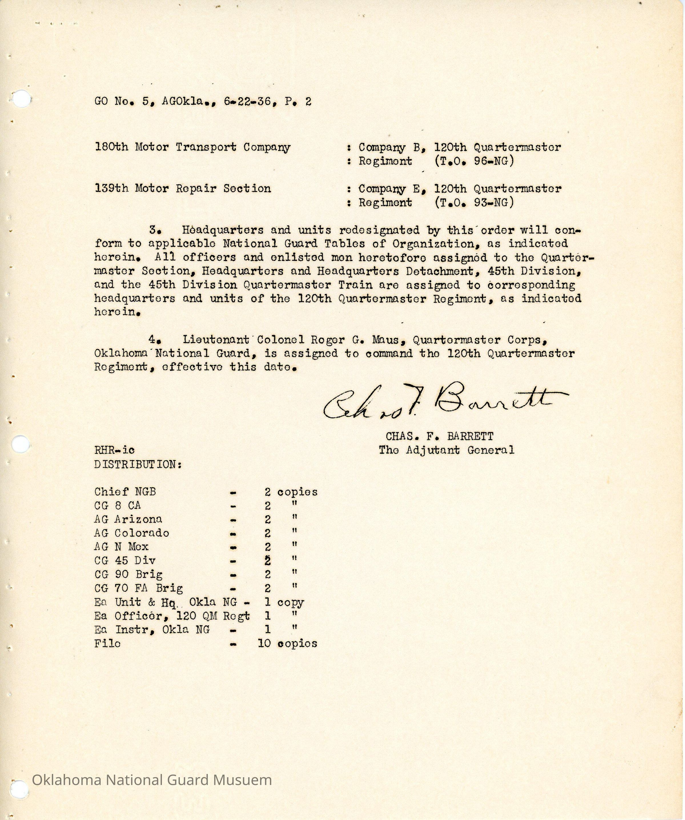 Adjutant General, Oklahoma City, Charles F. Barrett, 120th Quartermaster Regiment, 45th Division, Quartermaster Train, Roger G. Maus