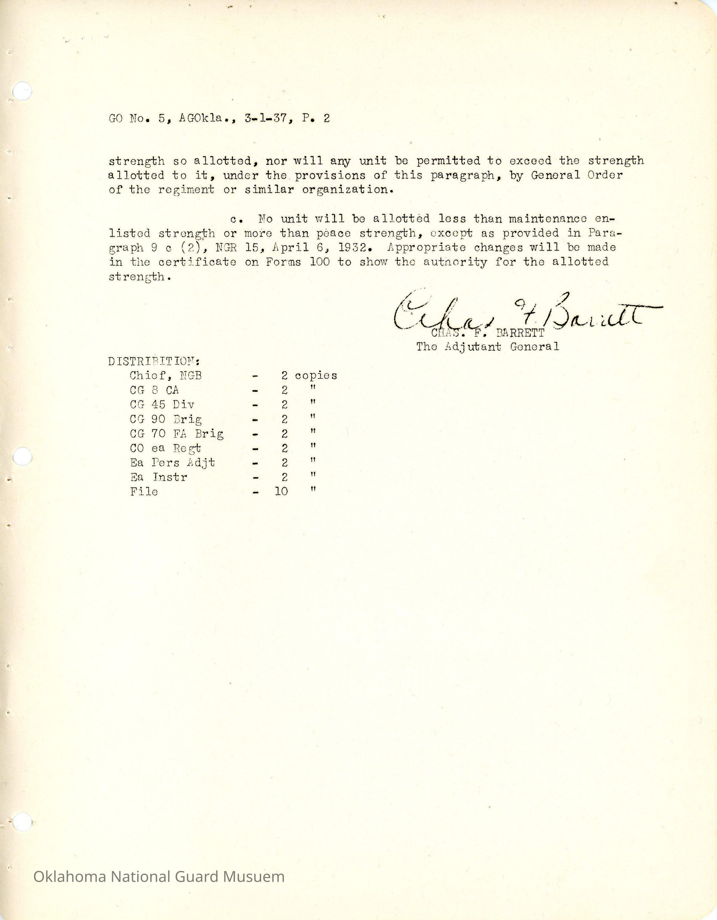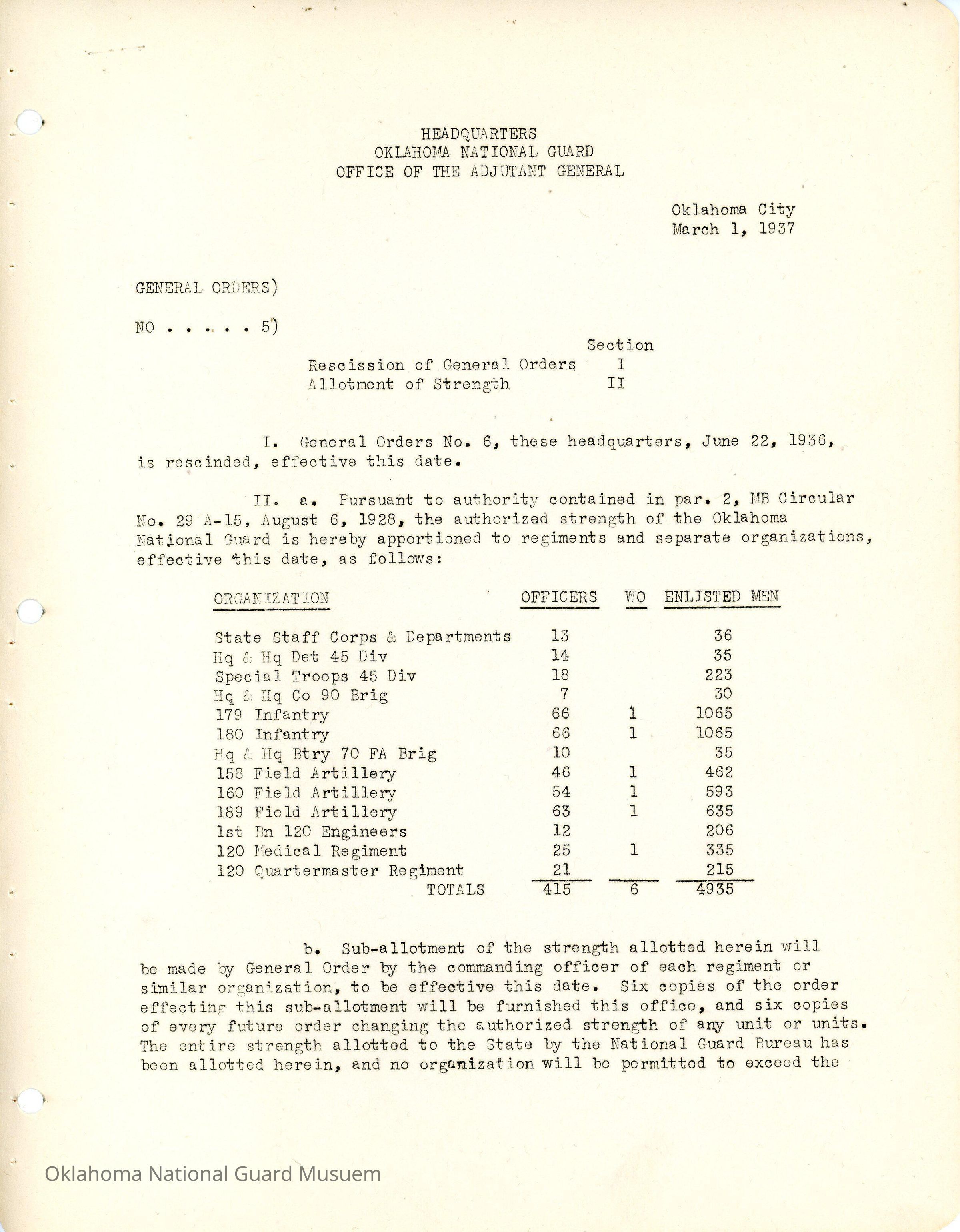 General Order #5 from Headquarters Adjutant General's Office in Oklahoma City. The order rescinds General Order #6 1936 and details the new strength numbers of the Oklahoma National GuardDate(s) of Creation
