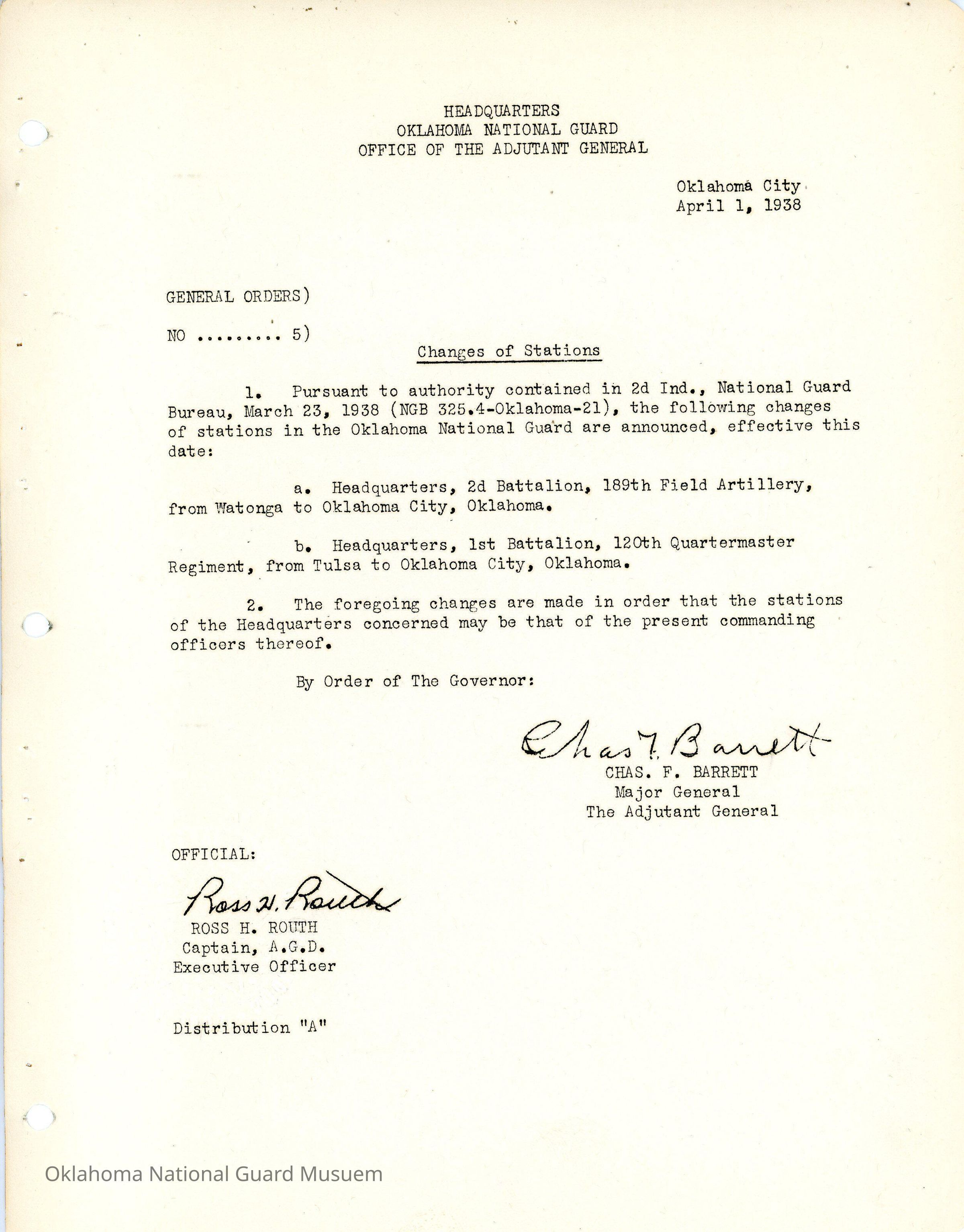 Adjutant General, Oklahoma City, Charles F. Barrett, Ross H. Routh, Change of Station, 189th Field Artillery, Watonga, Tulsa, National Guard Bureau