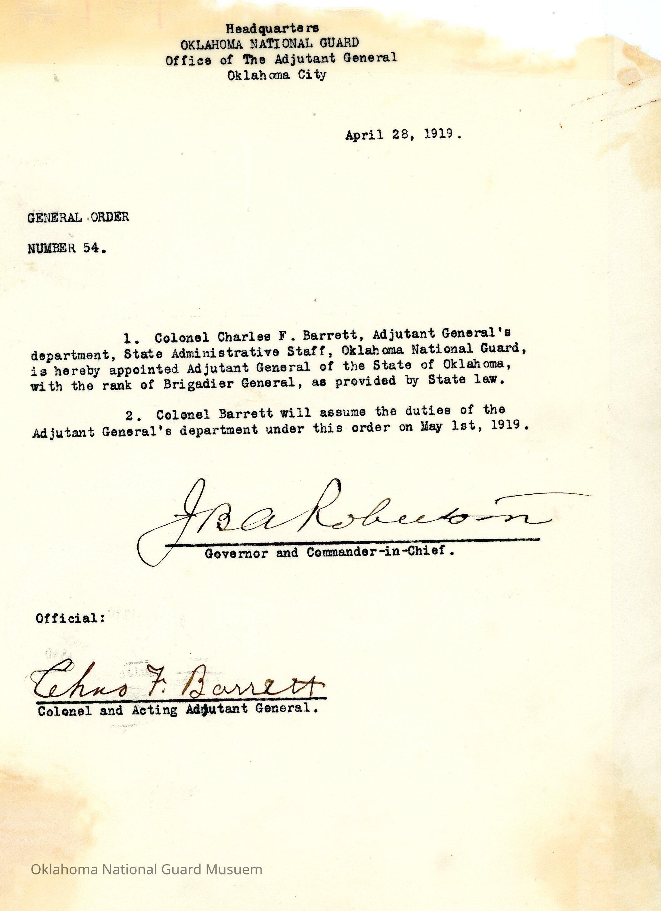 Adjutant General, Oklahoma City, James B.A. Robertson, Charles F. Barrett, Promotion