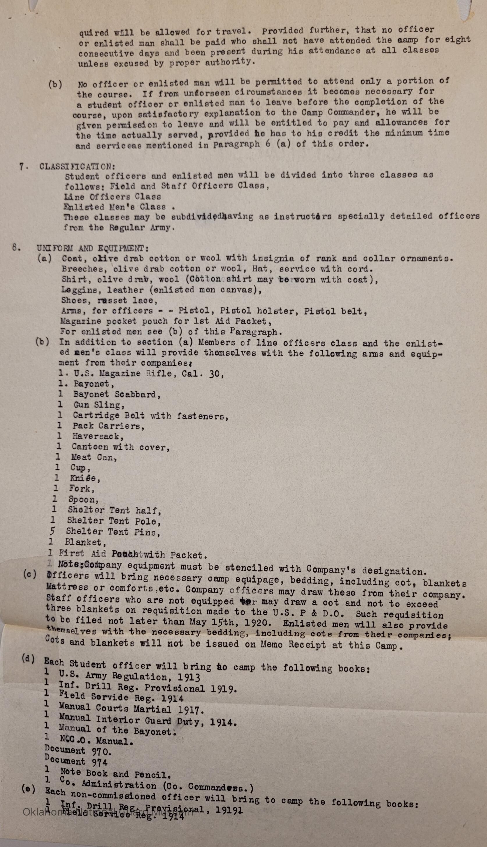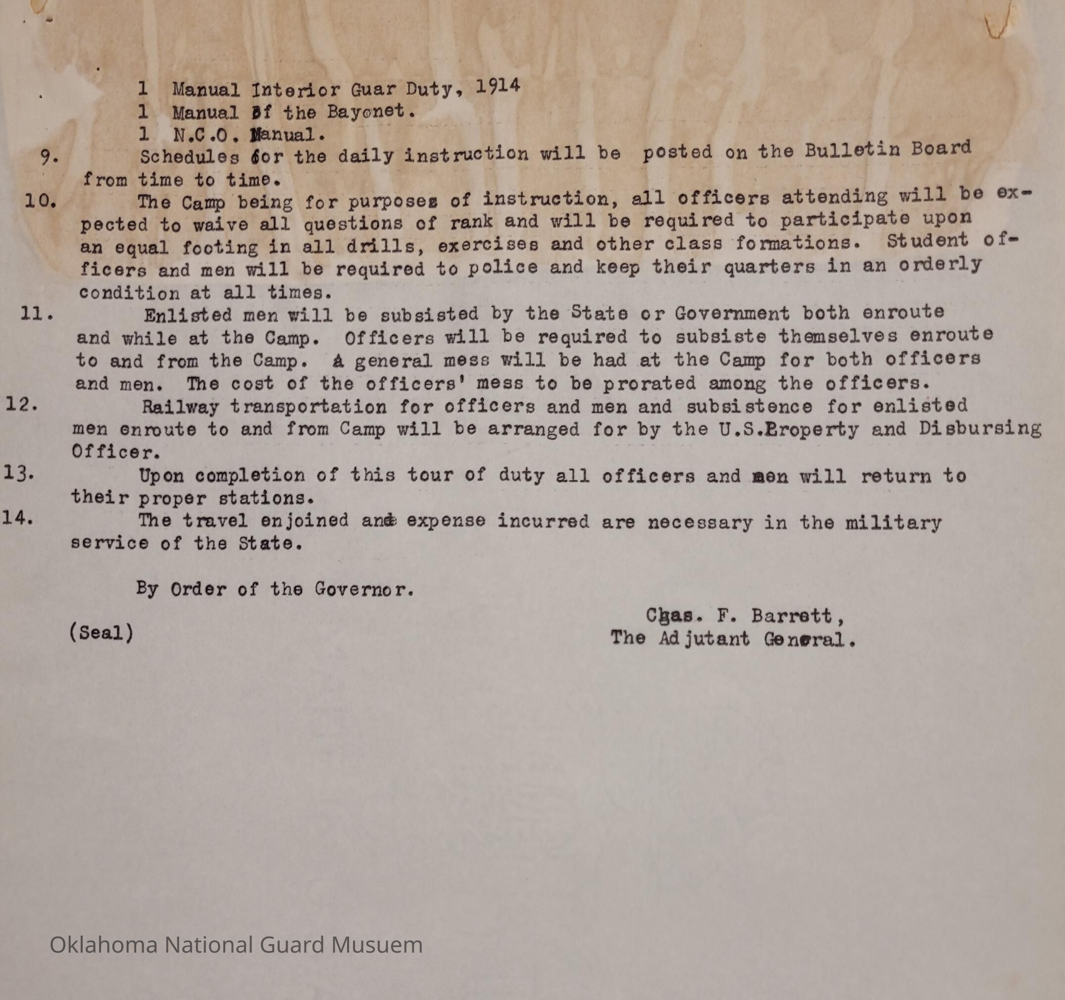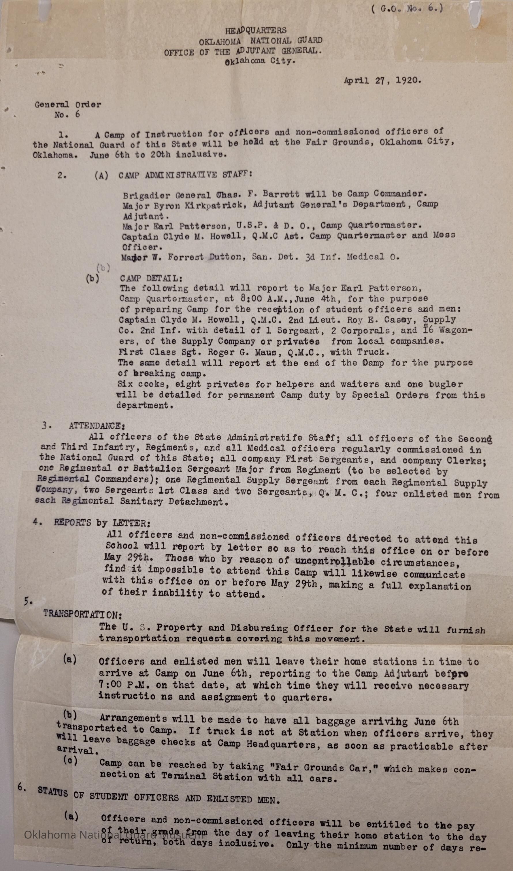 General Order #6 from Headquarters Adjutant General's Office in Oklahoma City. The order sets instructions, required attendance, transportation, uniform, and equipment requirements for officers and non-commissioned officers to attend a Camp of Instruction held at the Oklahoma City Fair Grounds.Date(s) of Creation