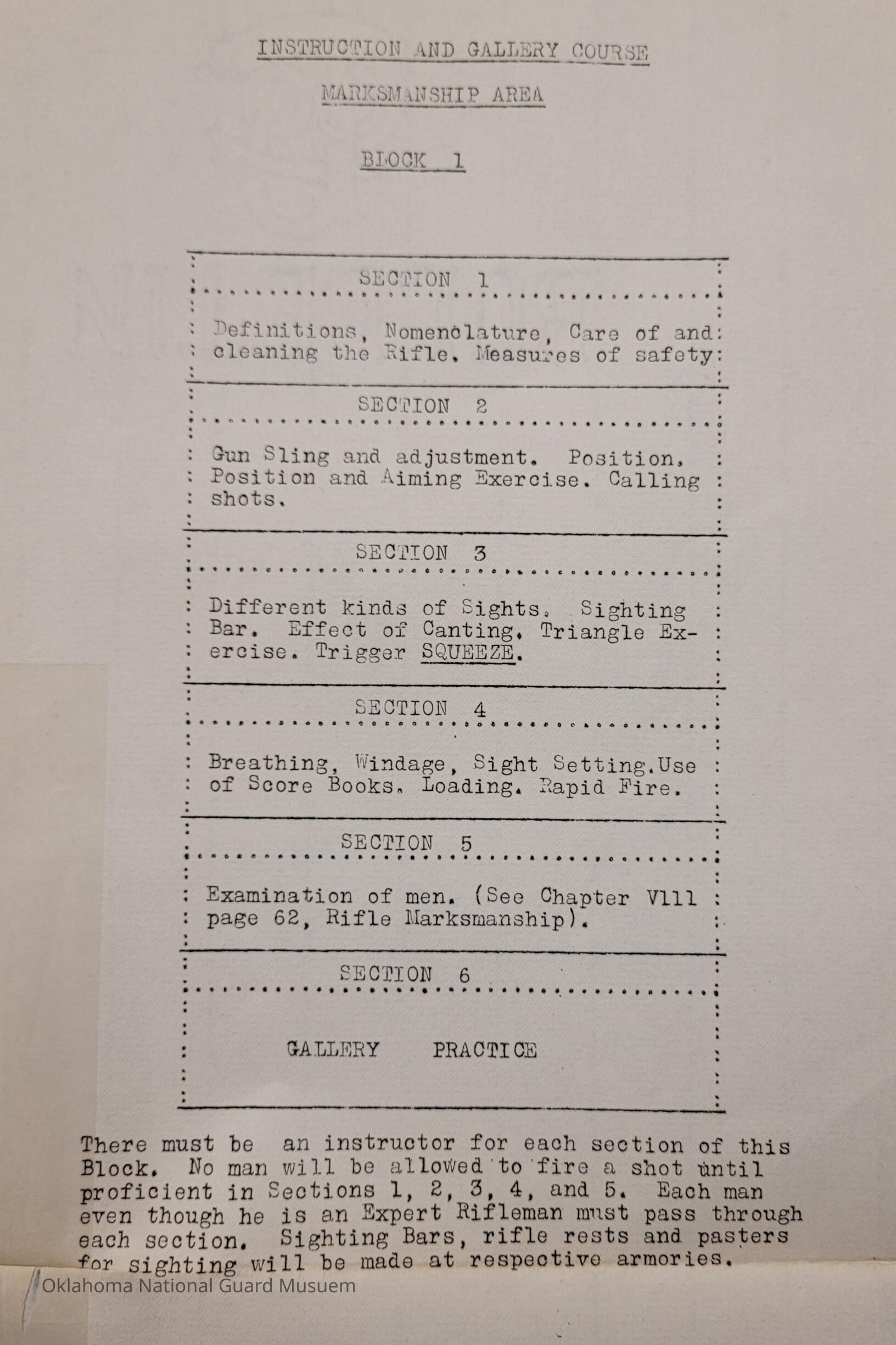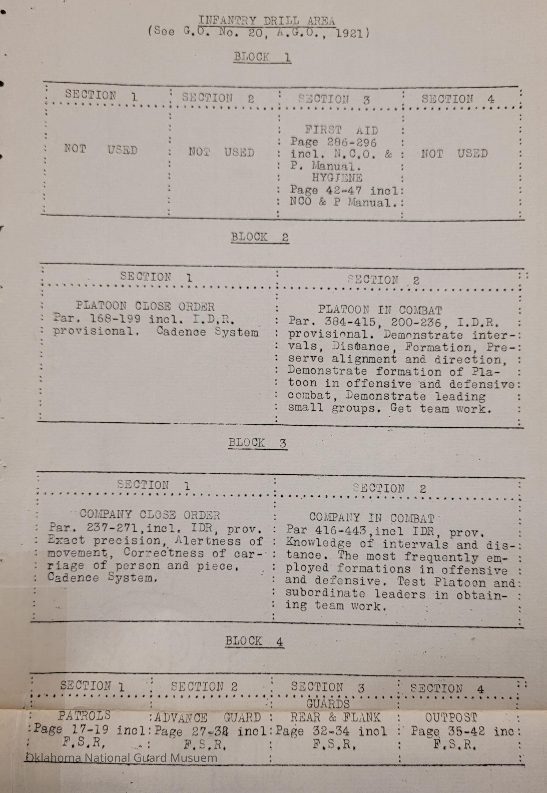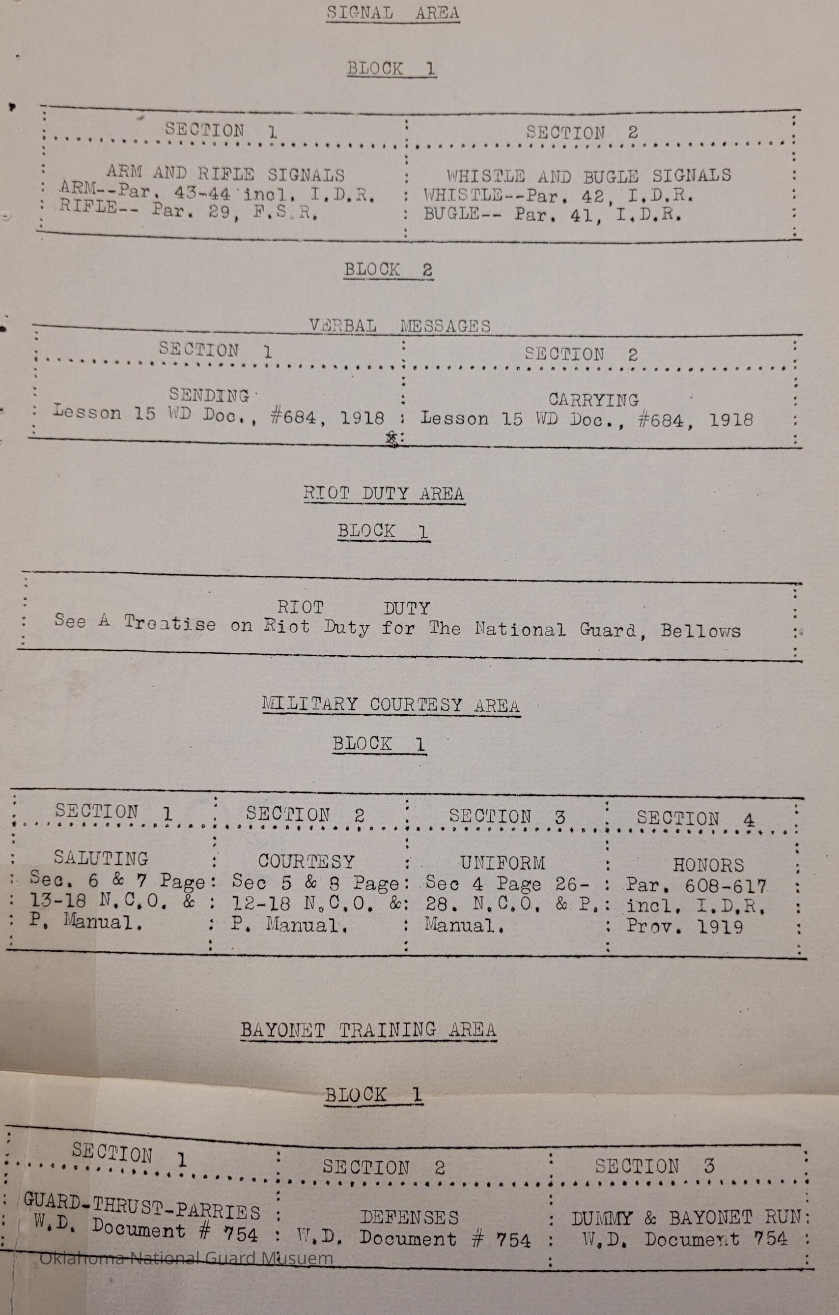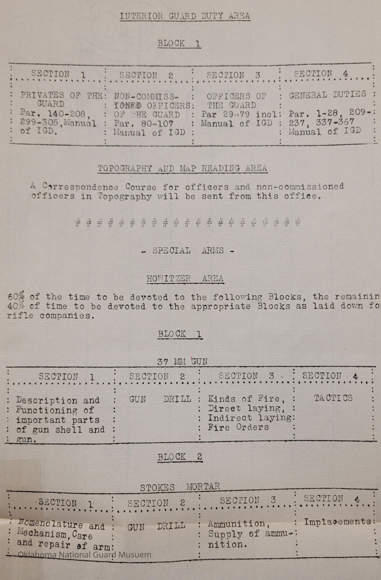General Order #6 from Headquarters Adjutant General's Office in Oklahoma City. The order details the various blocks of instruction and various areas of learning during the Annual Encampment at Fort Sill. Attached to the order are various charts showing the different blocks and what will be taught at each station.Date(s) of Creation
