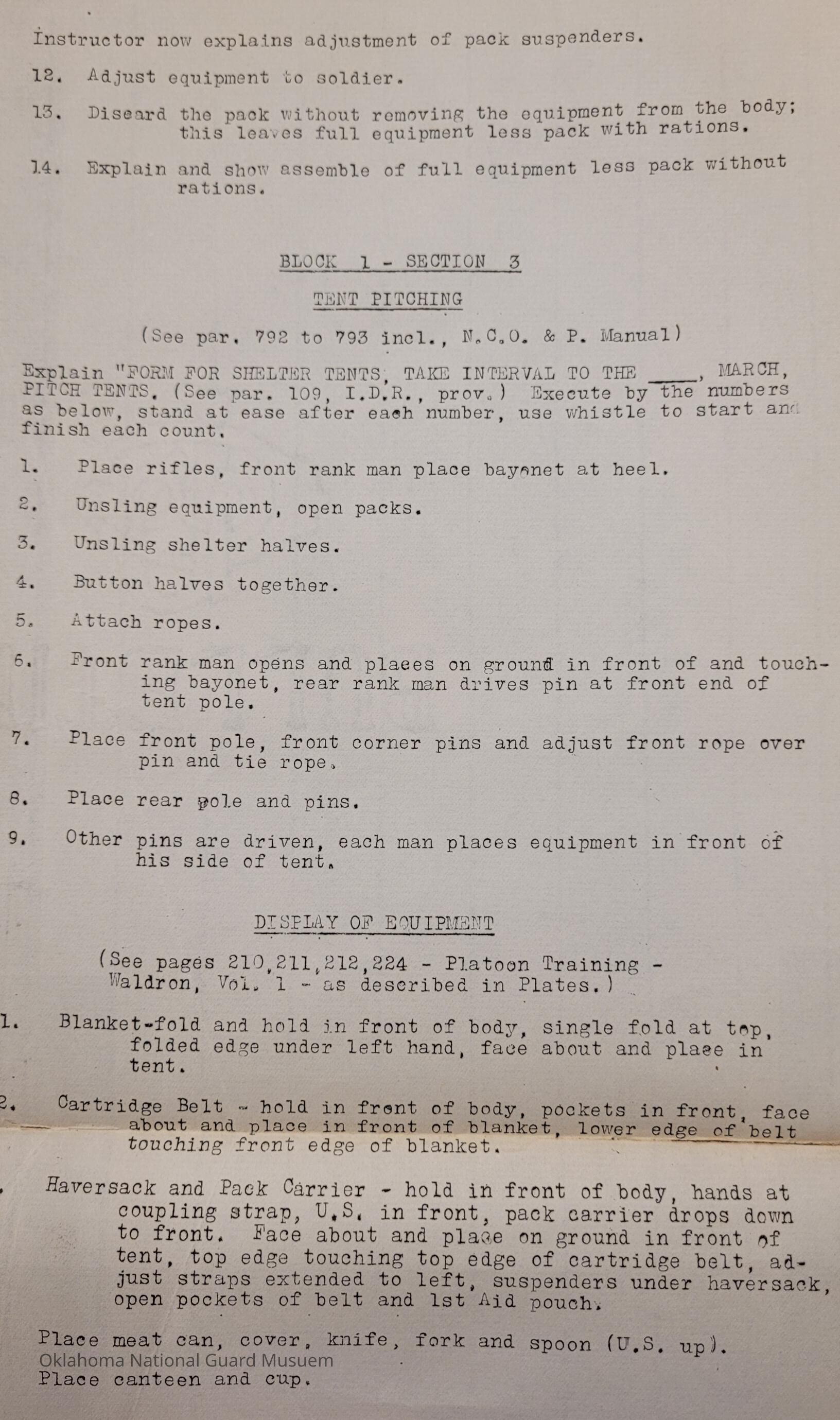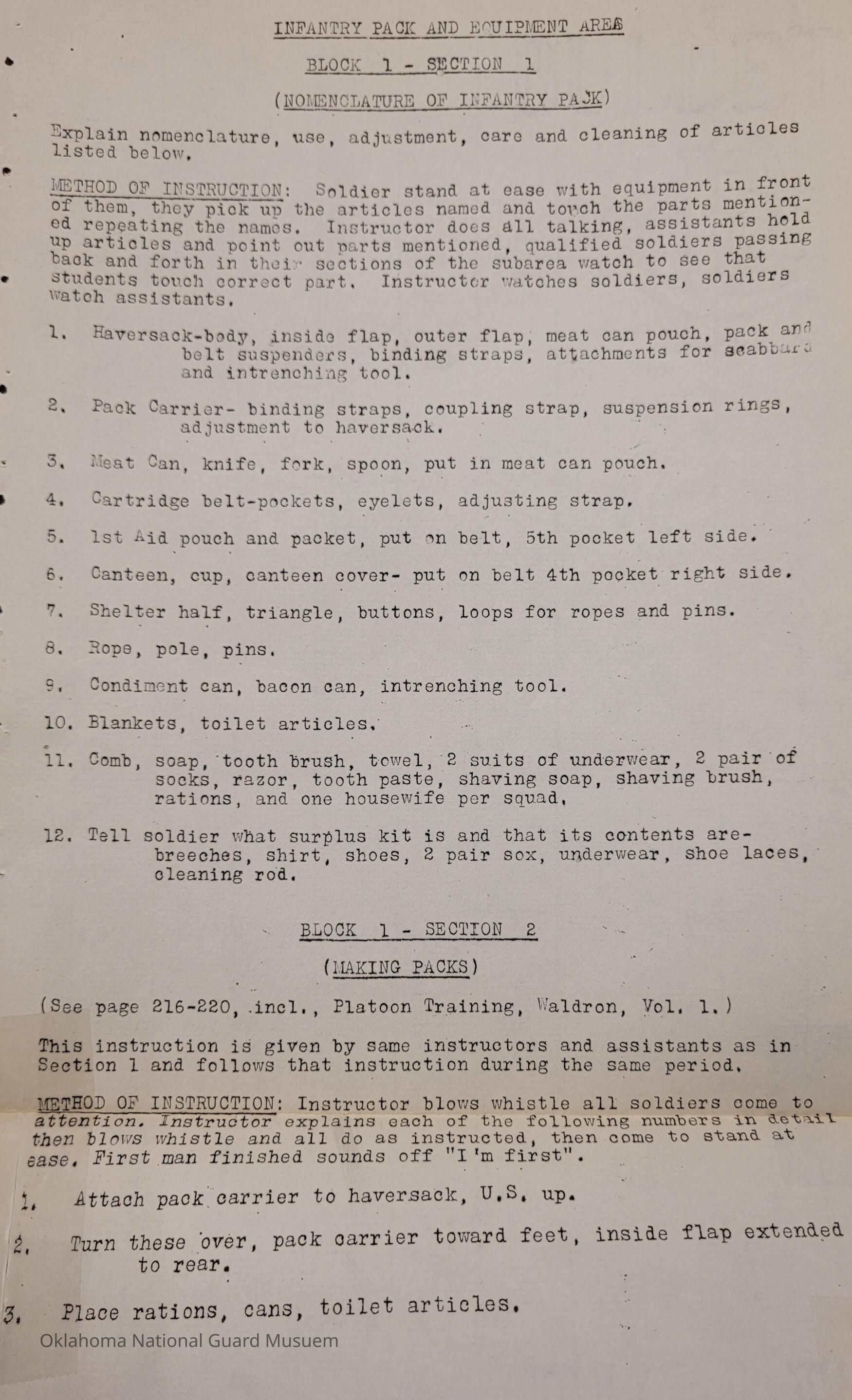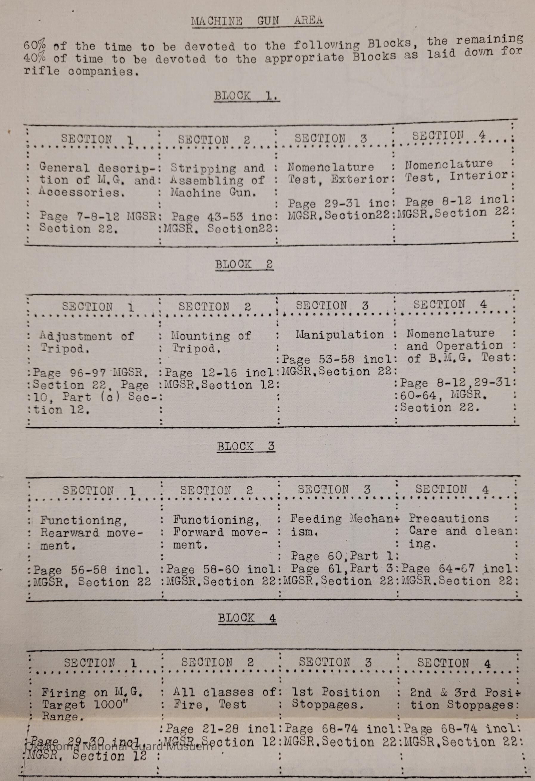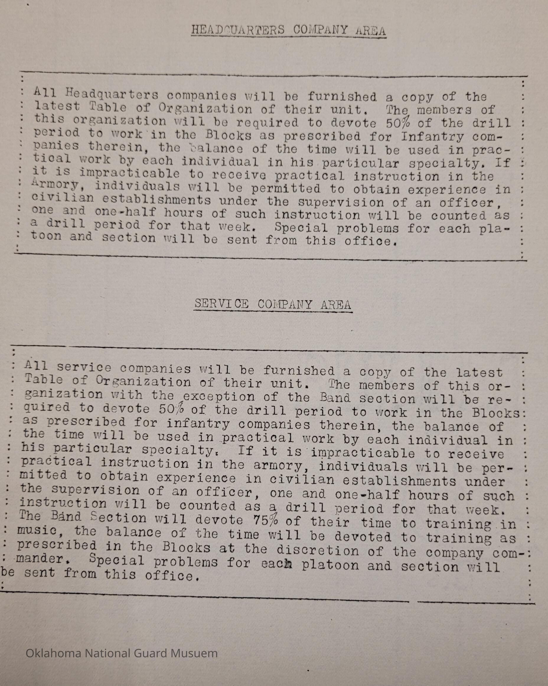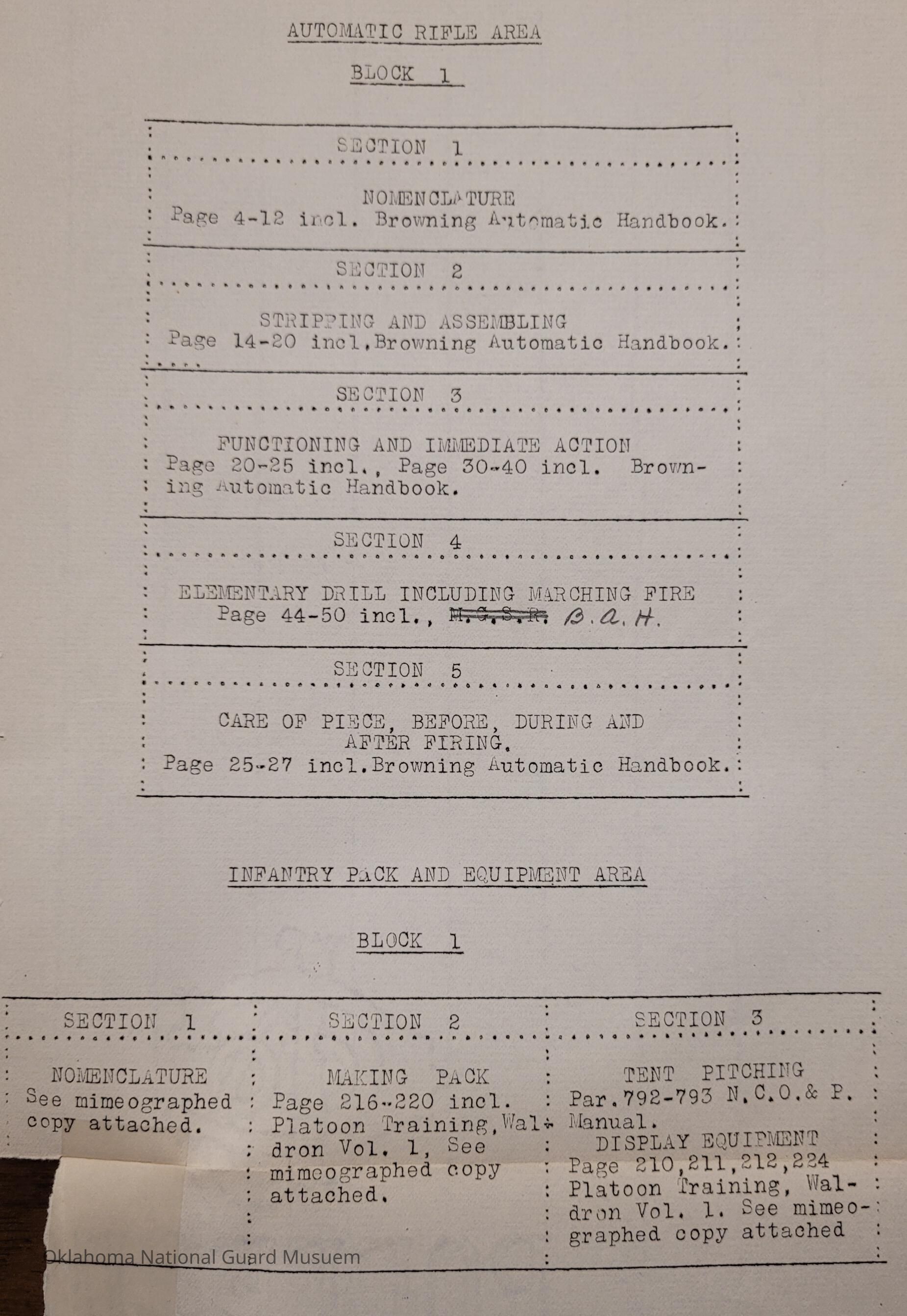 General Order #6 from Headquarters Adjutant General's Office in Oklahoma City. The order details the various blocks of instruction and various areas of learning during the Annual Encampment at Fort Sill. Attached to the order are various charts showing the different blocks and what will be taught at each station.Date(s) of Creation