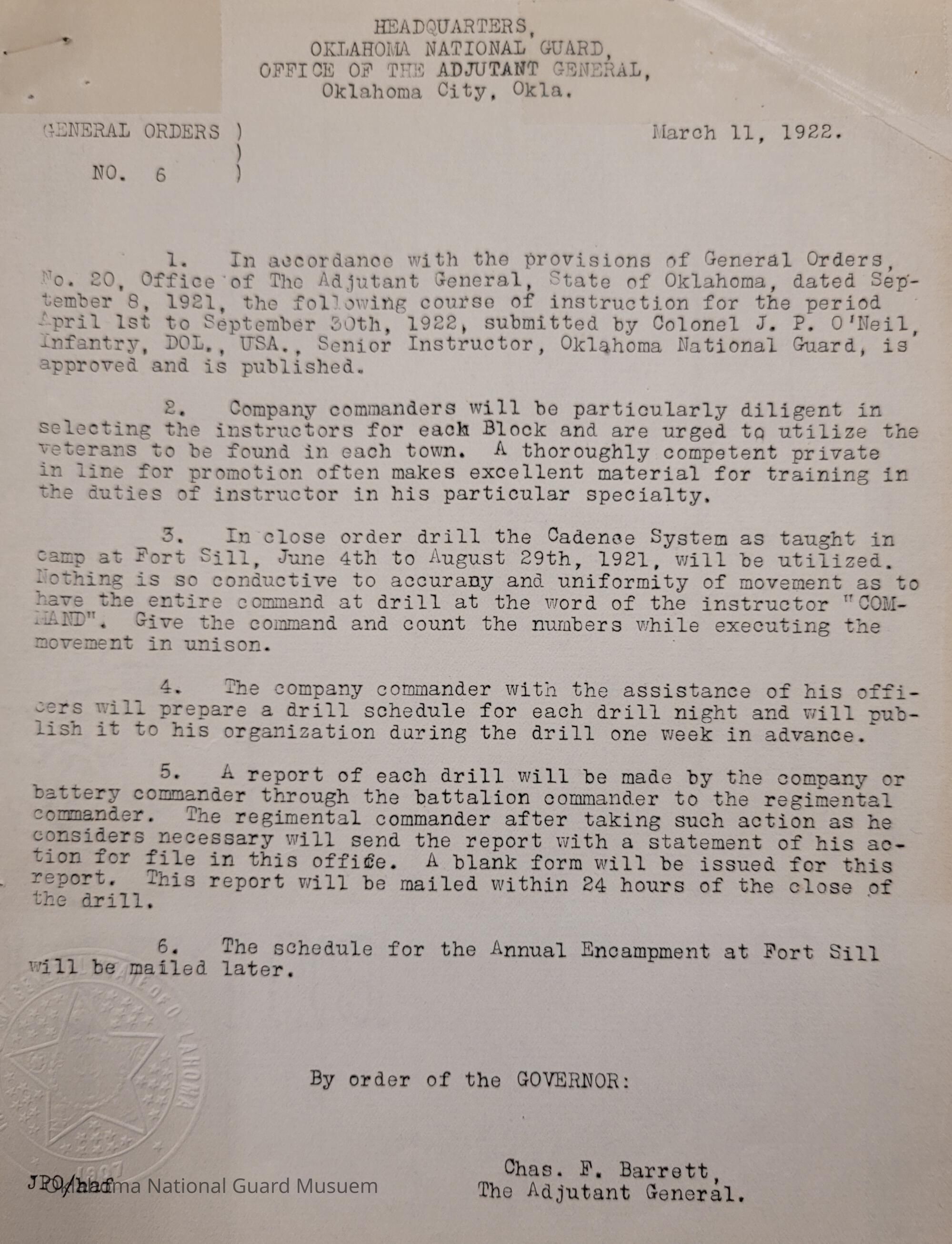 Adjutant General, Oklahoma City, Charles F. Barrett, J.P. O'Neil, Cadence System, Fort Sill, Drill, Regulations
