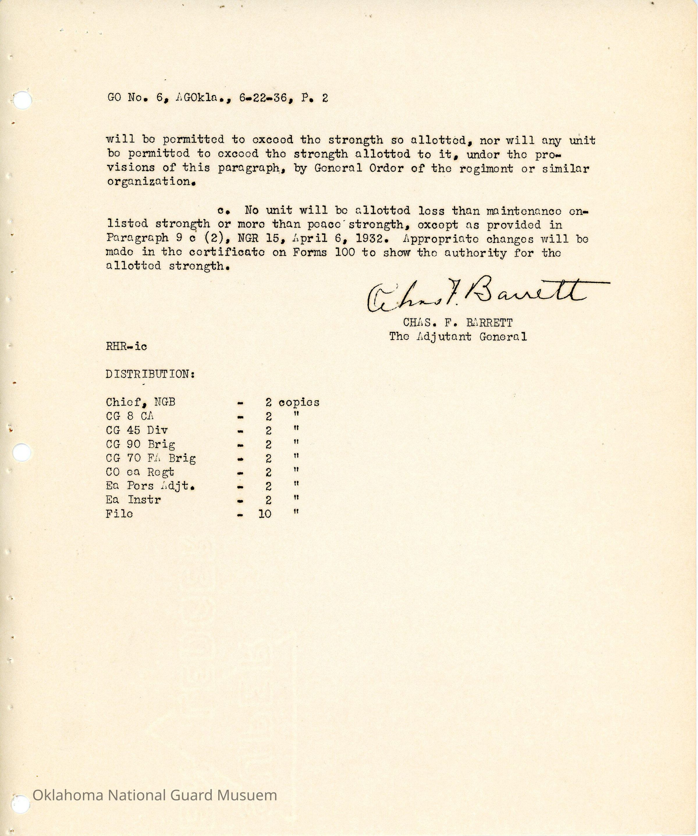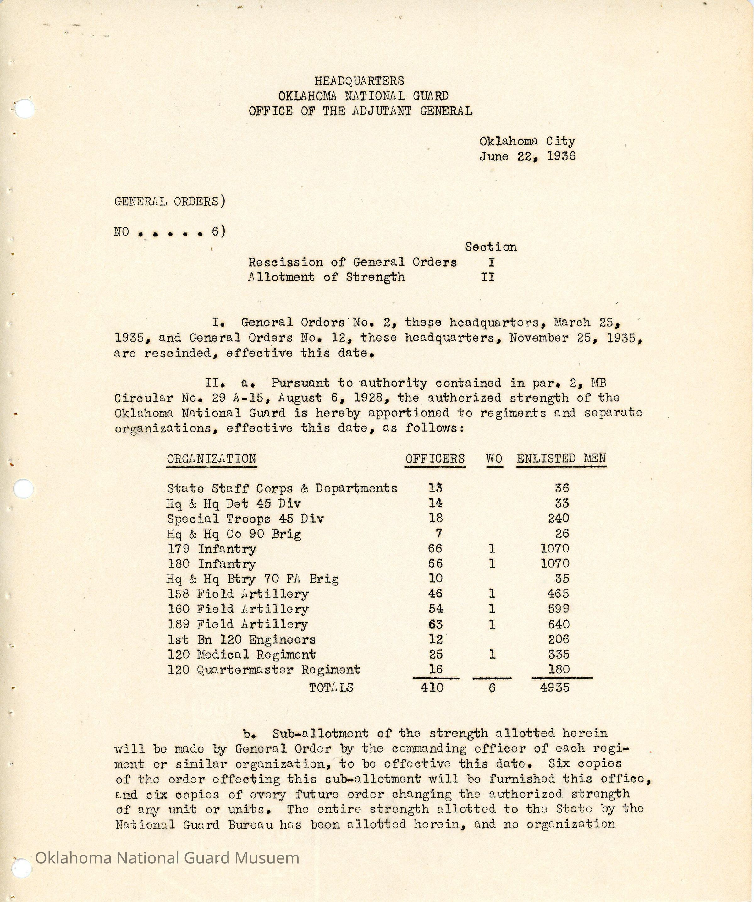 General Order #6 from Headquarters Adjutant General's Office in Oklahoma City. The order establishes the total allotted strength for the Oklahoma National Guard. Rescinds General Order #2 1935 and General Order #12 1935Date(s) of Creation
