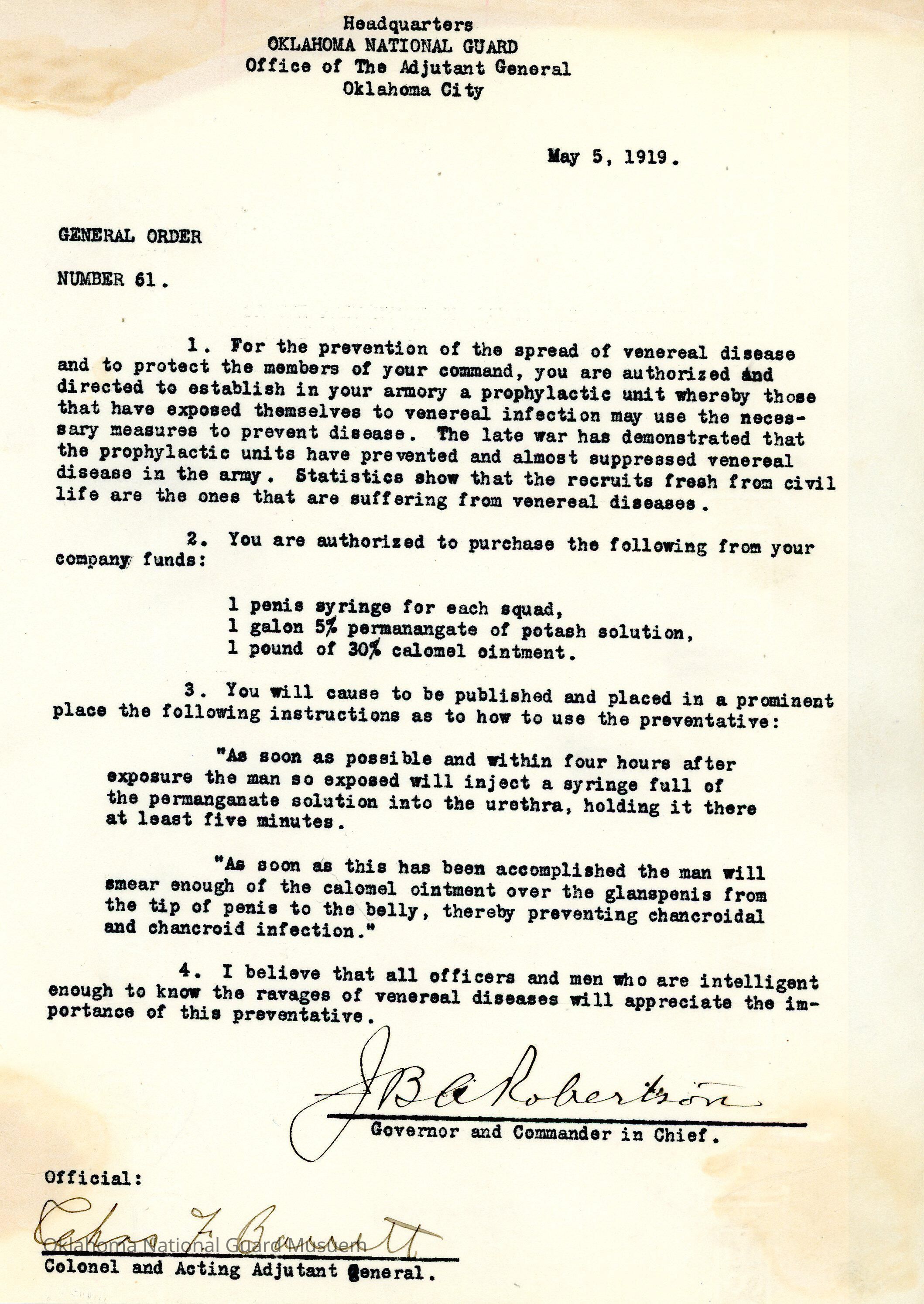 General Order #61 from Headquarters Adjutant General's Office in Oklahoma City. The order gives guidance and the proper procedure to treat venereal disease. It also establishes a prophylactic unit in the local armories.Date(s) of Creation