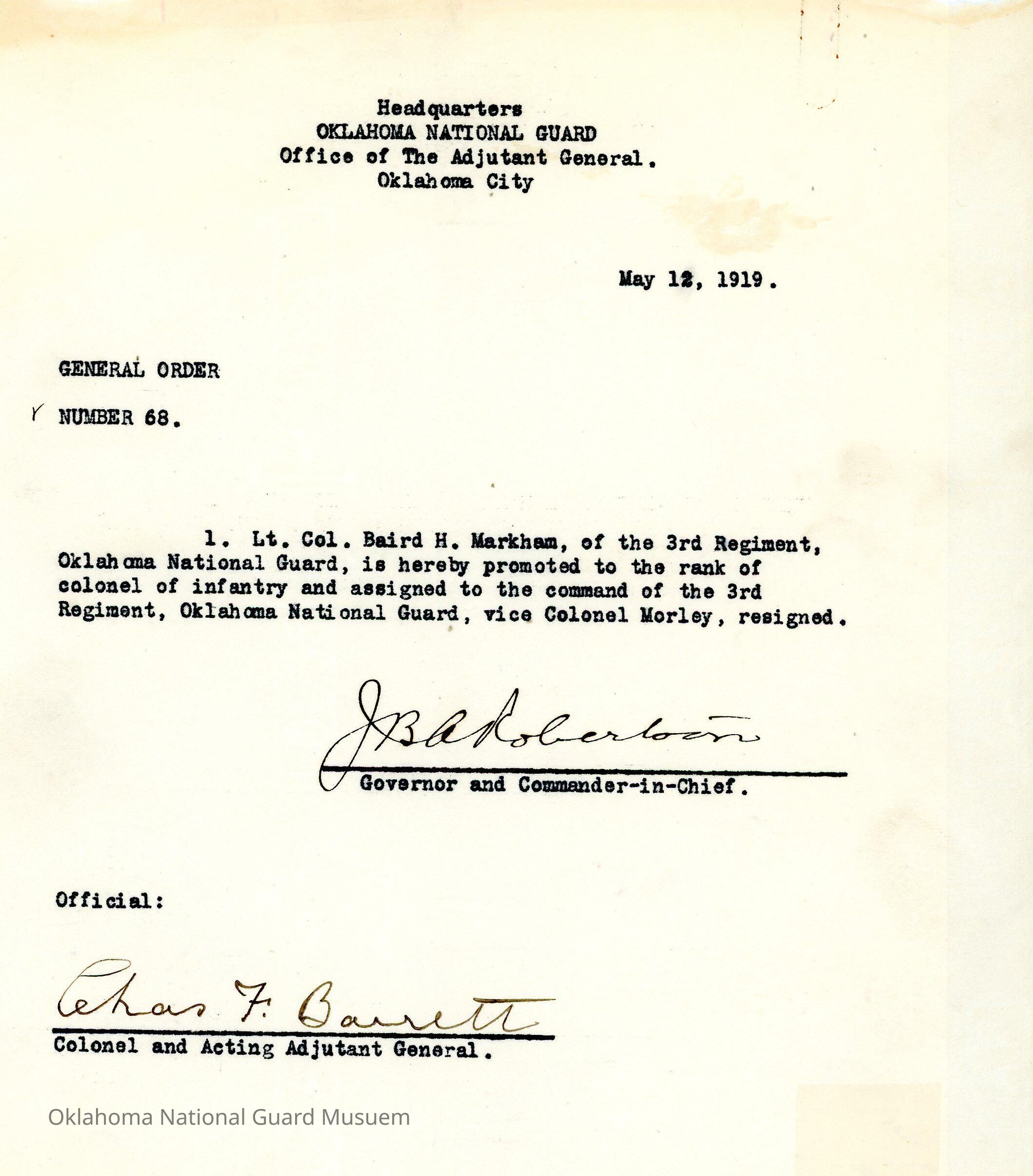 Adjutant General, Oklahoma City, James B.A. Robertson, Charles F. Barrett, Promotion, Baird H. Marrkham, Third Regiment
