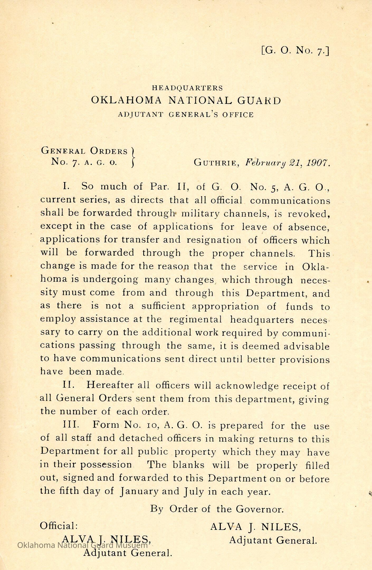 General Order #7 from Headquarters Adjutant General's Office in Guthrie. The order rescinds paragraph two of General Order #5 1907 regarding all communication having to go through military channels. All officers will acknowledge receipt of all General Orders giving the number of each order.Date(s) of Creation