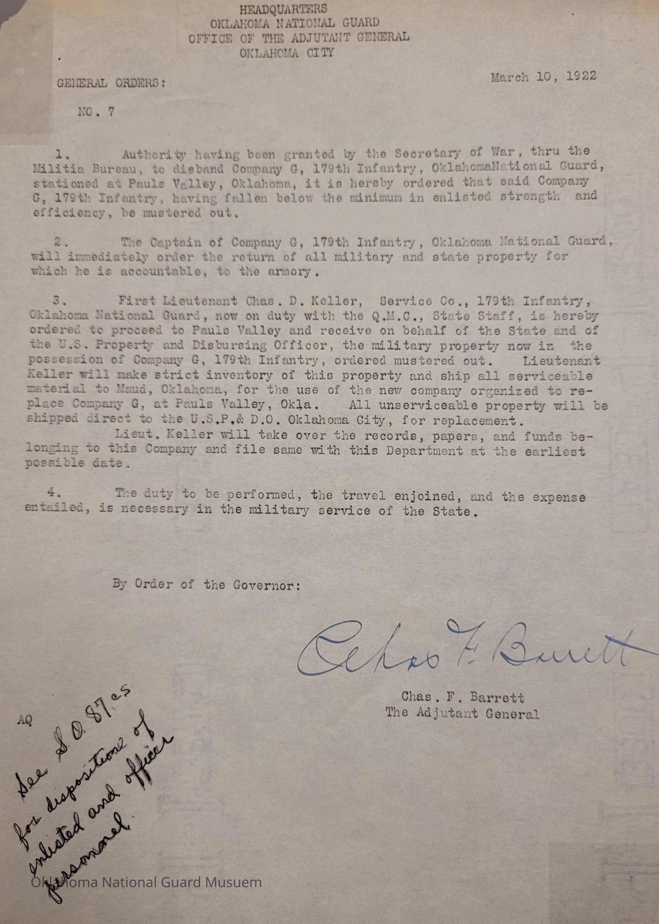 General Order #7 from Headquarters Adjutant General's Office in Oklahoma City. The order disbands Company G 179th Infantry stationed at Pauls Valley. Charles D. Keller is ordered to Pauls Valley to receive the military property and ship all serviceable material to Maud for the new company organized to replace Company G.Date(s) of Creation