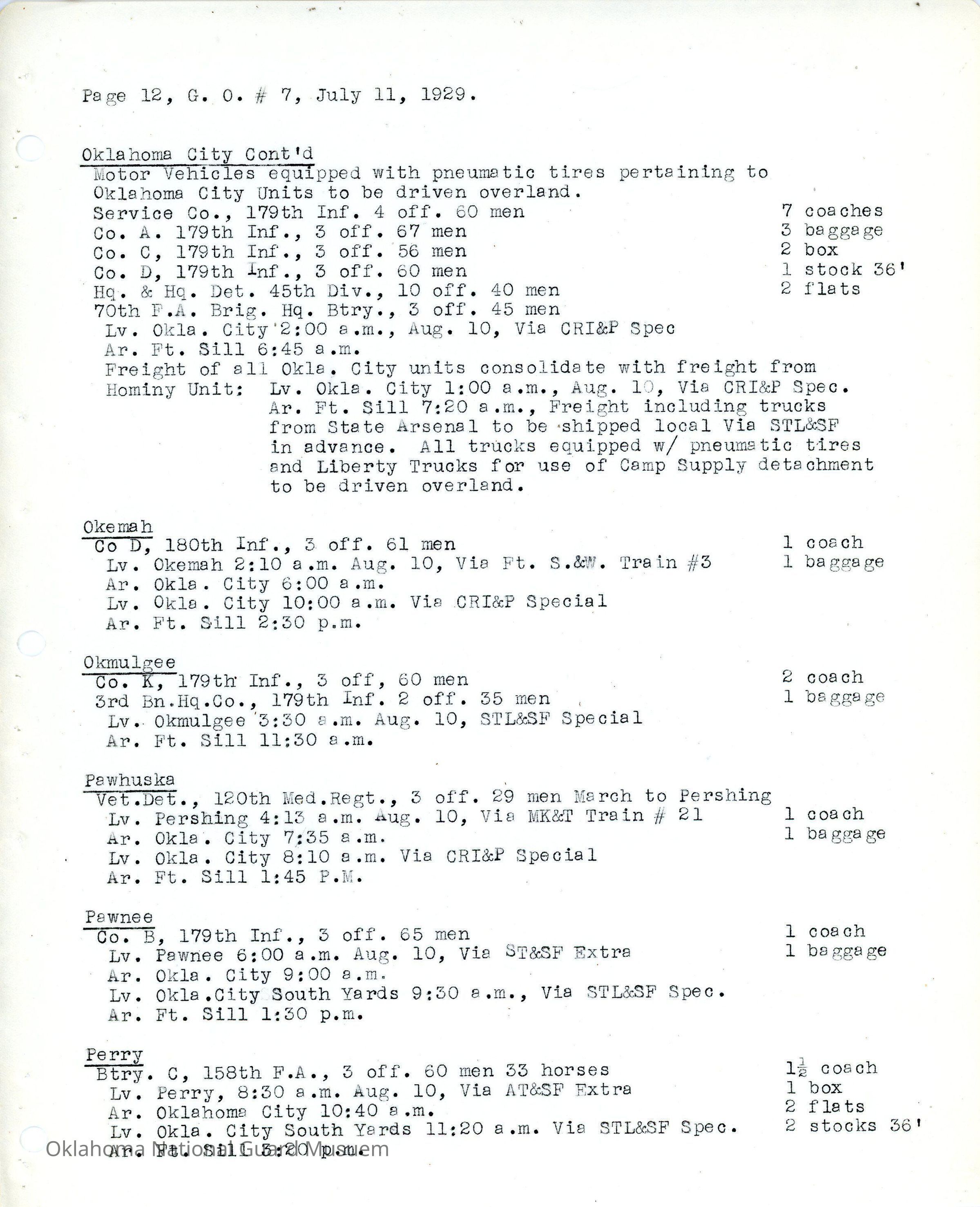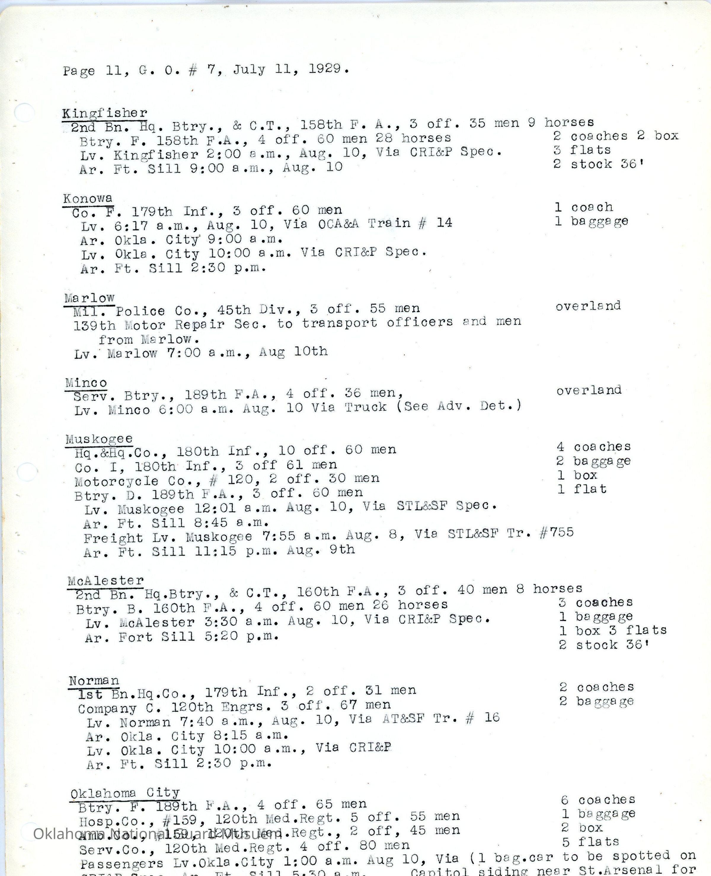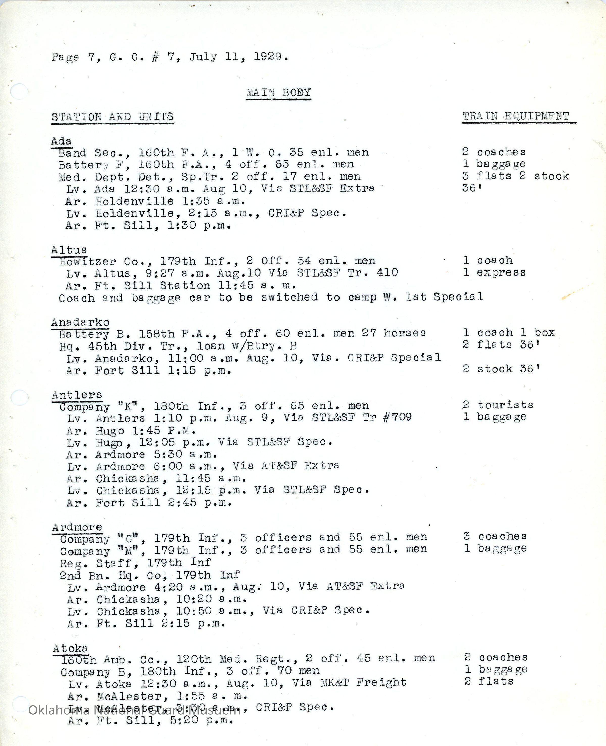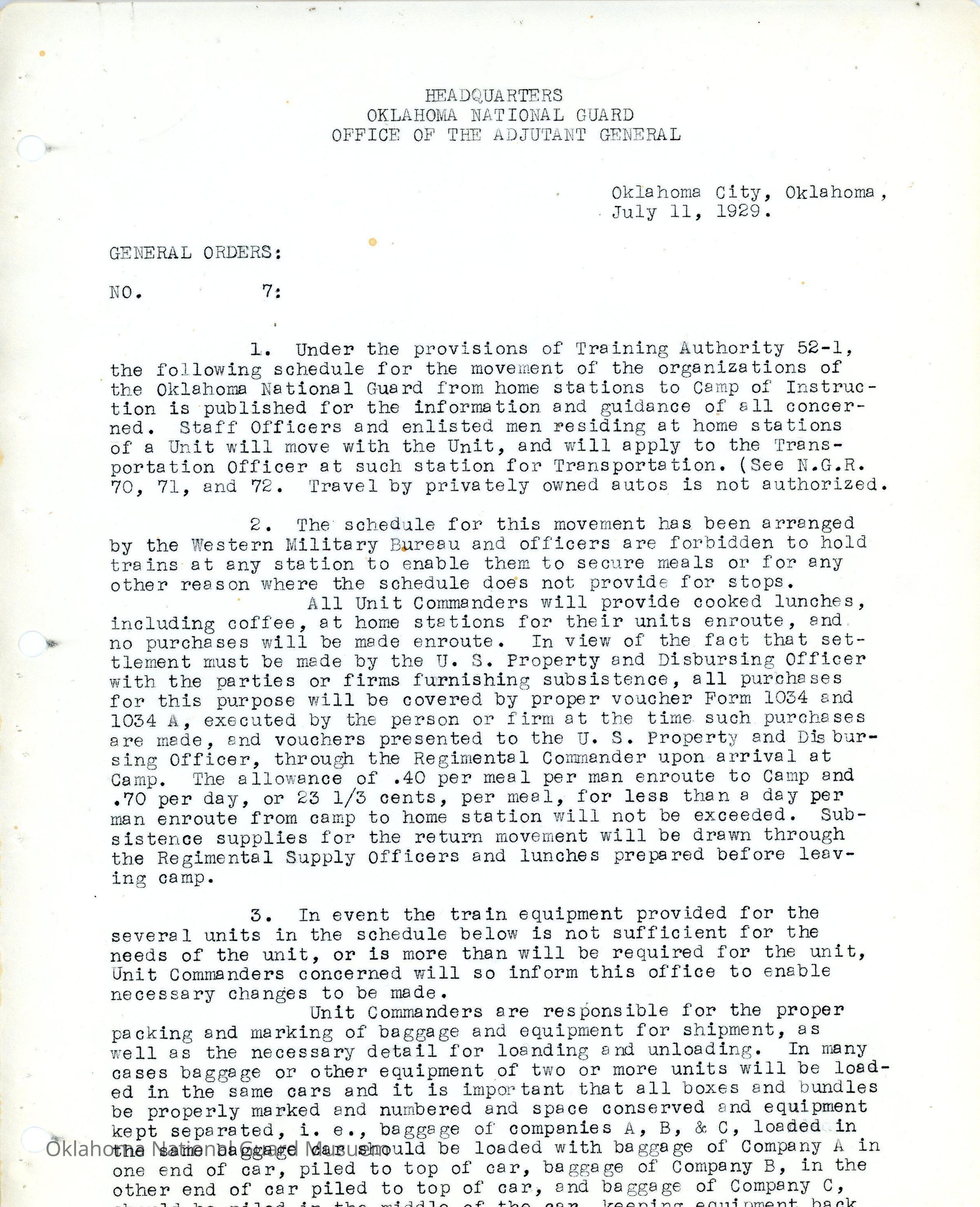 General Order #7 from Headquarters Adjutant General's Office in Oklahoma City. The order details the schedule of transportation from home stations to Fort Sill for the Camp of Instruction.Date(s) of Creation